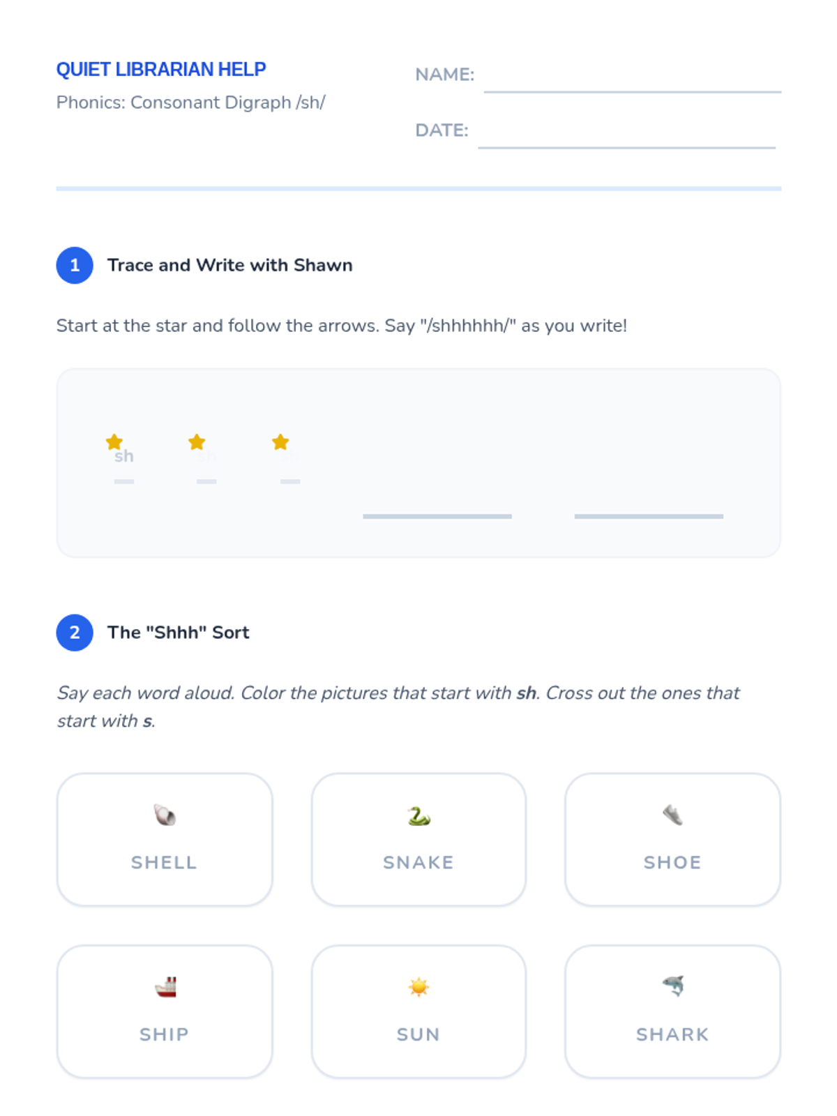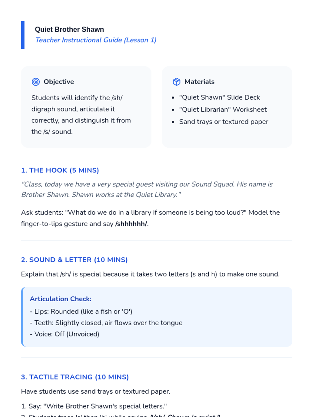 This Kindergarten ELA sequence introduces students to consonant digraphs (sh, ch, th, wh) through the 'H-Brothers' narrative. Students move from auditory awareness to visual recognition and decoding in context using multisensory activities.