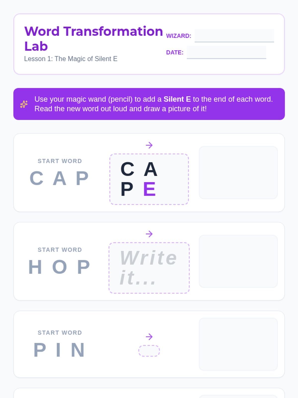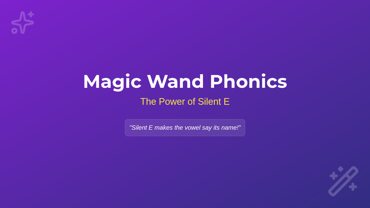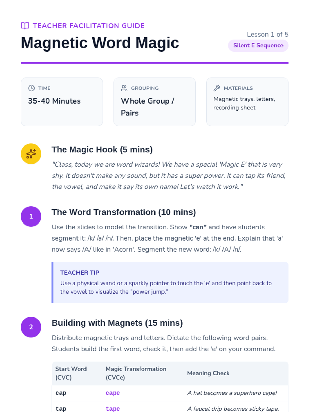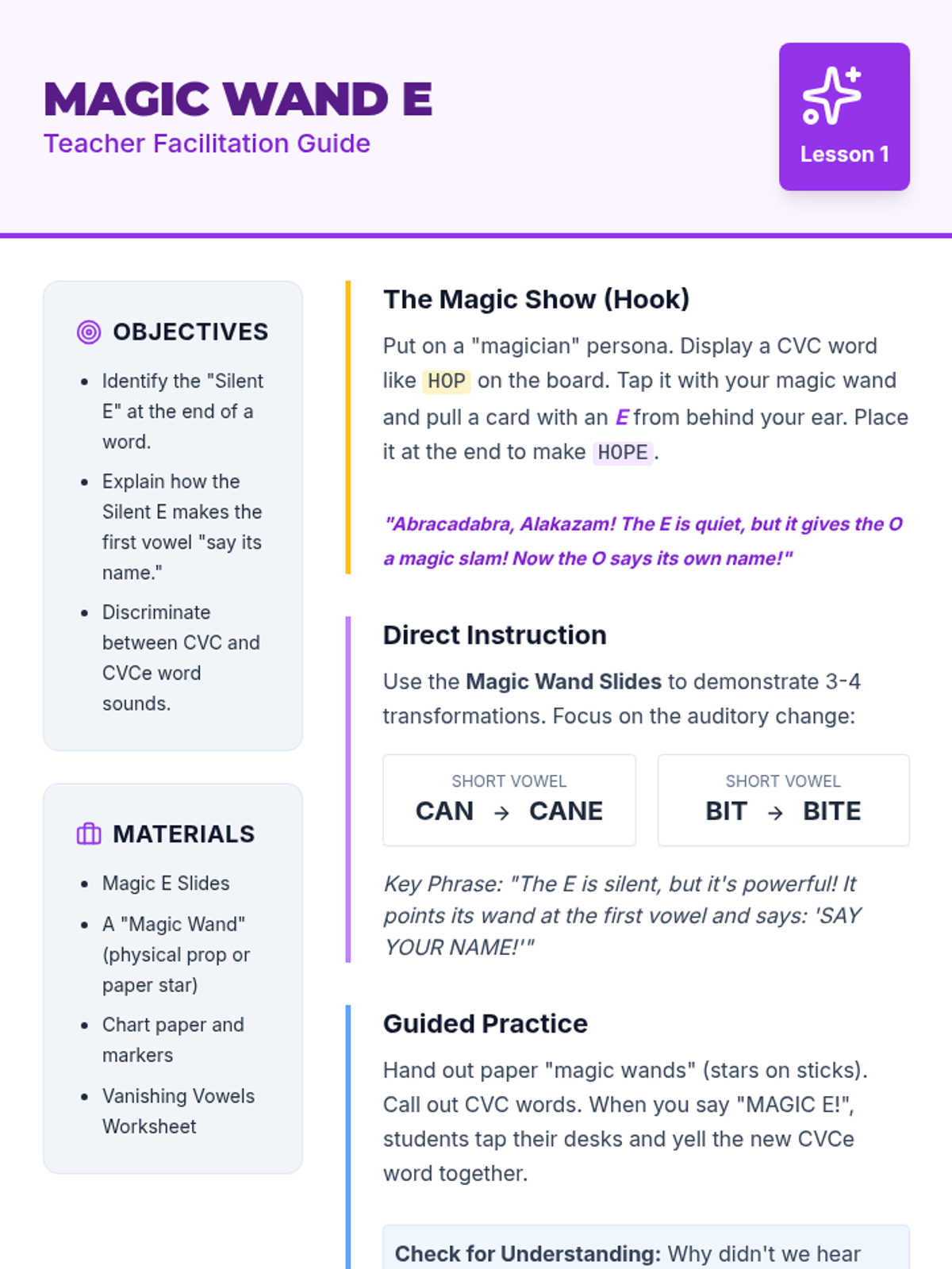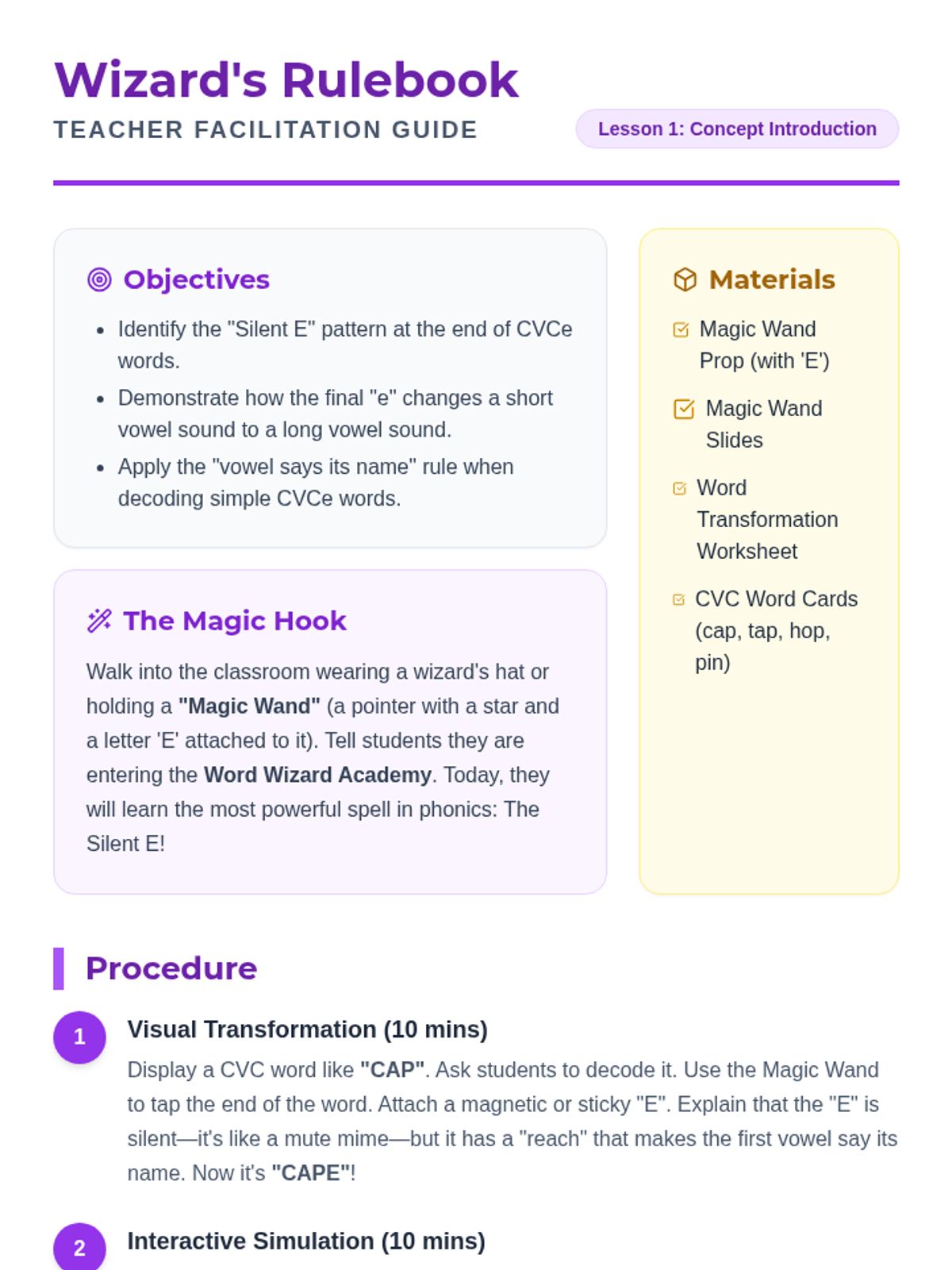Students explore the 'Silent E' (CVCe) rule through a 'Word Wizard' theme, transforming short vowel words into long vowel words. The sequence covers concept introduction, specific vowel patterns (a, i, o, u), fluency practice, and creative writing application.