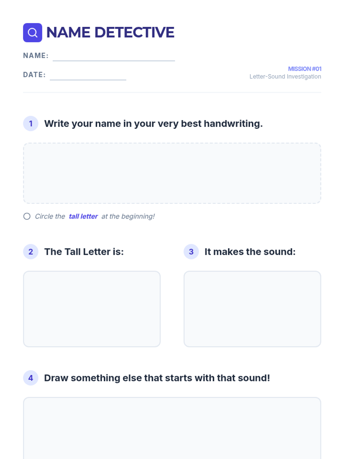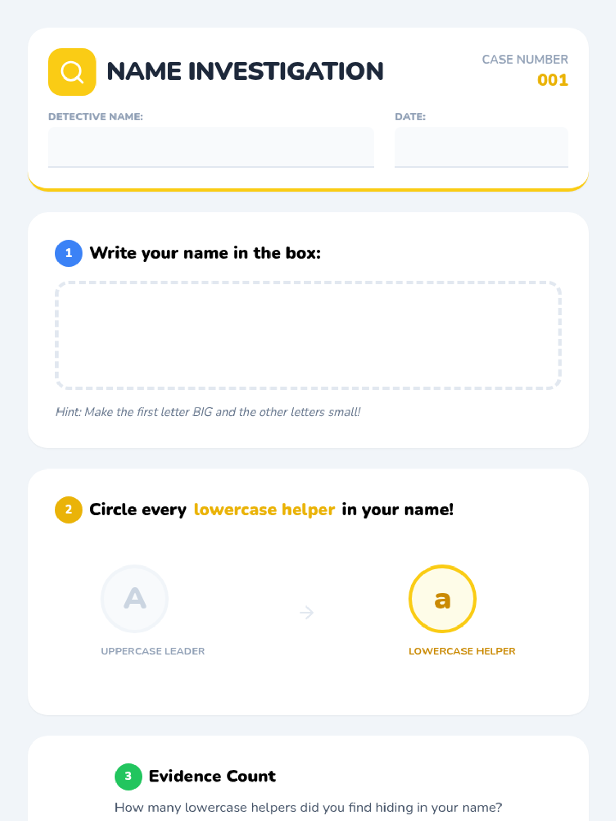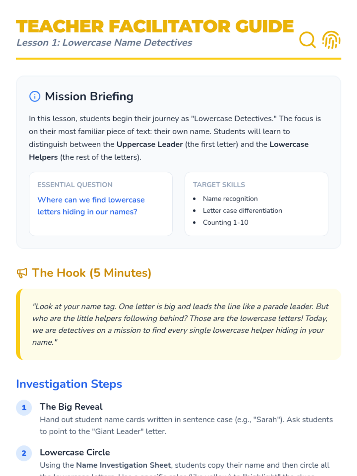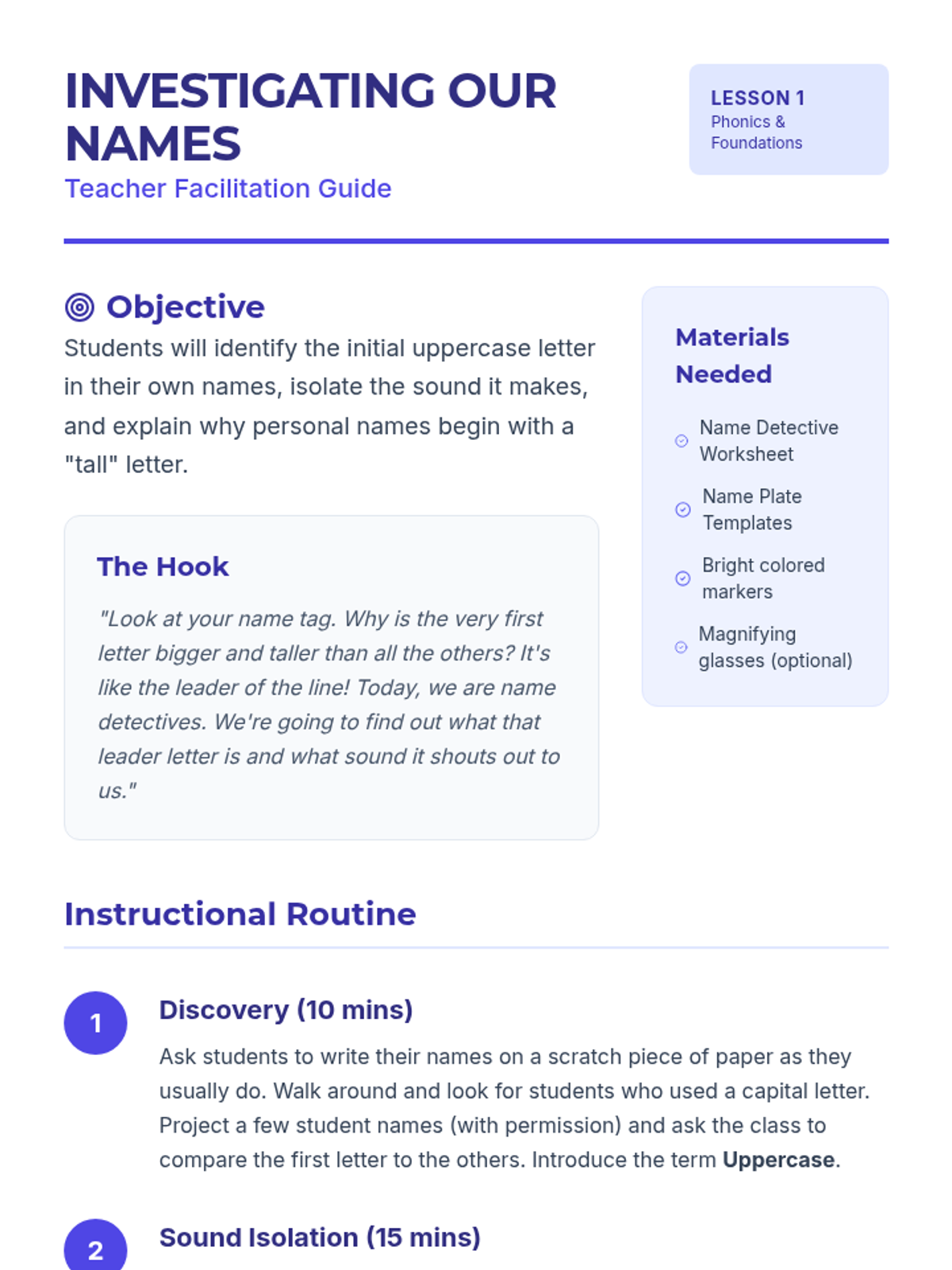 This inquiry-based sequence explores uppercase letters within the context of names, environmental print, and sentence structure. Students act as 'Letter Detectives' to discover the roles of capital letters and their corresponding sounds in real-world texts.
