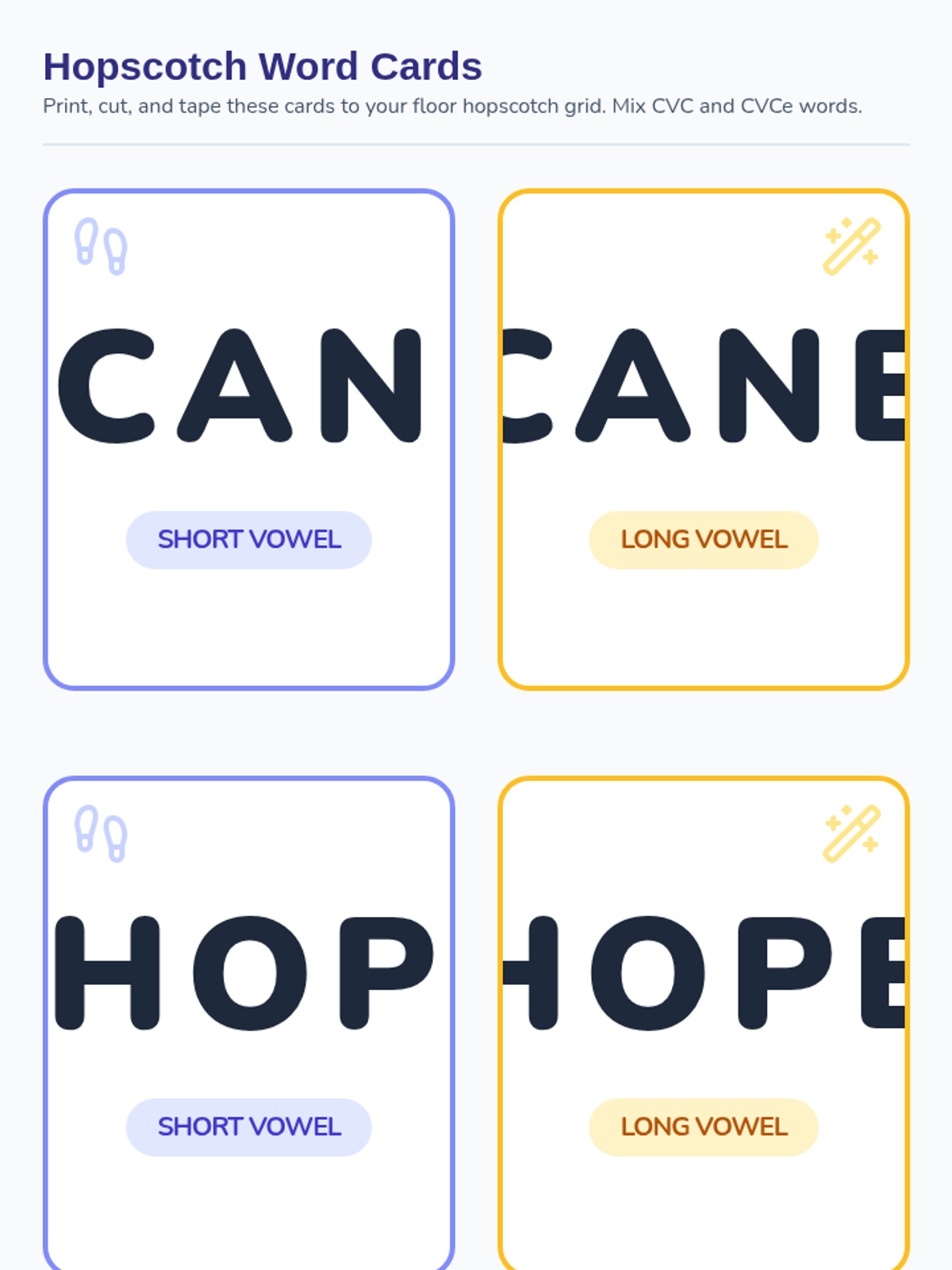 A game-based phonics sequence for Kindergarten students focusing on distinguishing short vowel sounds from long vowel sounds created by the 'Magic E'. Students engage in gross motor activities, scavenger hunts, and collaborative games to build decoding fluency.