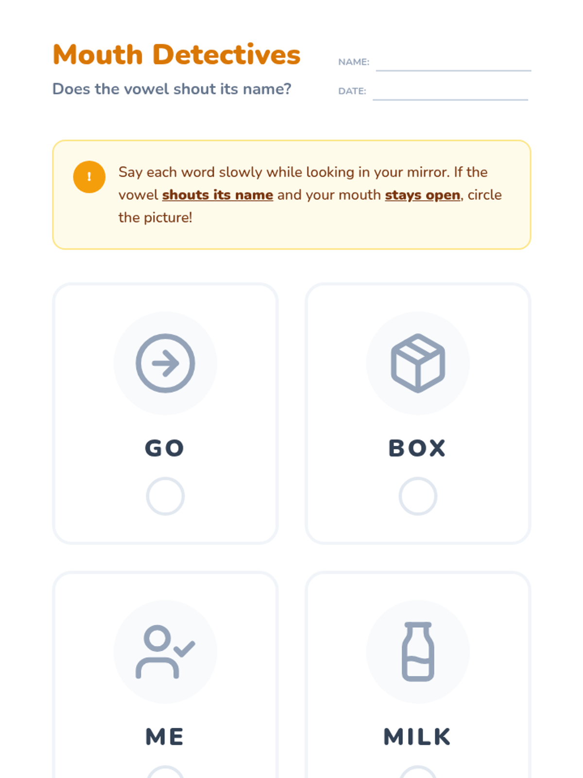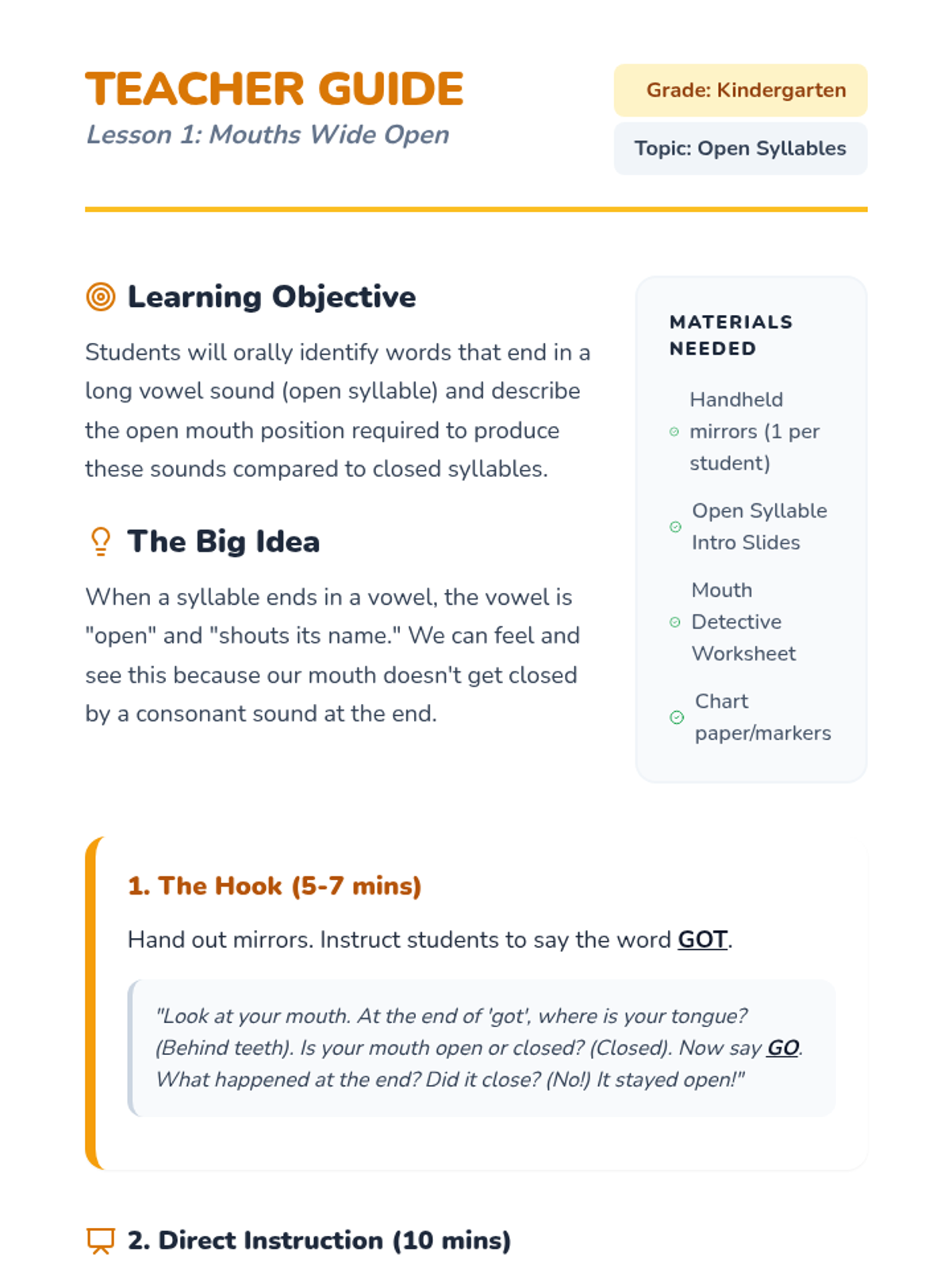 A Kindergarten phonics sequence focusing on open syllables (go, me, hi). Students learn to identify the 'open' mouth shape of long vowel sounds and map these sounds to letters in high-frequency words through sorting, mapping, and games.