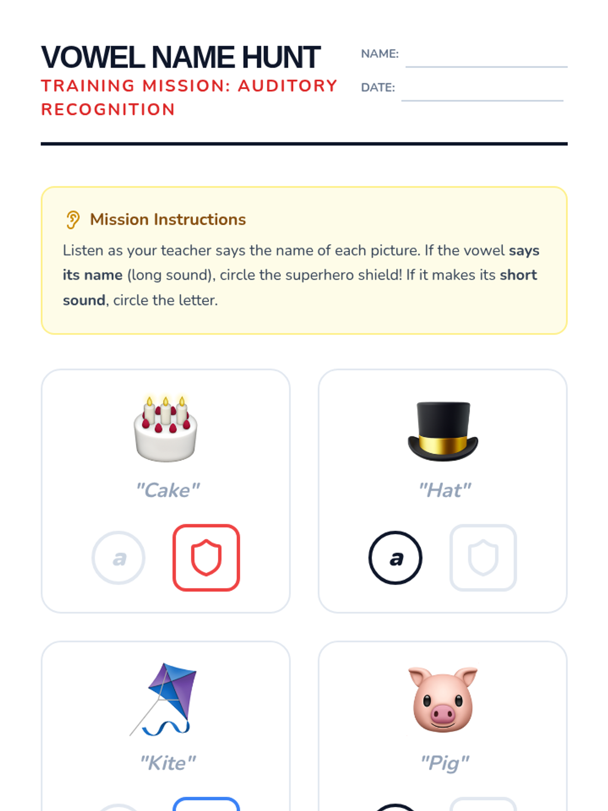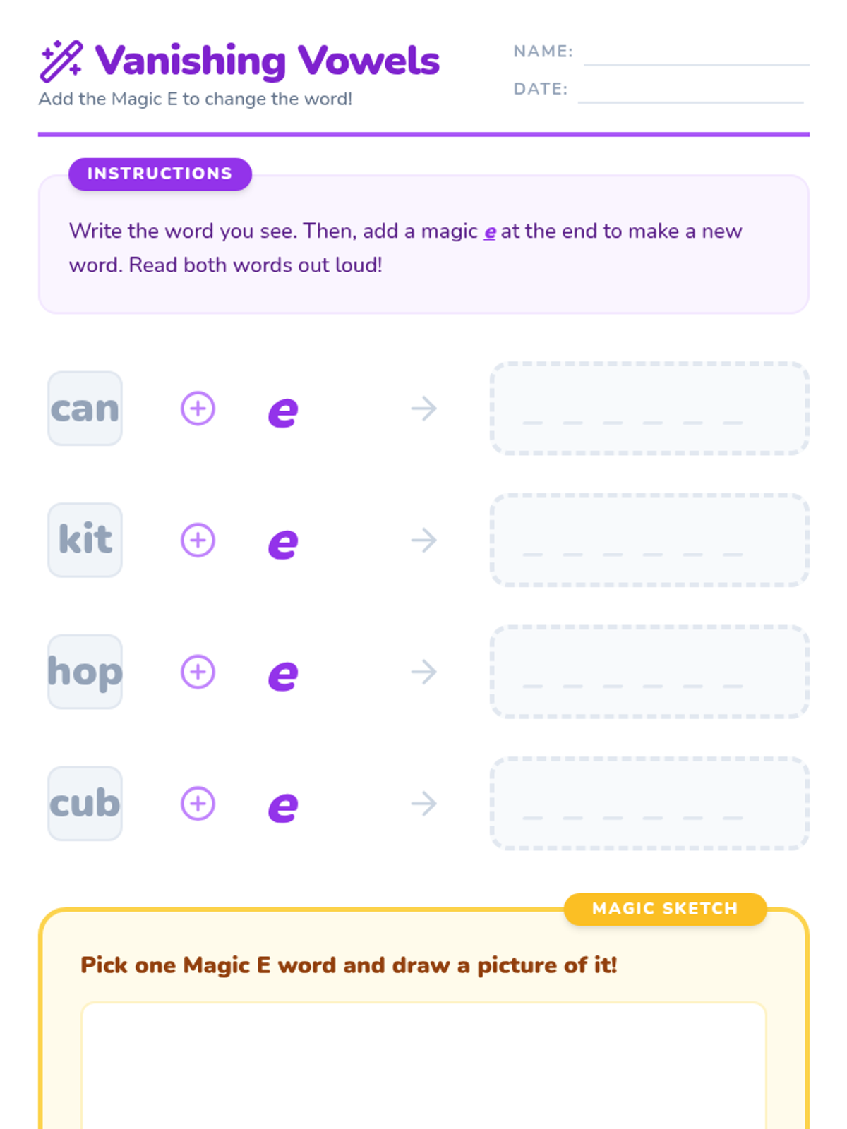 This Kindergarten ELA sequence introduces students to long vowel sounds and the 'Silent E' (CVCe) rule through an inquiry-based superhero and magic theme. Students move from auditory recognition of vowels 'saying their names' to decoding and writing CVCe words.