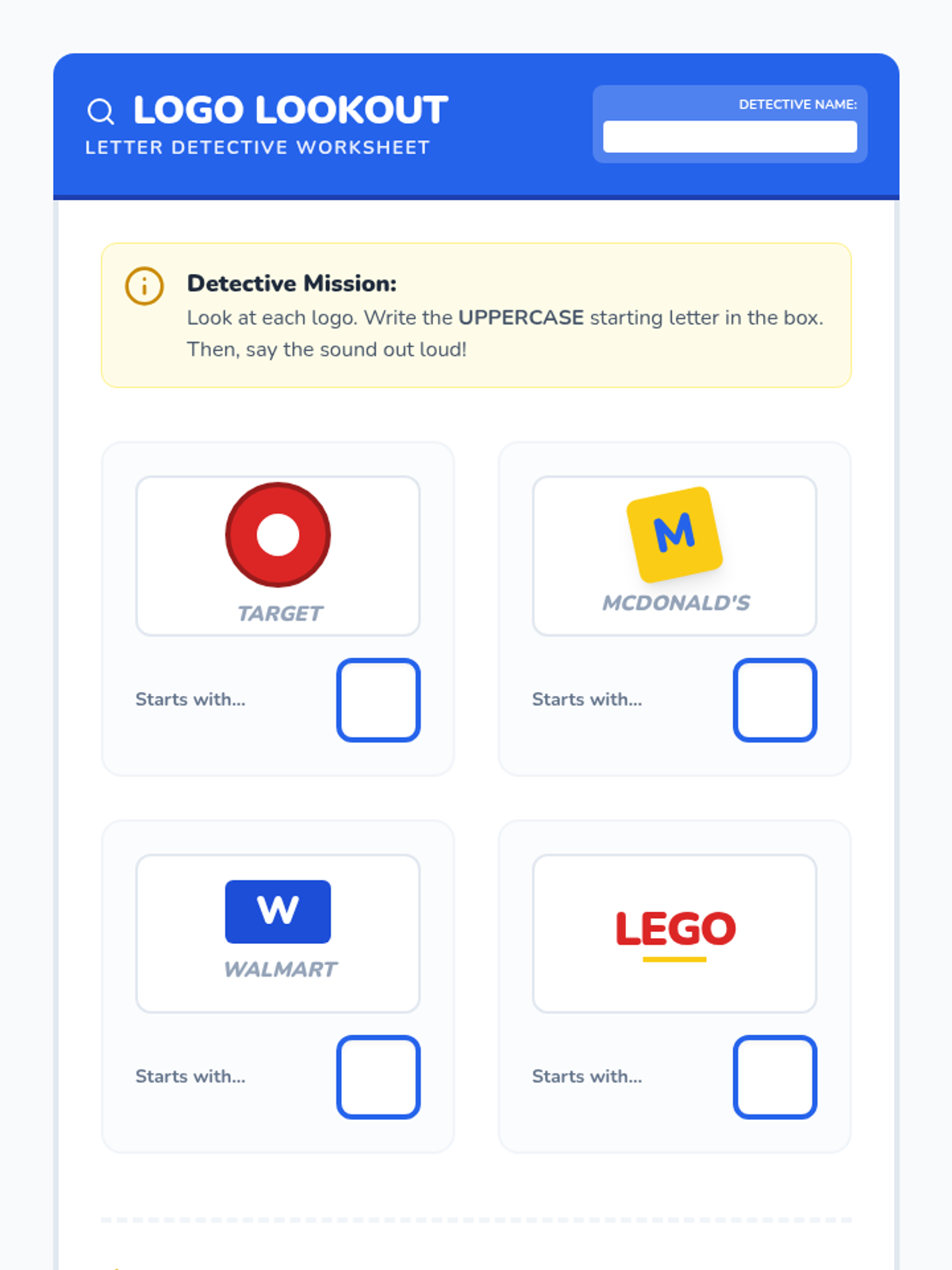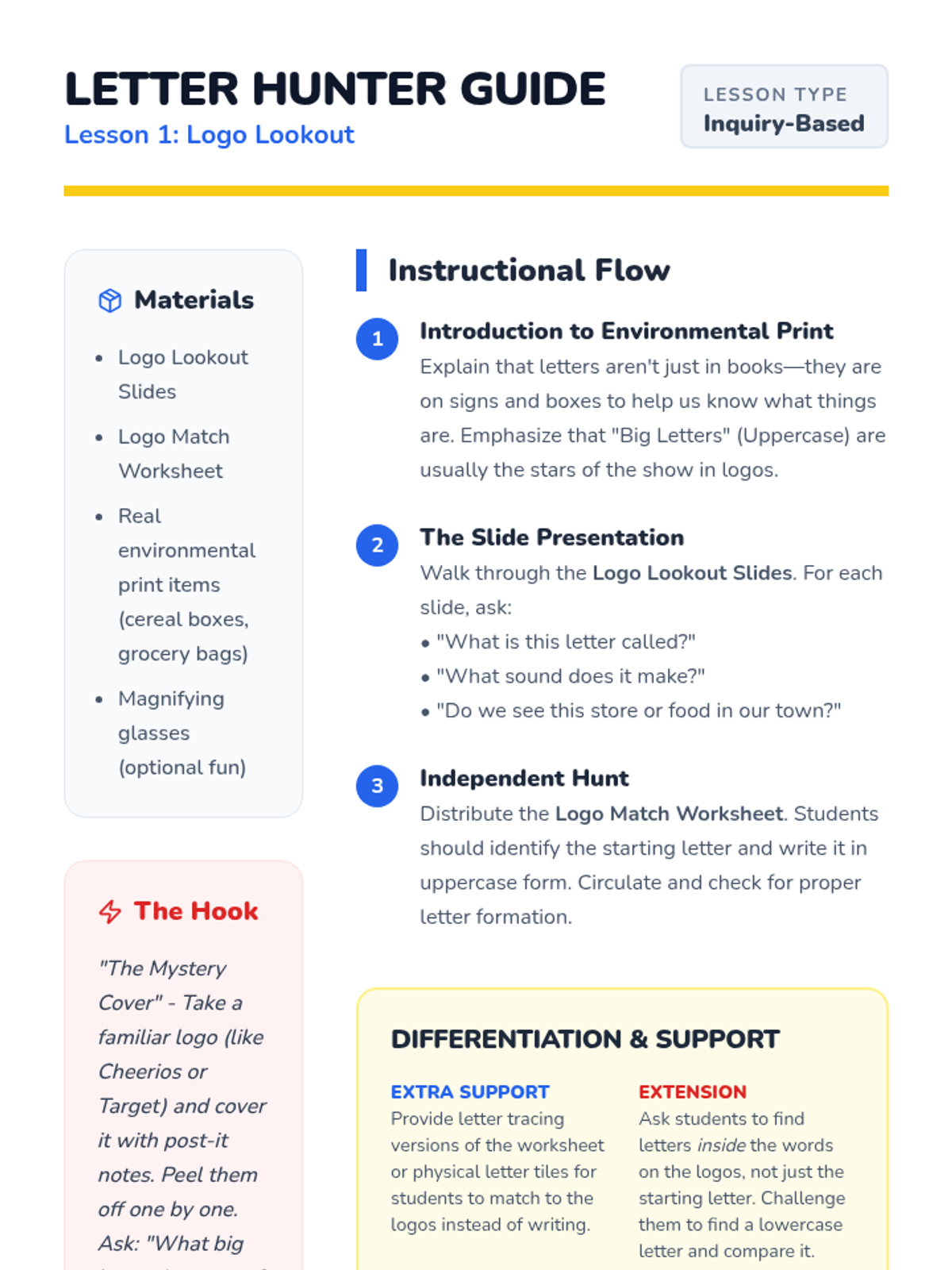 An inquiry-based ELA sequence for Kindergarten that uses environmental print (logos, signs, labels) to teach uppercase letter-sound associations. Students become 'Letter Detectives' exploring the world's text to understand that big letters have specific sounds.