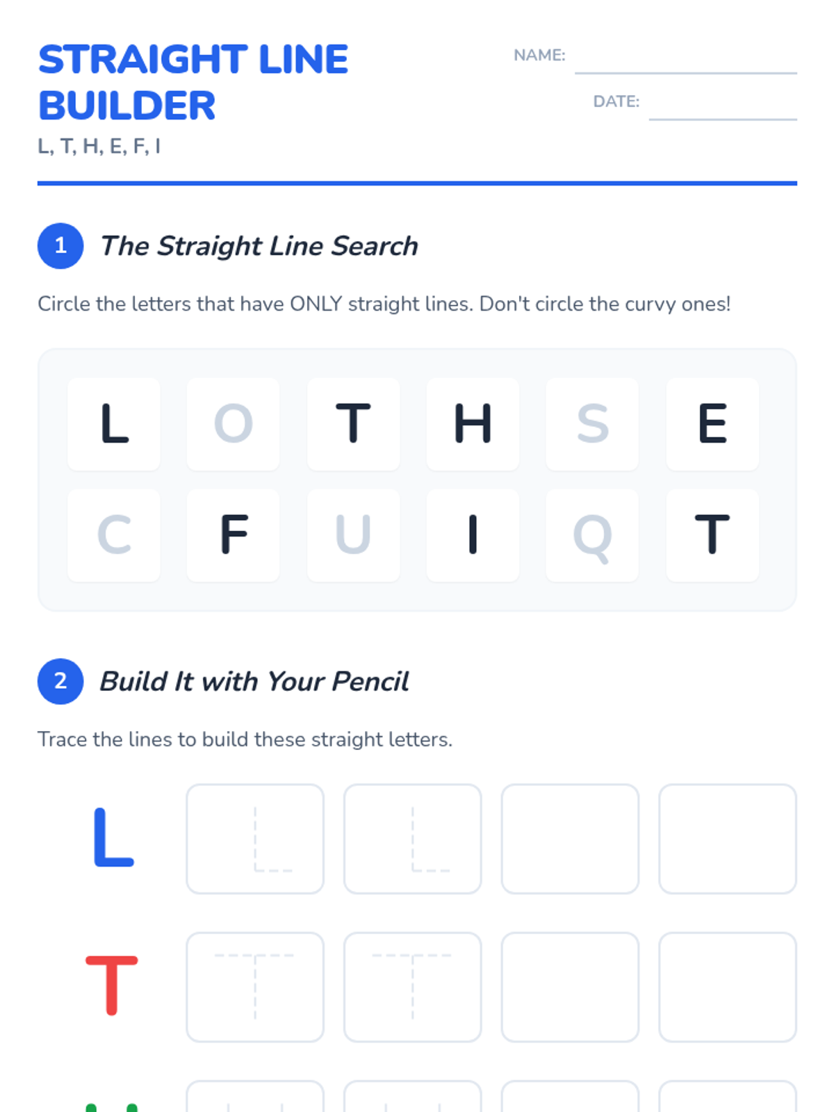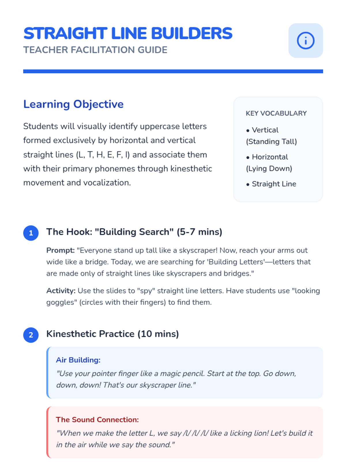 This sequence introduces Pre-K students to uppercase letters by categorizing them based on their shape features (straight lines vs. curves). Students develop visual discrimination and letter-sound correspondence through hands-on activities, sorting, and guided practice.