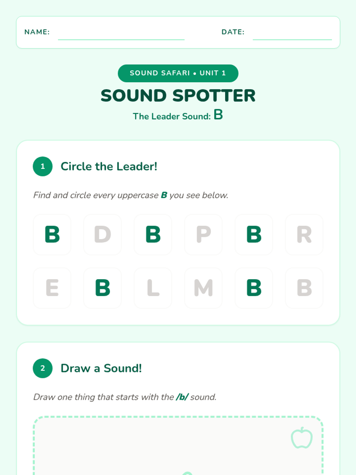 A Kindergarten Phonics sequence focused on auditory discrimination and initial sound identification, mapping sounds to uppercase letter representations through storytelling, games, and creative play.
