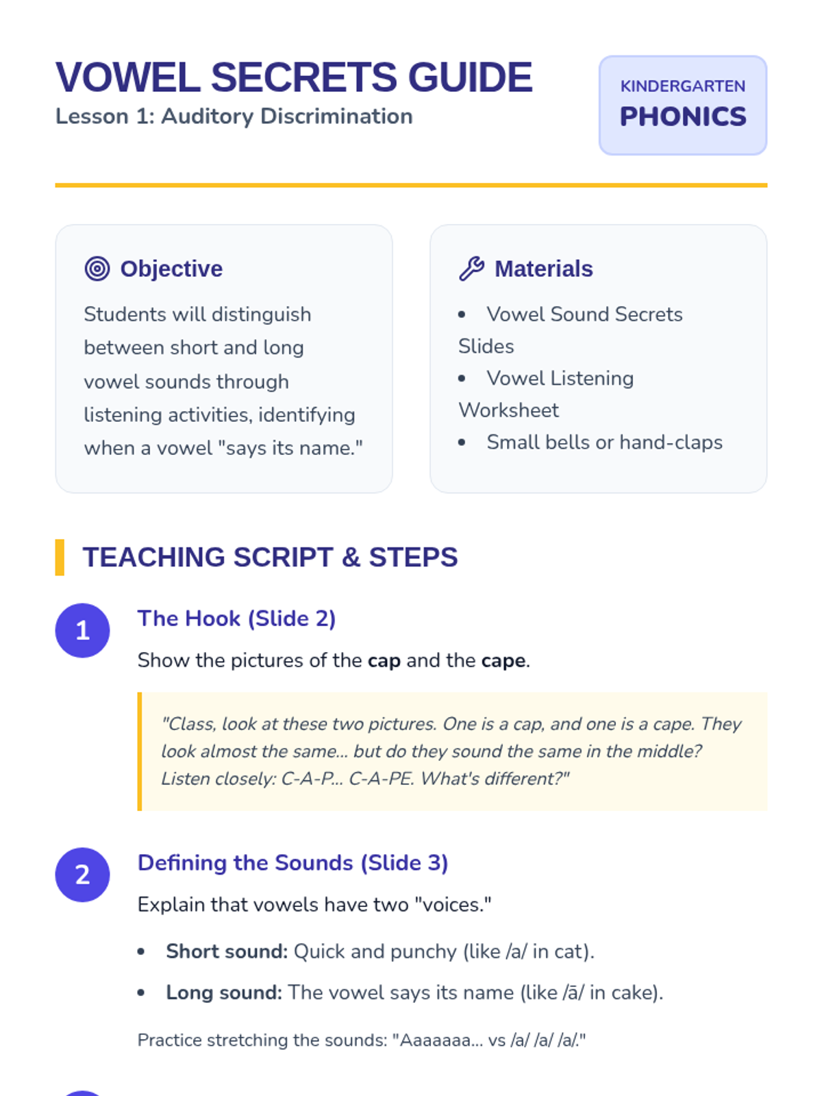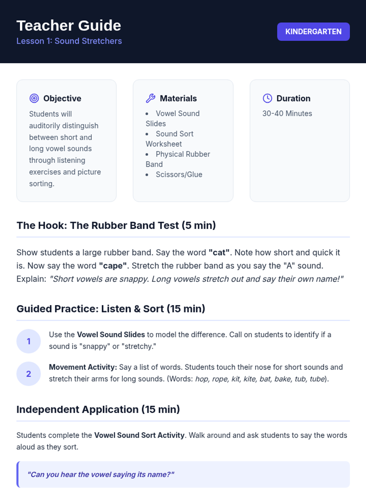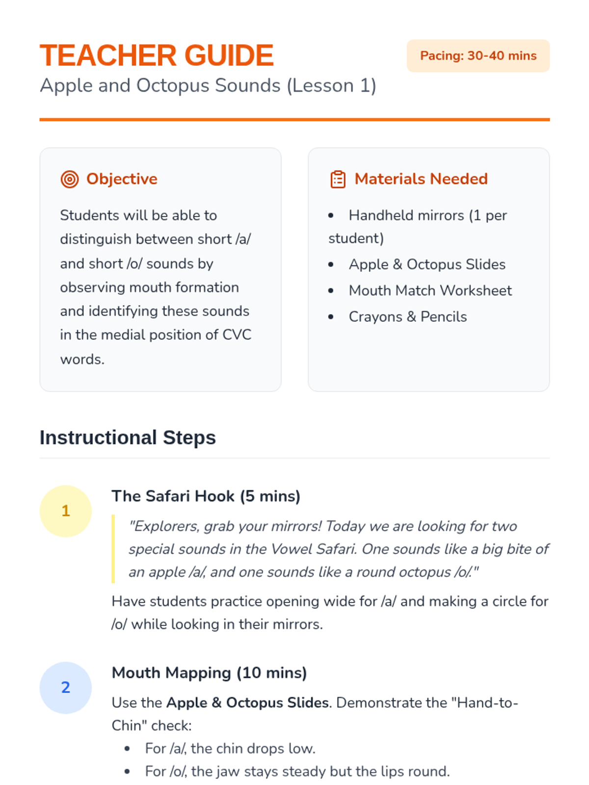 A systematic introduction to the five short vowel sounds for Kindergarten students, focusing on mouth formation, auditory discrimination, blending, and segmenting CVC words through a multisensory 'Sound Safari' theme.