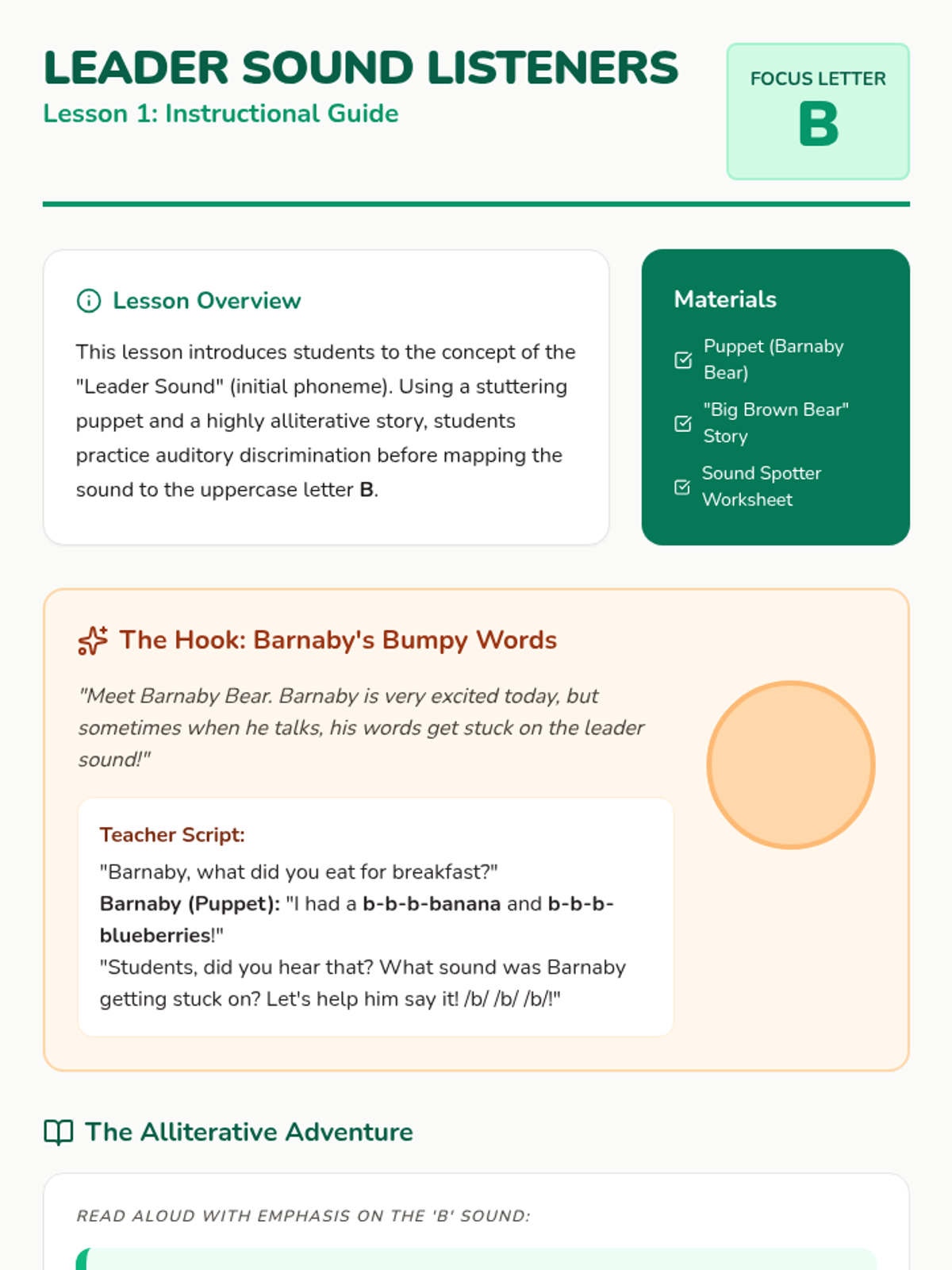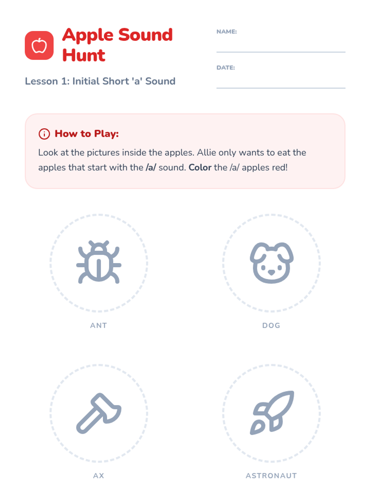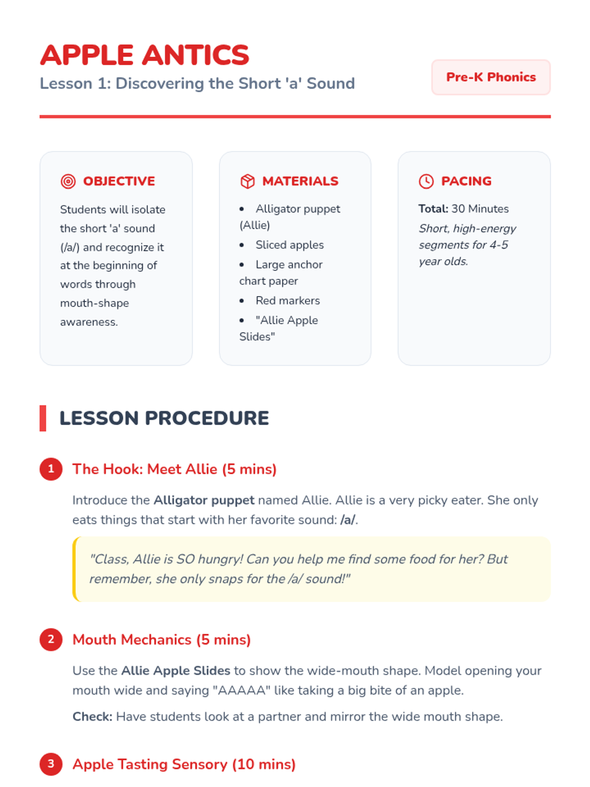 A sensory-rich phonics sequence for Pre-K students focusing on the short 'a' sound. Students move from sound isolation and mouth-shape awareness to identifying the sound in initial and medial positions, building basic blending skills through play-based activities.