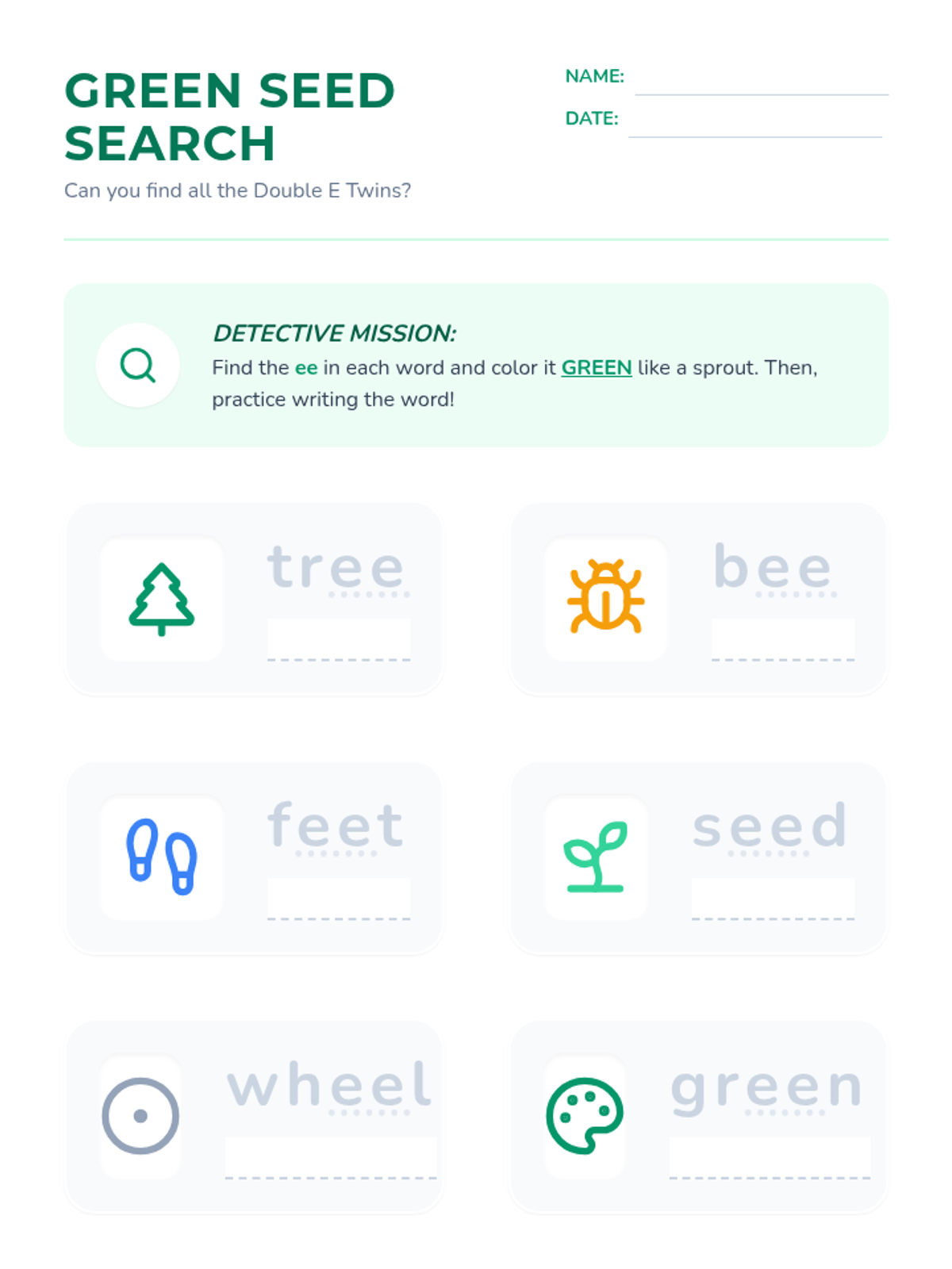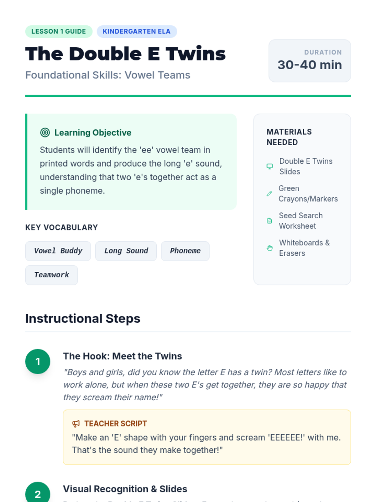 This Kindergarten ELA sequence introduces common vowel team patterns ('ee', 'ea', 'ai', 'ay') using a 'Vowel Buddies' theme. Students move from basic recognition of the double 'e' to blending and reading these patterns in decodable texts.