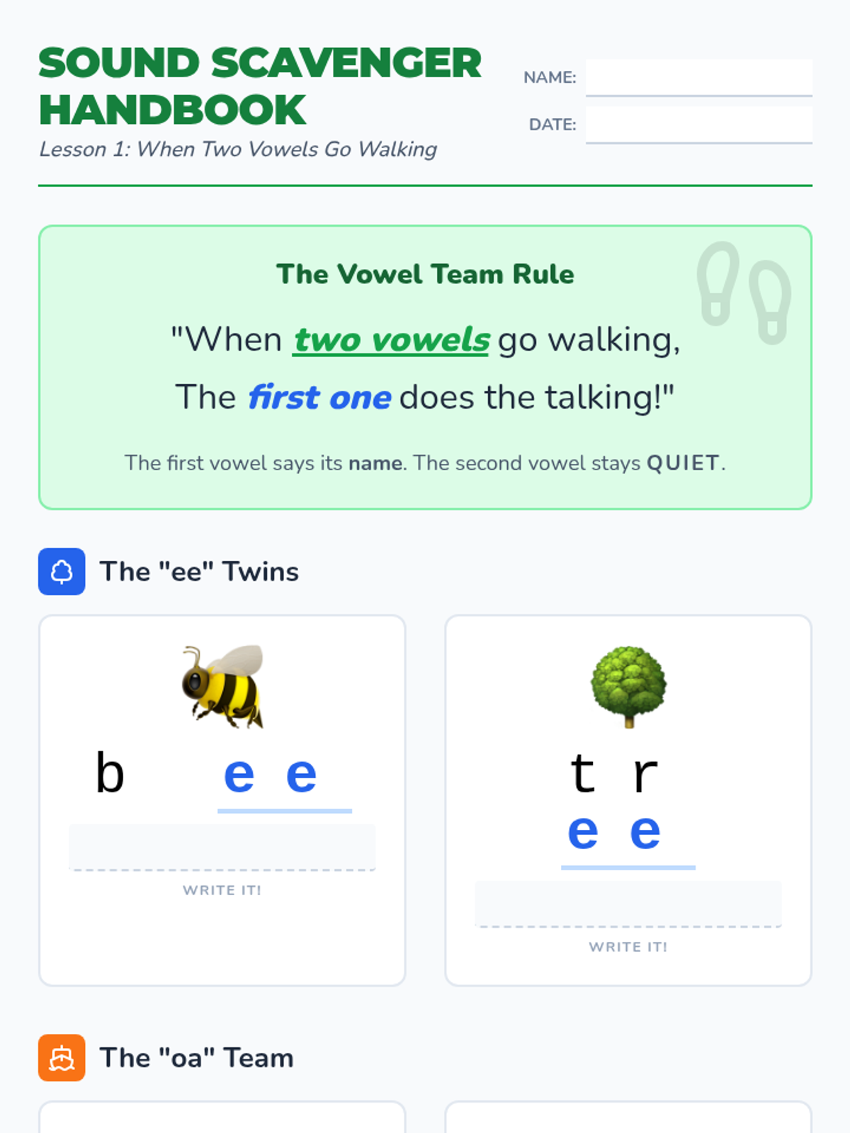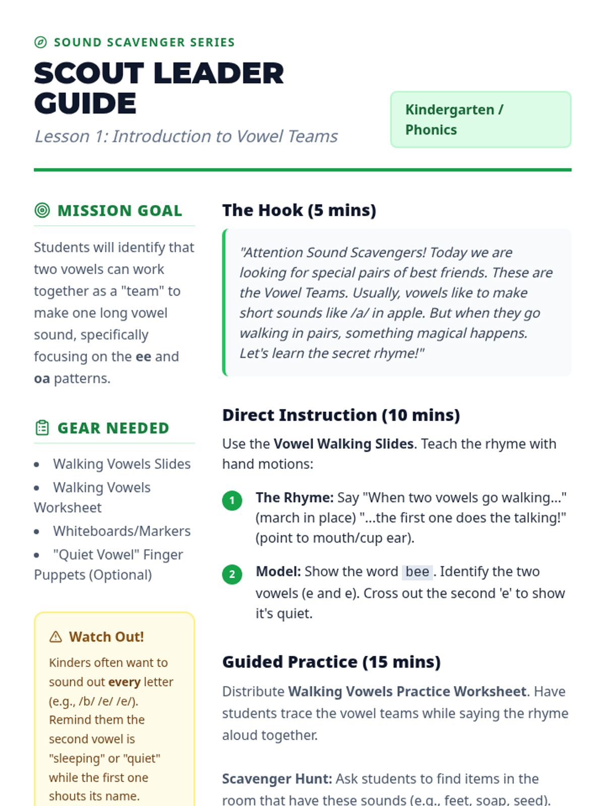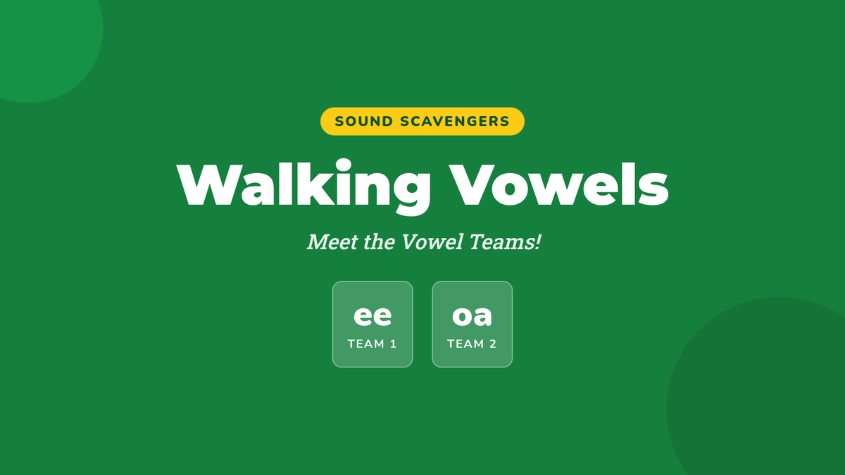 A Kindergarten phonics sequence focusing on vowel teams (ee, ea, ai, ay, oa) using the 'Sound Scavengers' theme and the classic 'walking vowels' rhyme to help students decode long vowel sounds in teams.