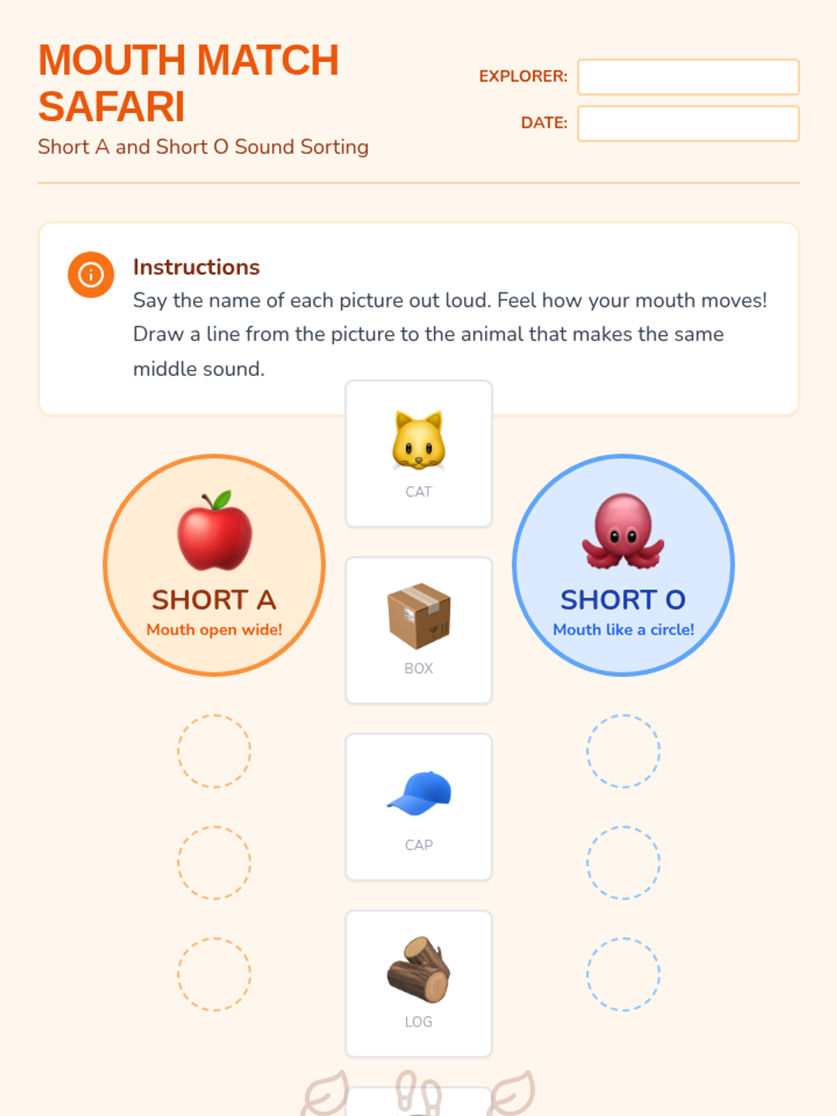 A Pre-K phonics sequence focusing on the short /o/ sound through sensory play, rhyming, and creative crafts. Students learn mouth formation, identify medial vowel sounds, and distinguish /o/ from other vowels.