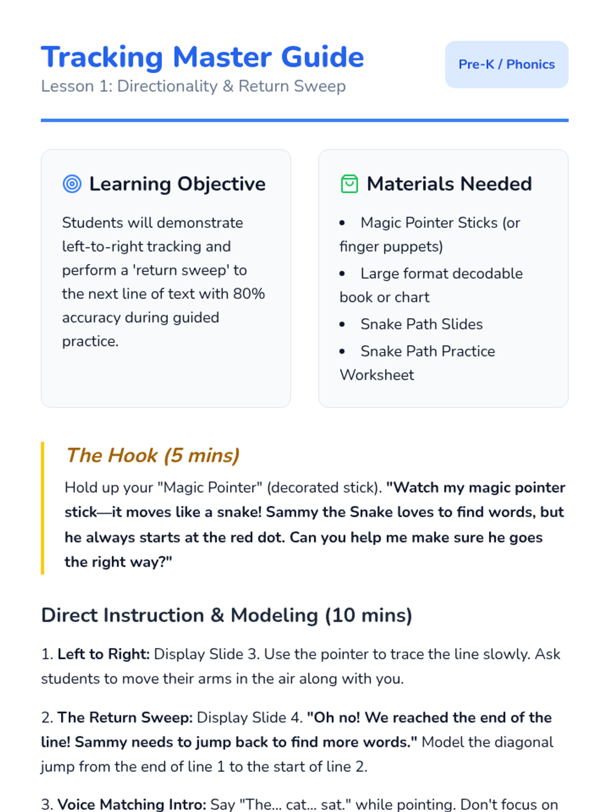 A comprehensive Pre-K sequence focused on teaching print awareness, directionality, and tracking using decodable text foundations. Students transition from teacher-led modeling to independent tracking through engaging, multisensory activities.