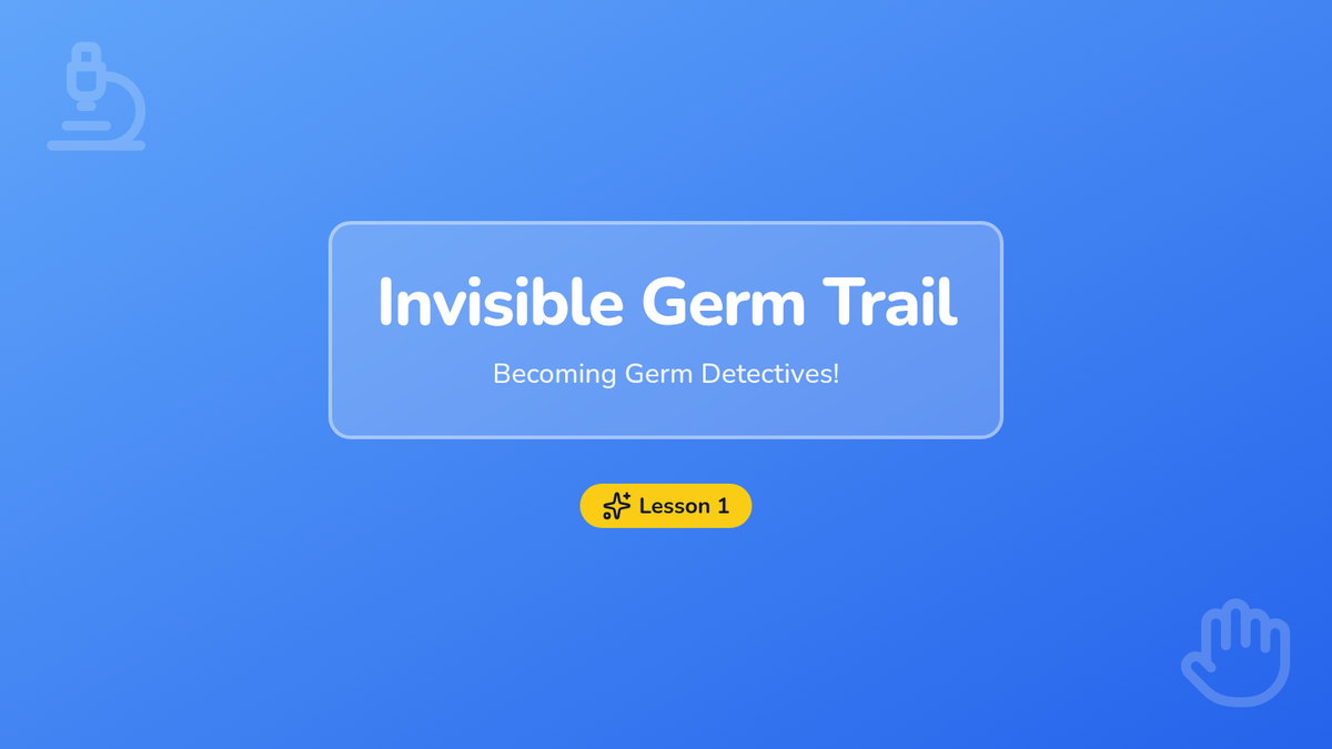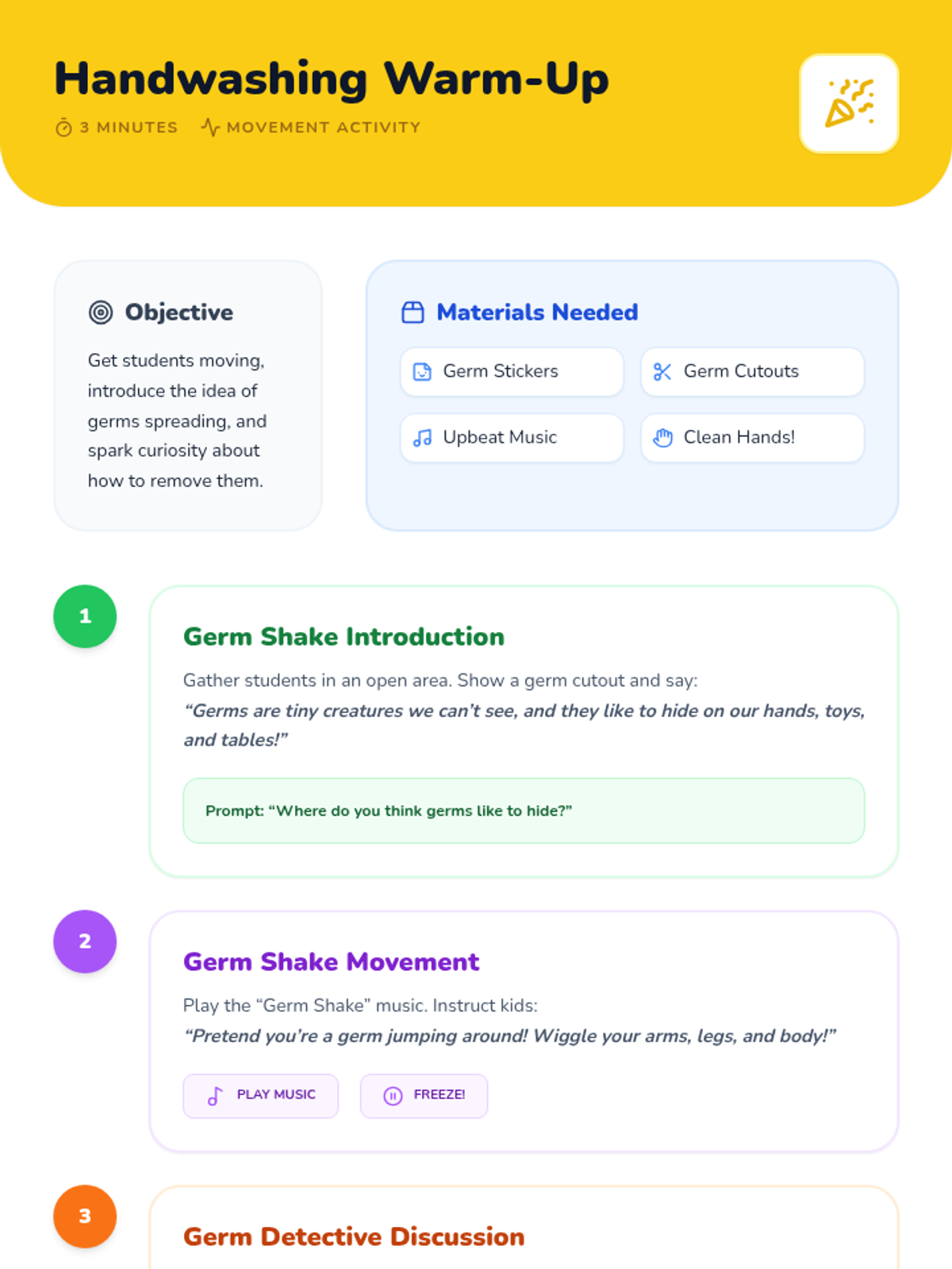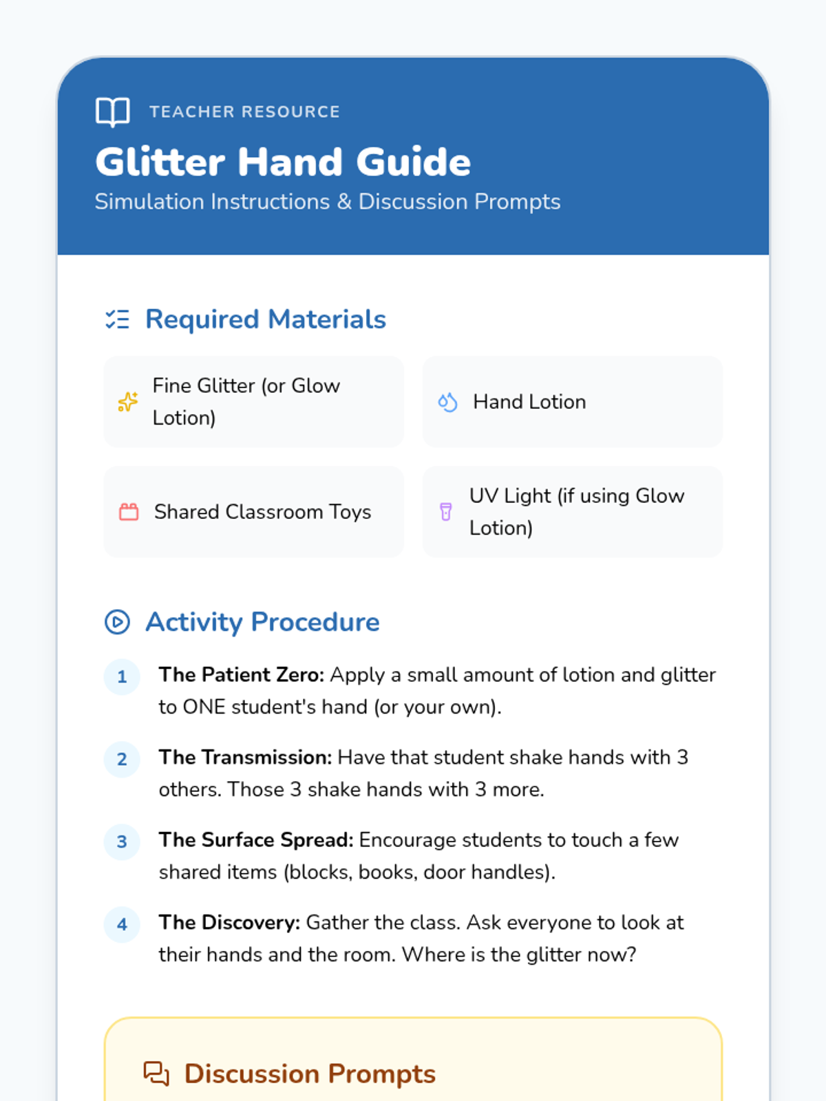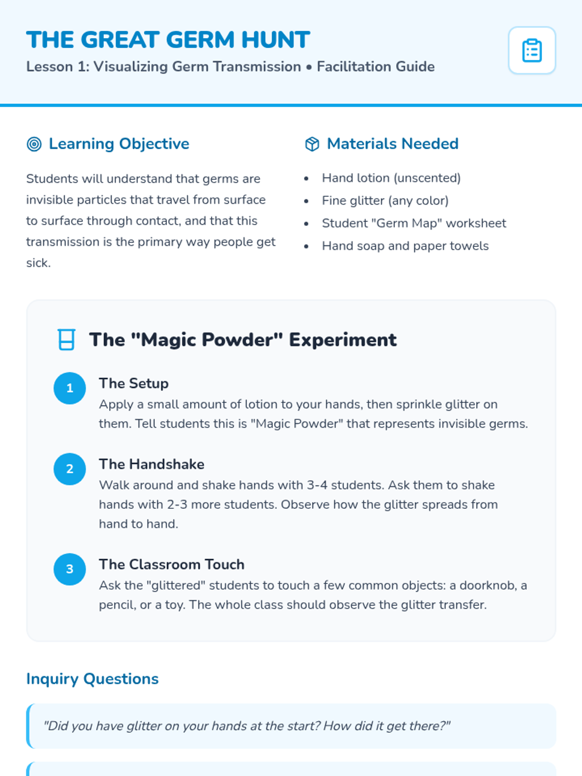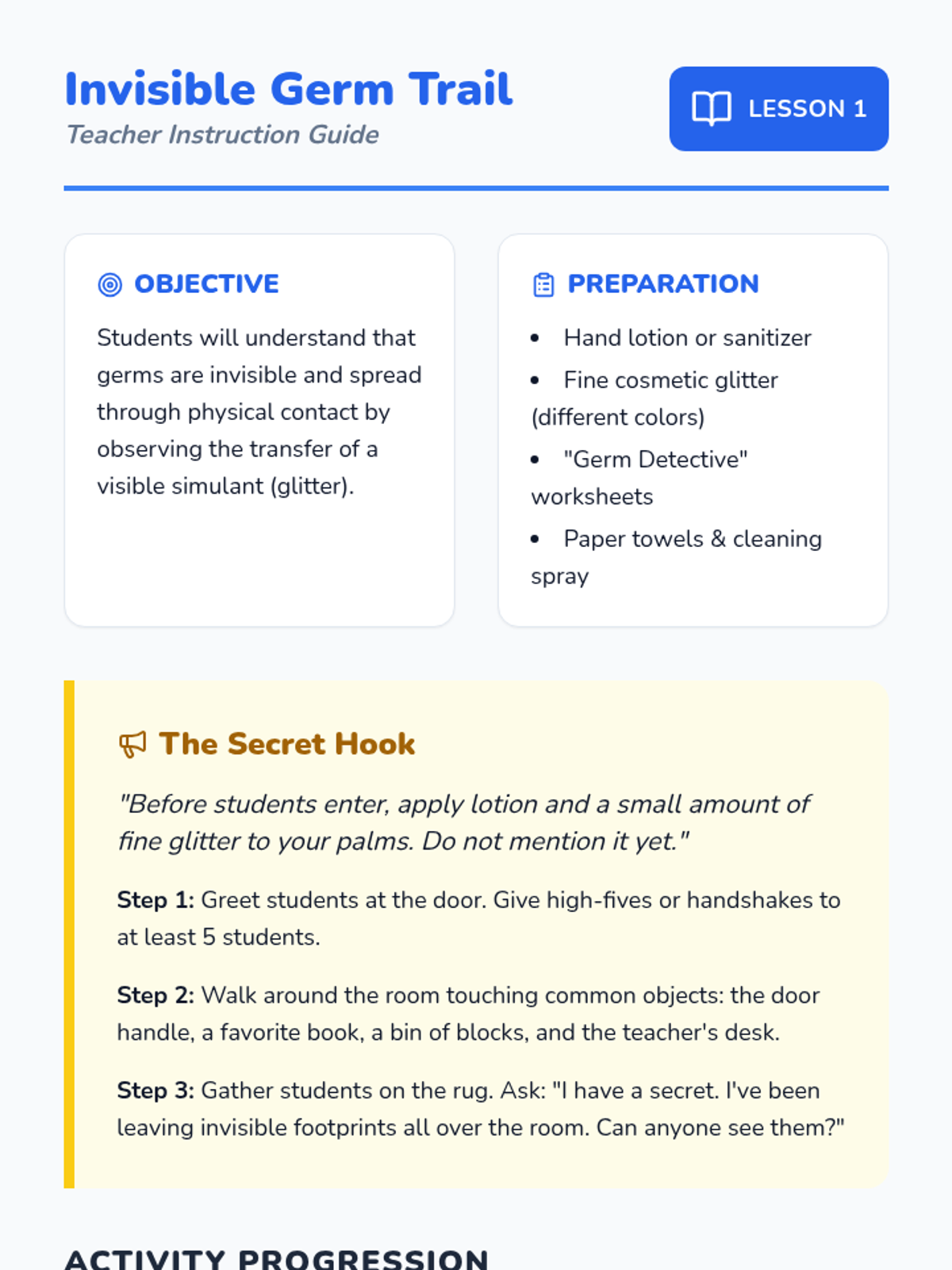 A sensory-rich Pre-K sequence introducing germs and hand hygiene through simulations, experiments, and routine building. Students progress from visualizing germ spread to mastering effective handwashing and respiratory etiquette.