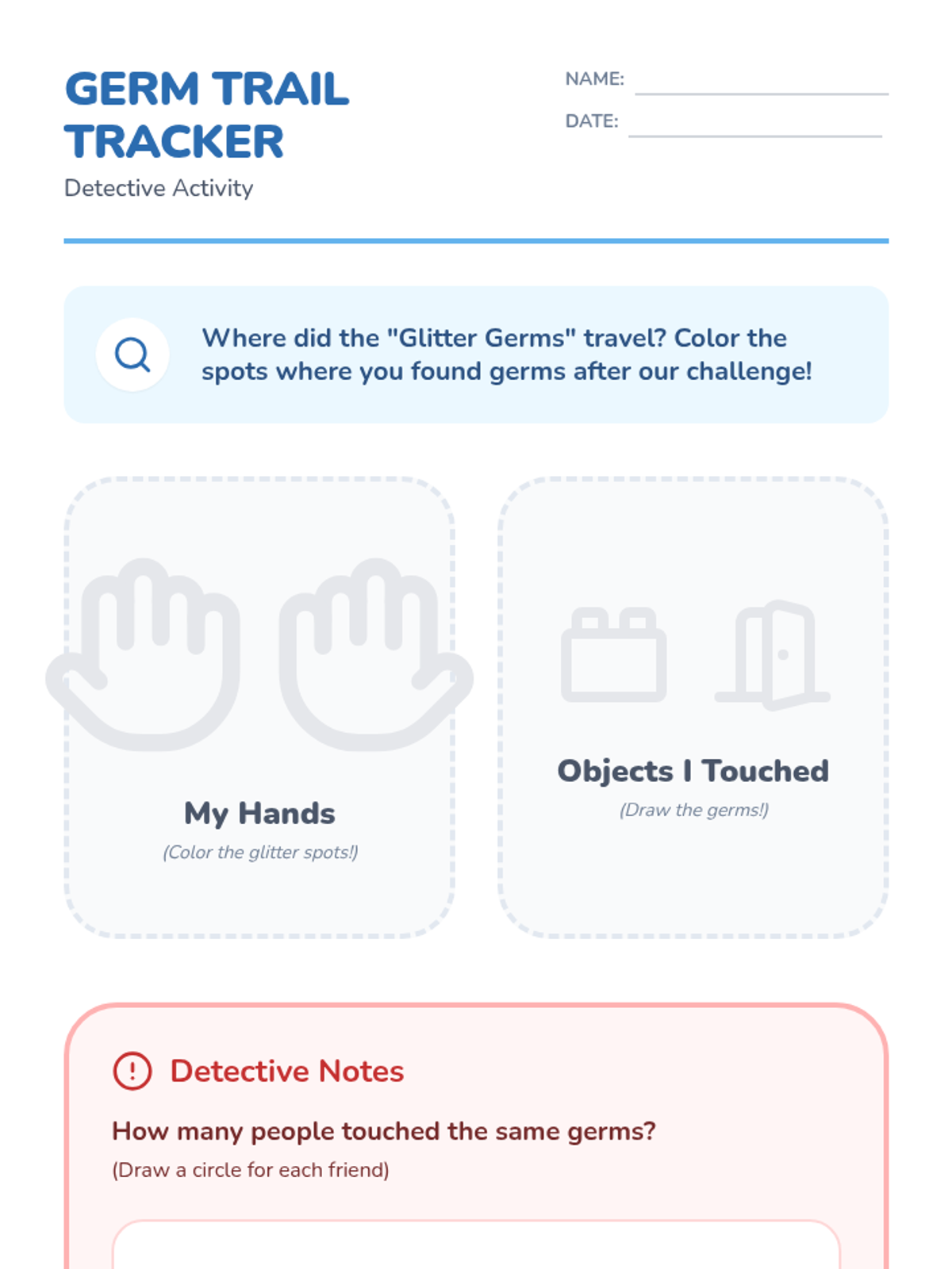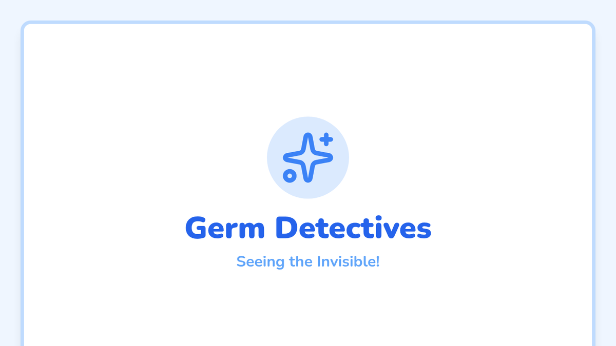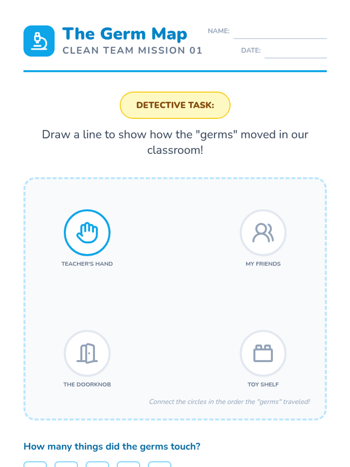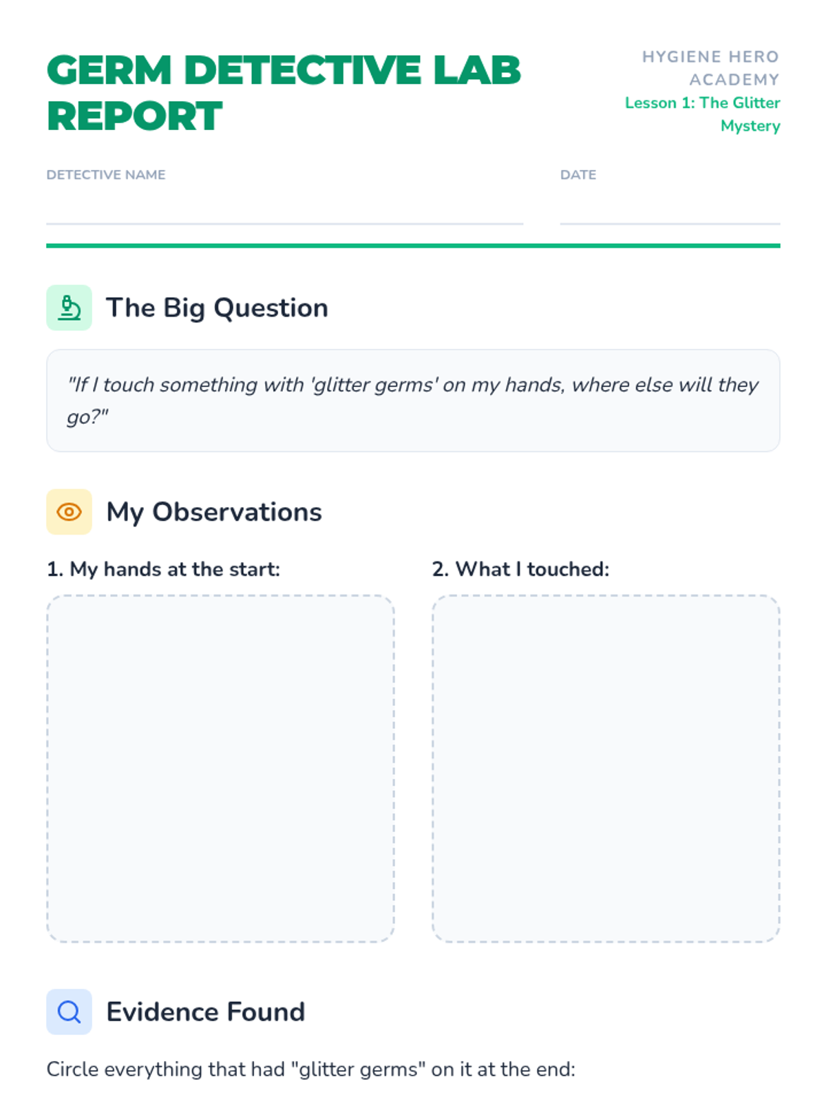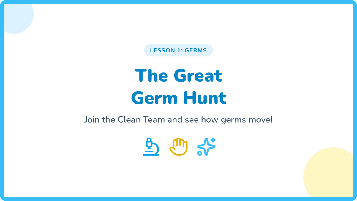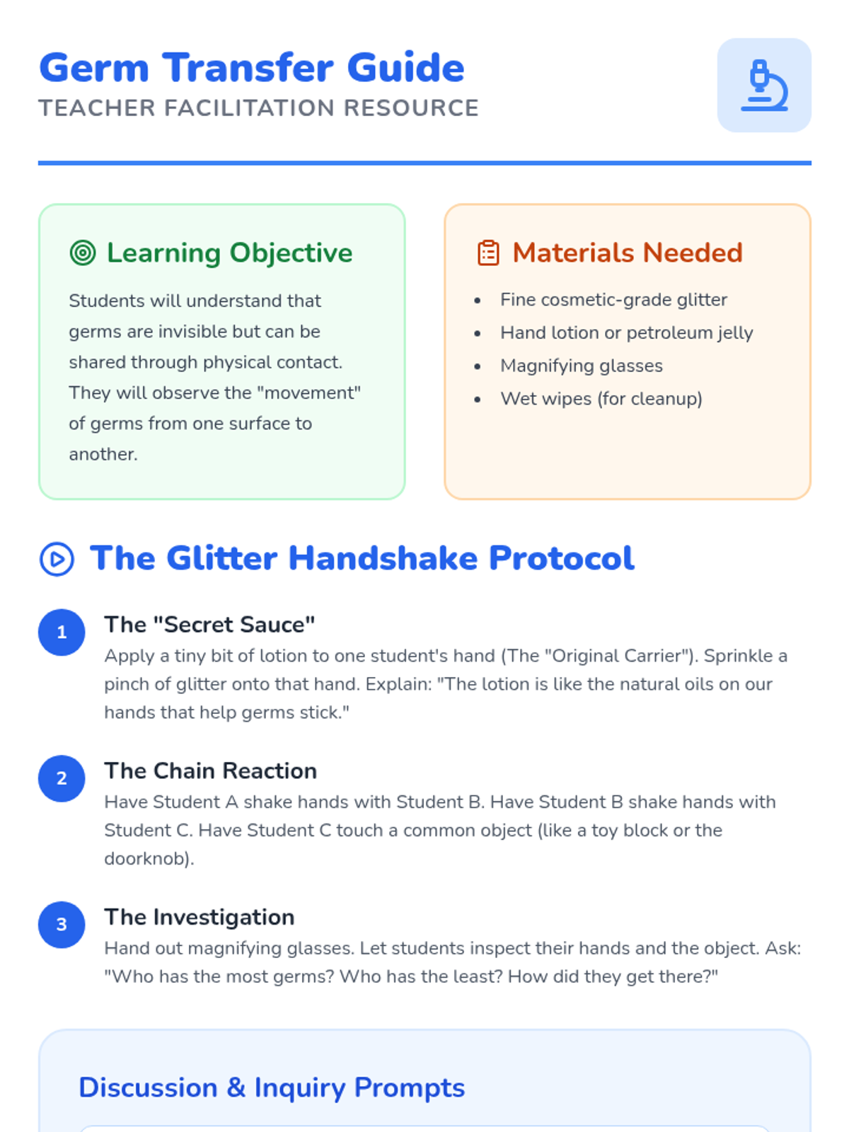 A sensory-rich Pre-K sequence introducing germs and hand hygiene through simulations, experiments, and routine building. Students progress from visualizing germ spread to mastering effective handwashing and respiratory etiquette.