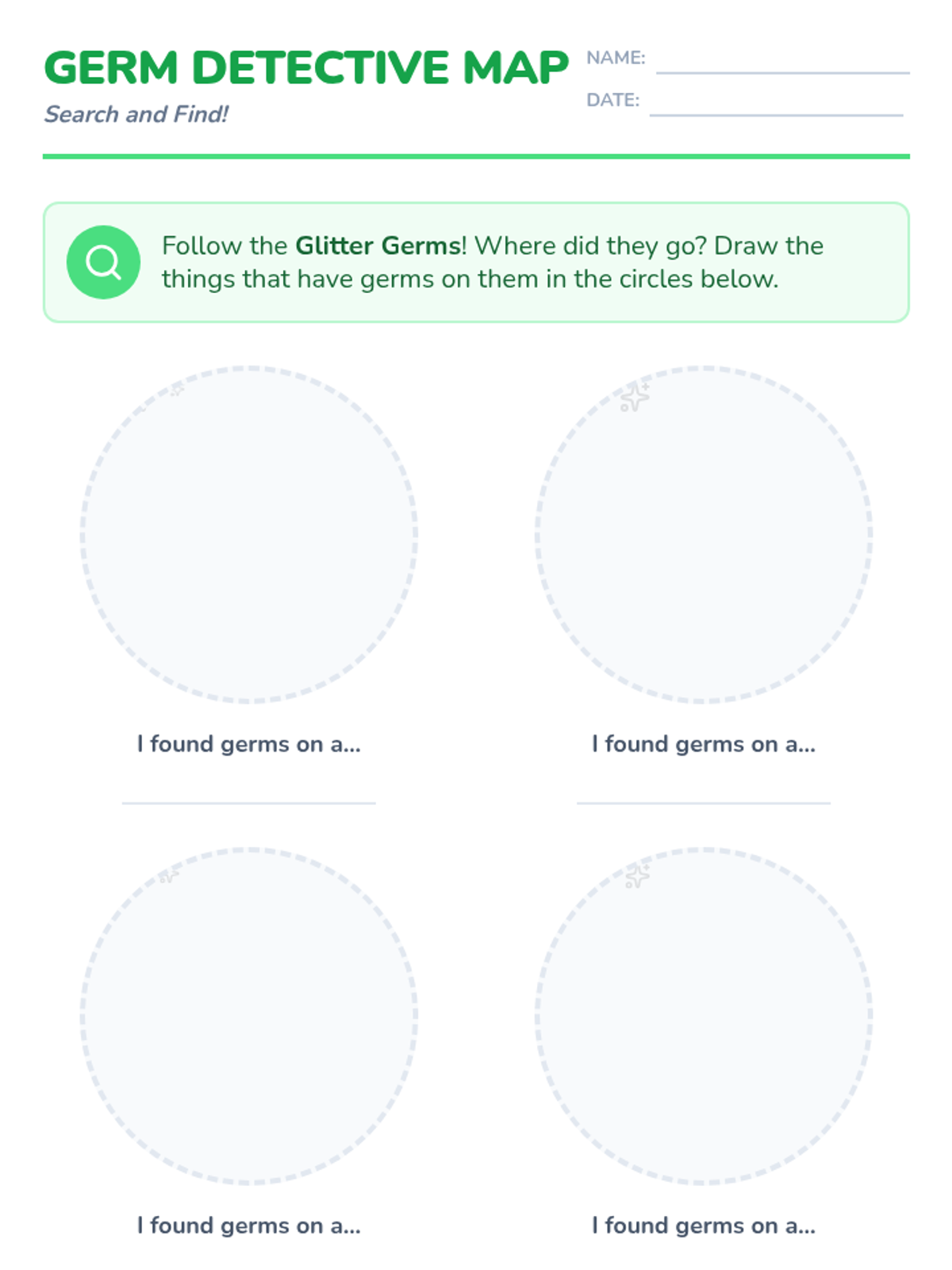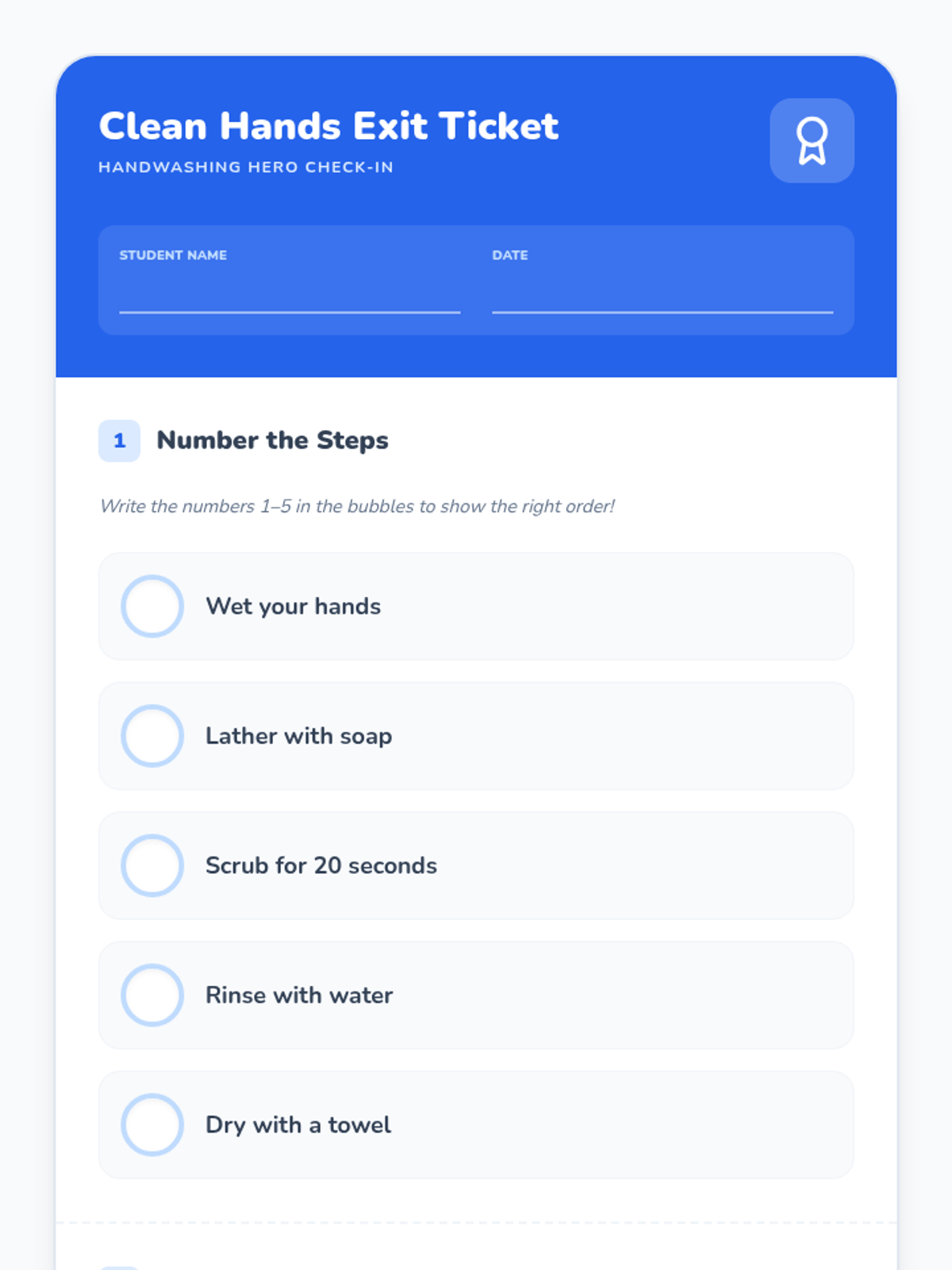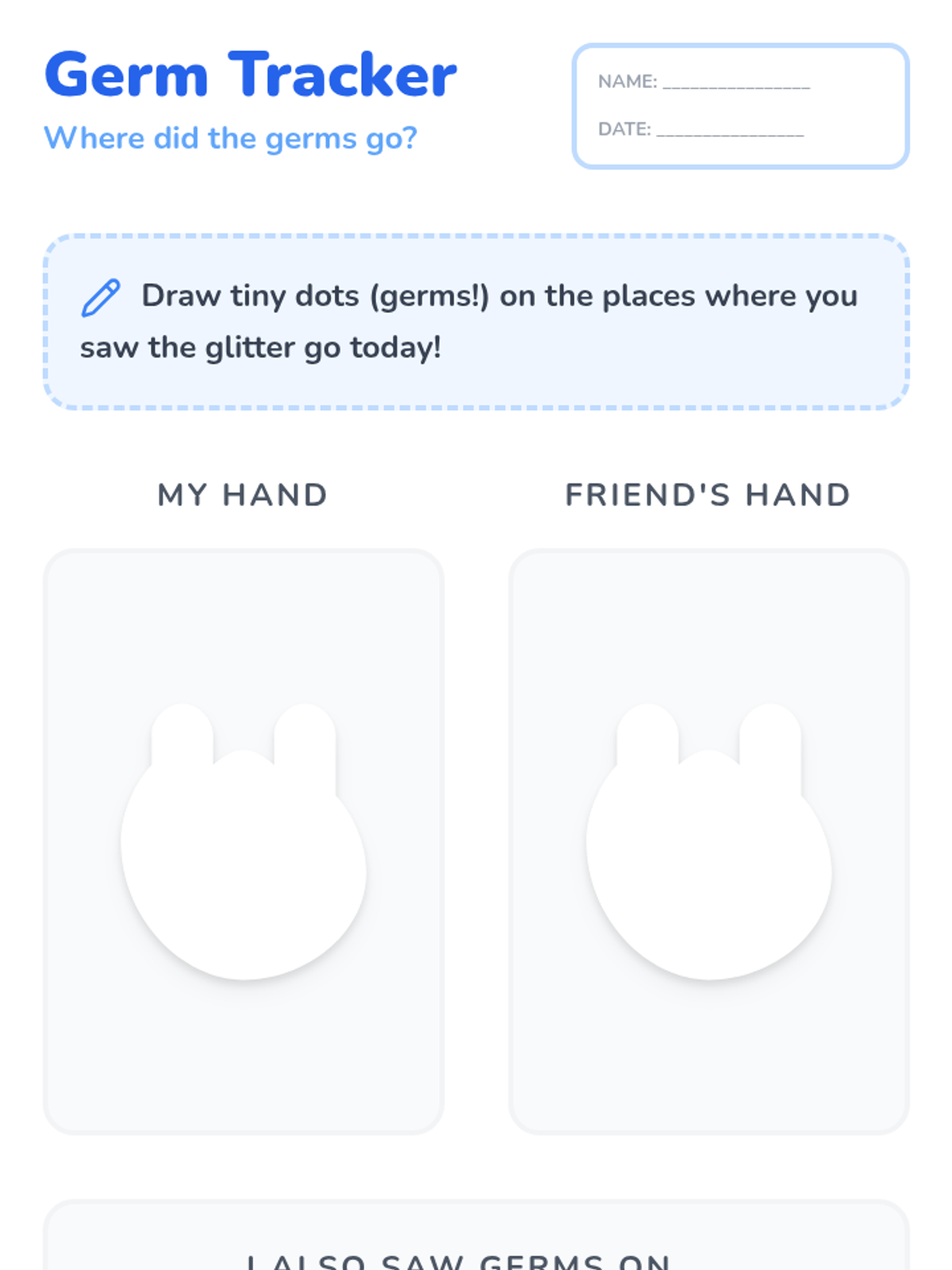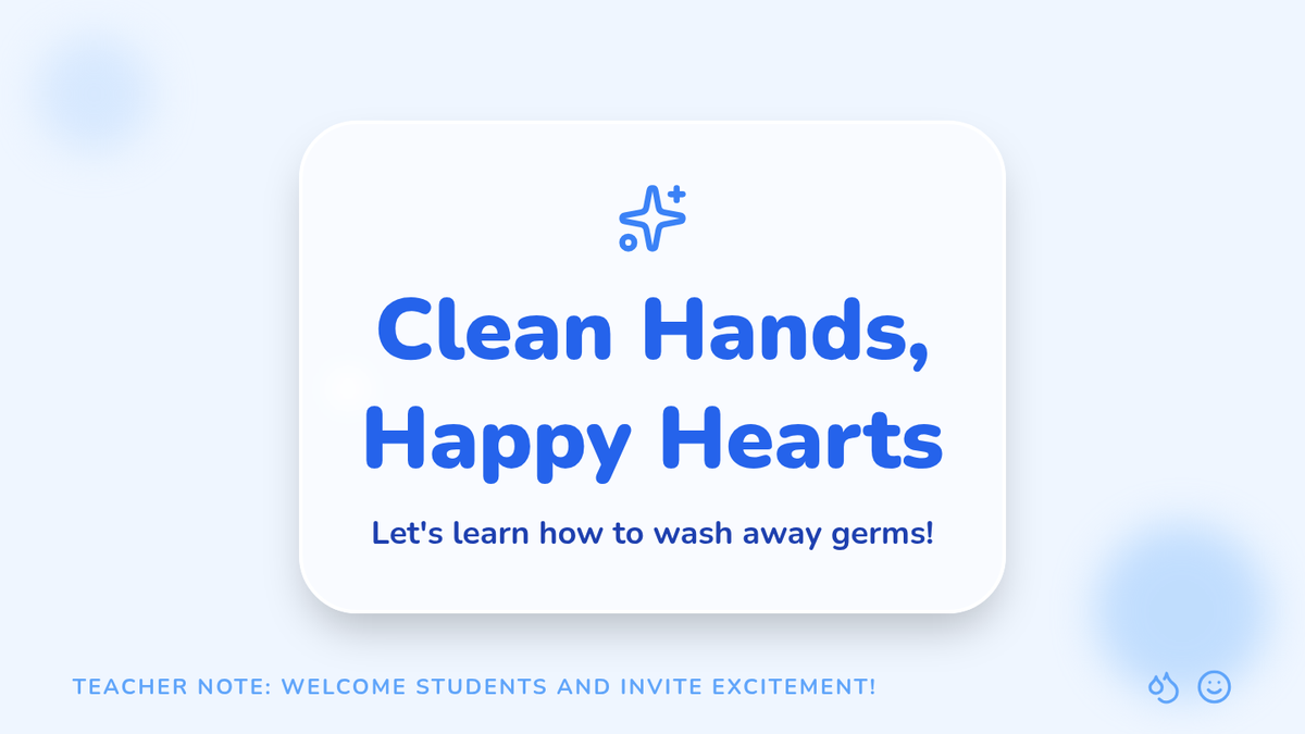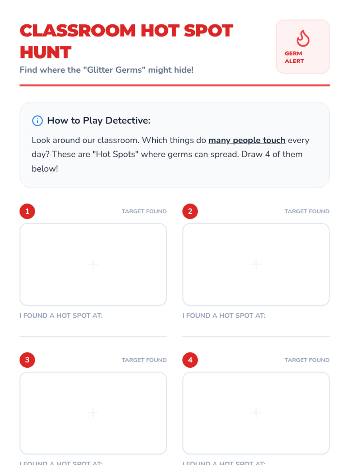 A sensory-rich Pre-K sequence introducing germs and hand hygiene through simulations, experiments, and routine building. Students progress from visualizing germ spread to mastering effective handwashing and respiratory etiquette.