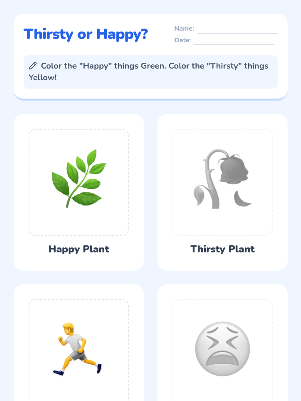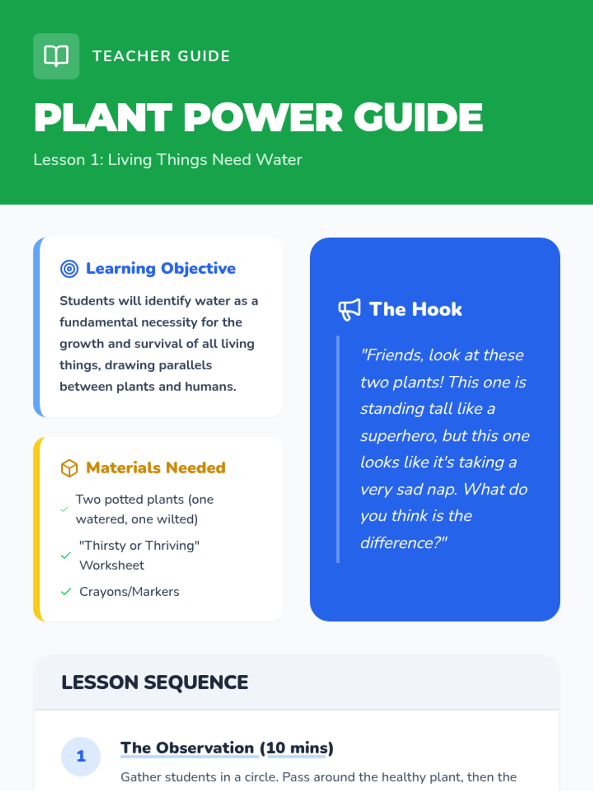 A Pre-K inquiry-based sequence exploring why living things need water. Students transition from observing plants to understanding water as fuel for their own bodies and brains.