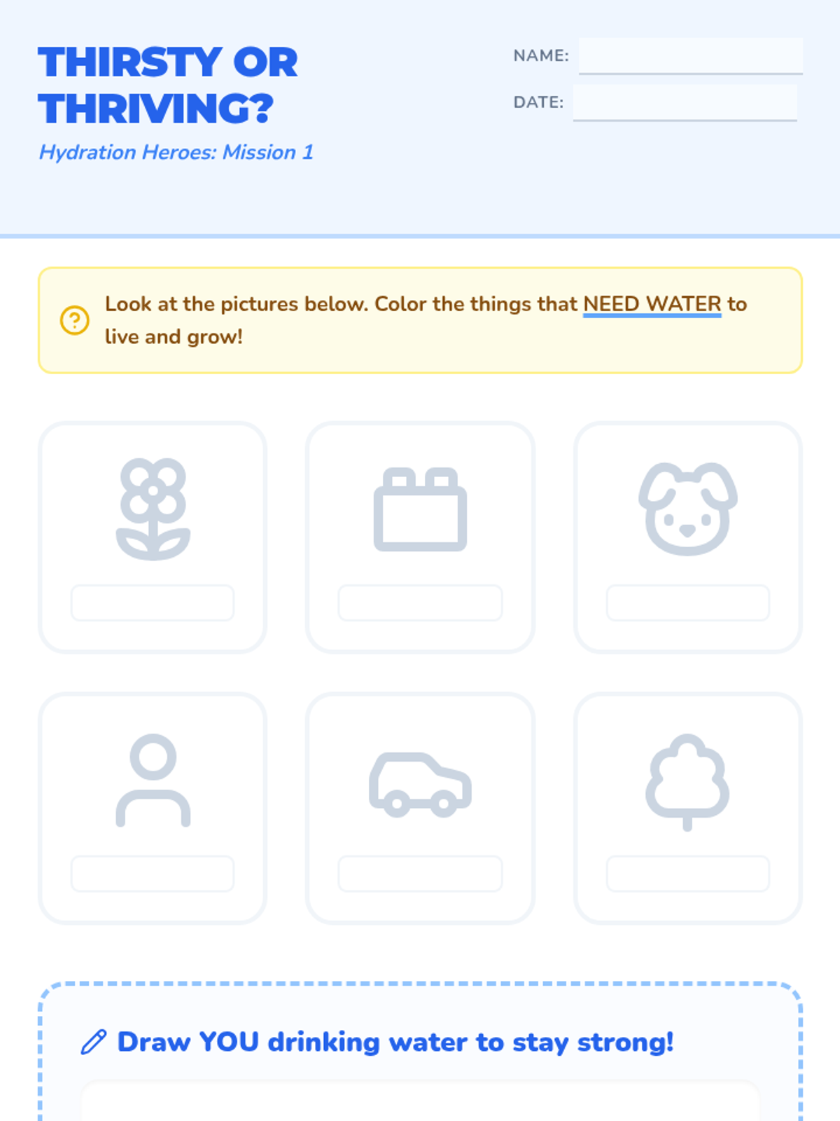 A Pre-K sequence focused on distinguishing water as the healthiest beverage choice. Students explore hydration through hands-on experiments, sorting games, and sensory exploration.