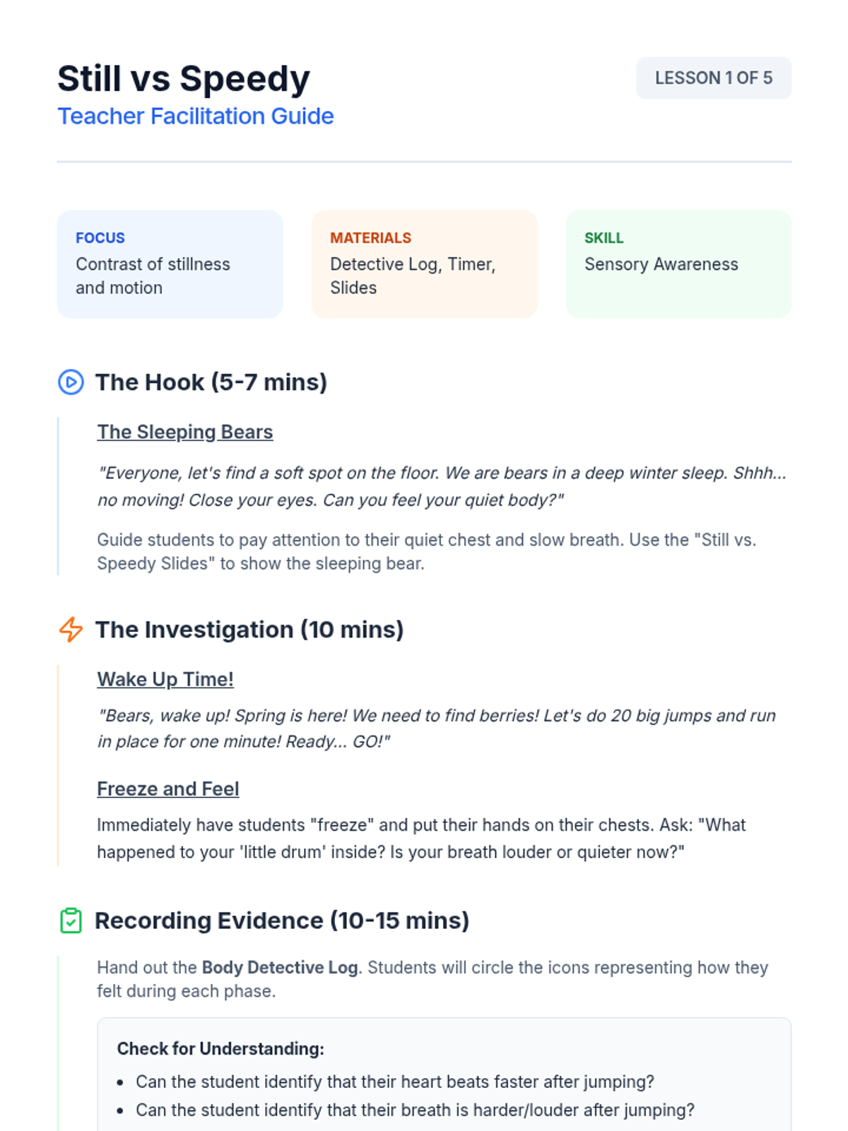 In this inquiry-driven sequence, Pre-K students explore the immediate physiological effects of physical activity. Through sensory awareness activities, children learn to recognize the difference between a resting body and an active body, focusing on heart rate, breathing, and temperature.