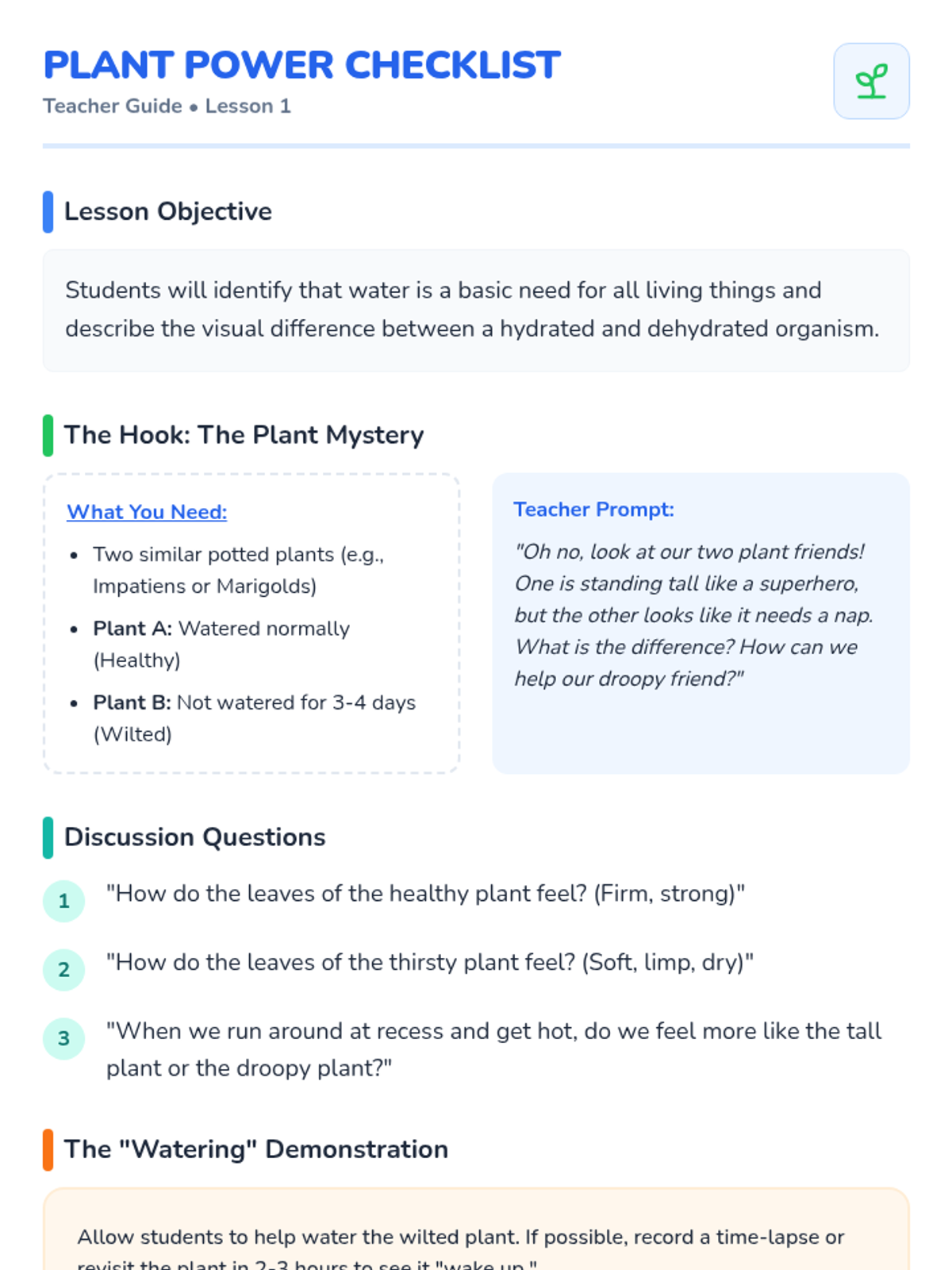 A comprehensive Kindergarten health sequence focusing on recognizing thirst signals, understanding biological needs for water through plant comparisons, timing hydration with physical activity, and choosing water over sugary drinks.