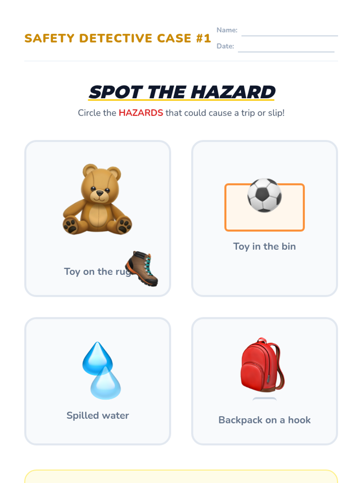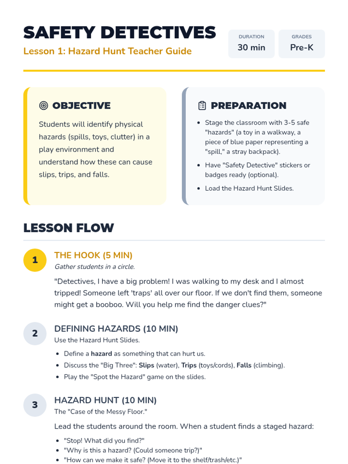 A comprehensive Pre-K sequence focused on environmental awareness, equipment protocols, and reporting hazards to ensure safe play. Students act as 'Safety Detectives' to identify risks and practice safe habits.