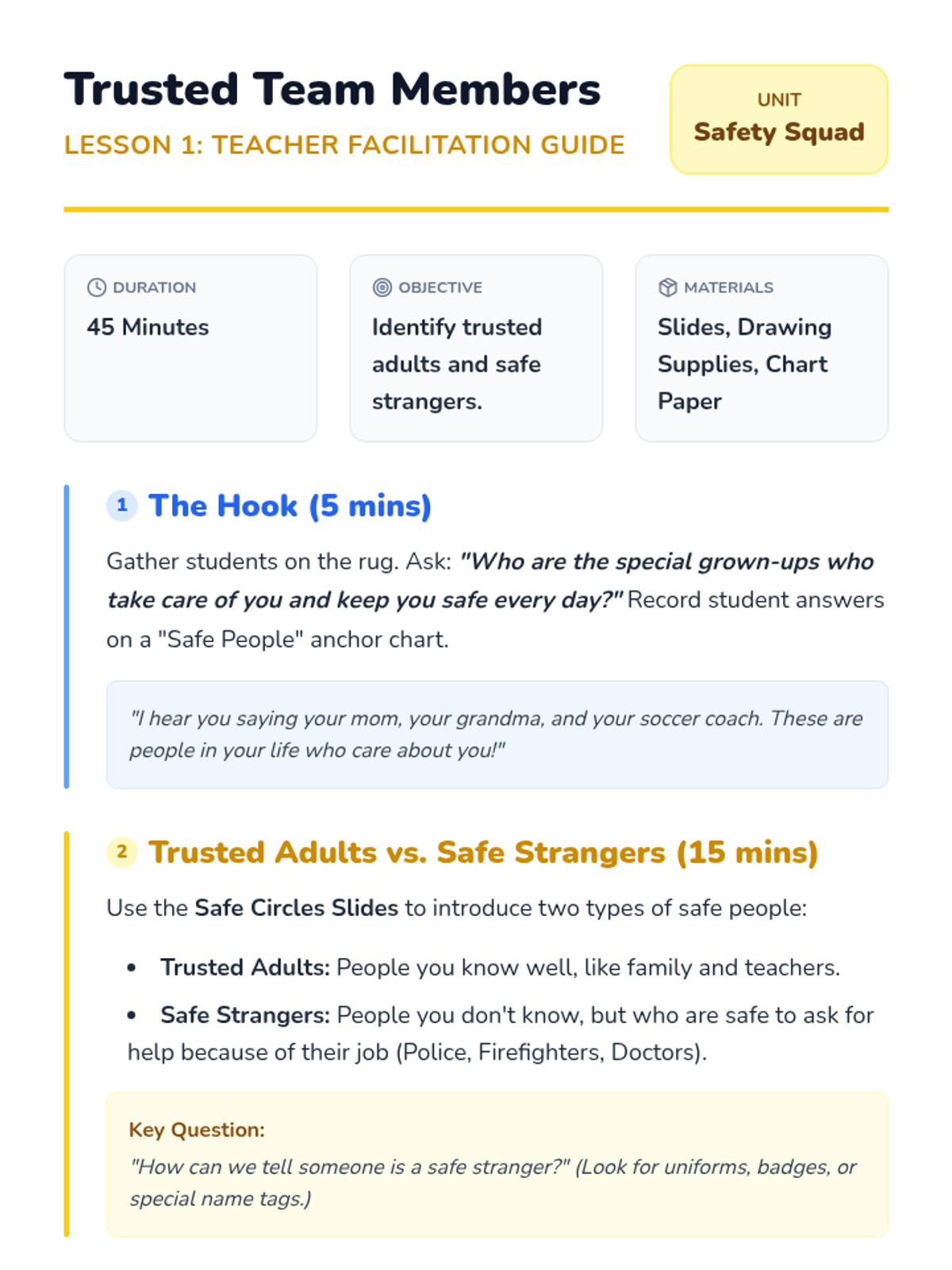A comprehensive sequence for Kindergarten students focused on identifying internal and external safety signals, navigating 'tricky' social situations, and establishing clear boundaries with a network of trusted adults.