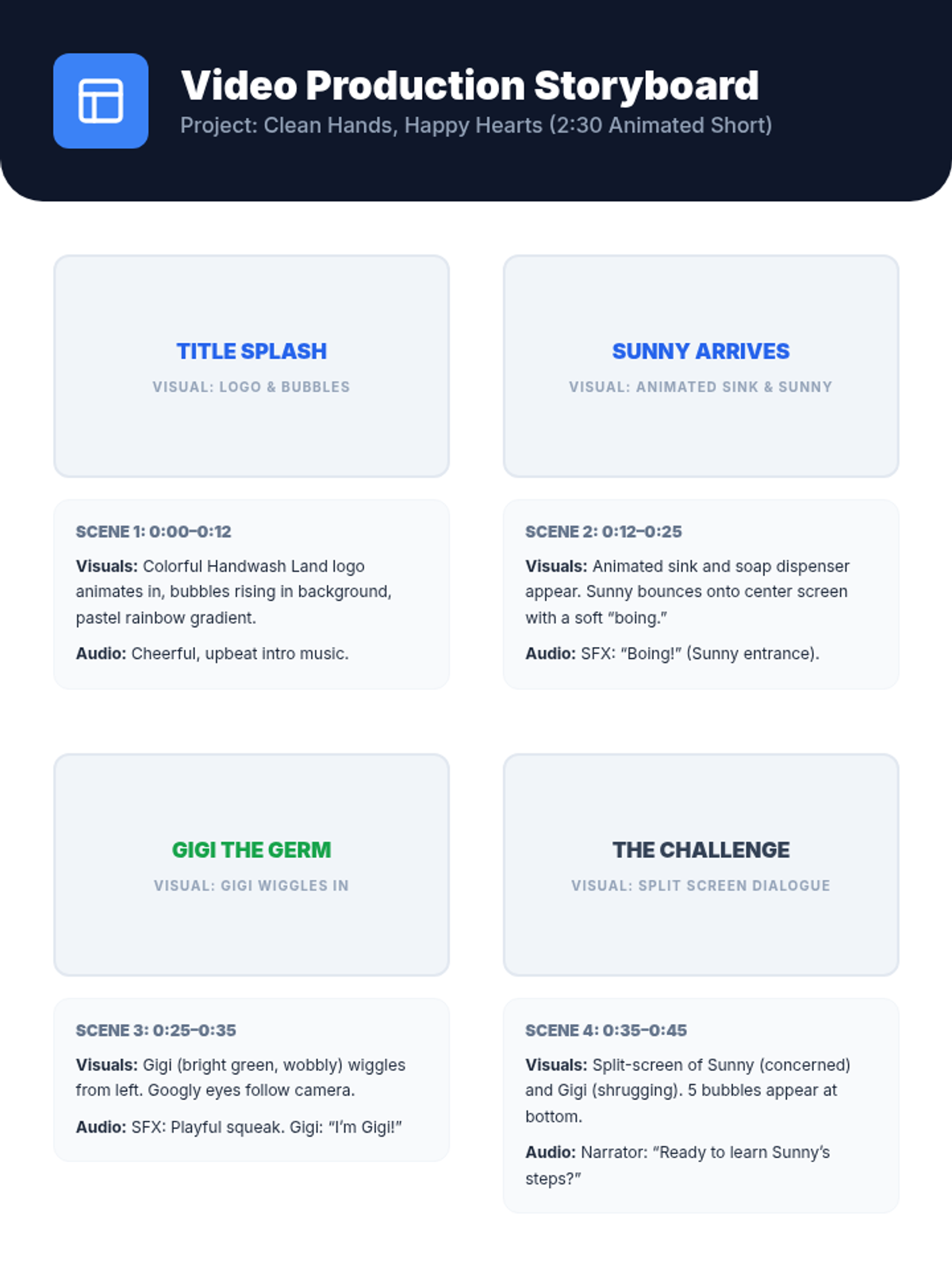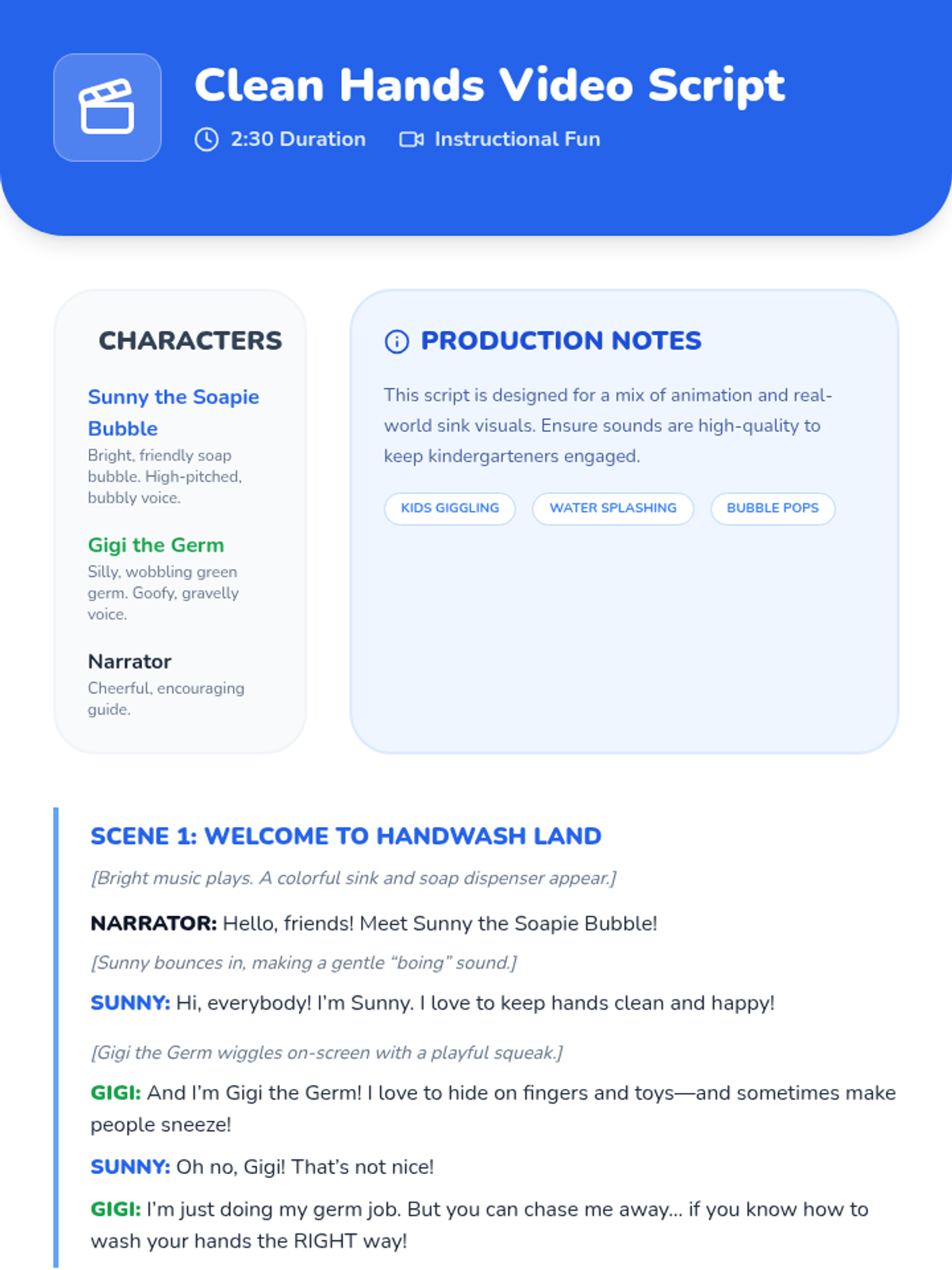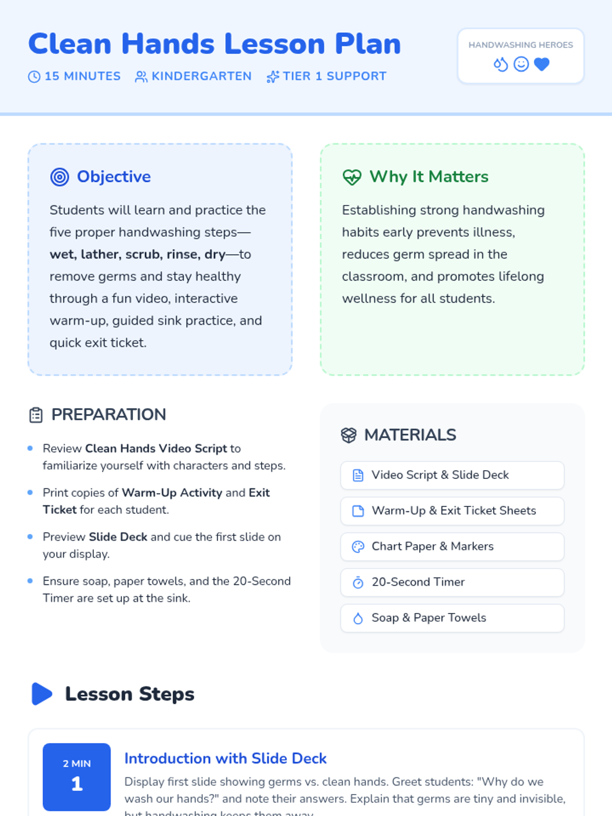 A comprehensive 2-day handwashing sequence for kindergarteners. Students learn essential hygiene habits through two fun adventures: first with Sunny the Soapie Bubble and Gigi the Germ, then with the Sparkle Splash adventure featuring a catchy song and coloring activities.