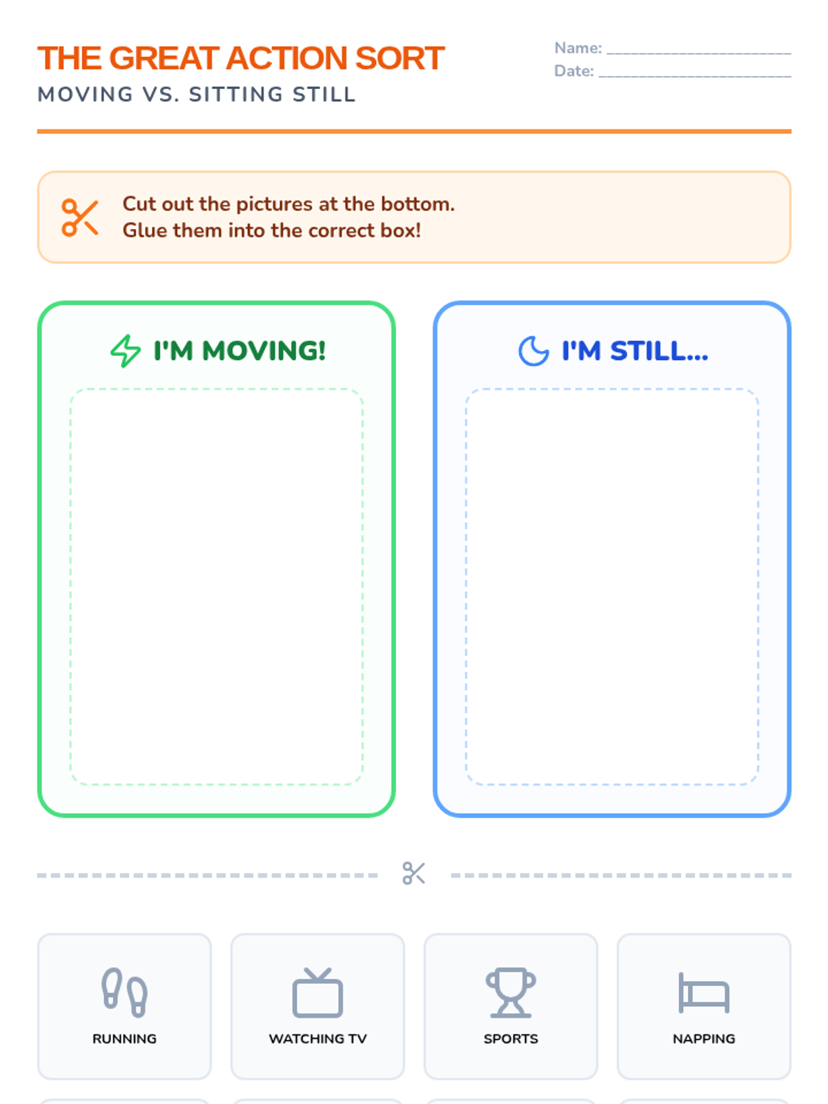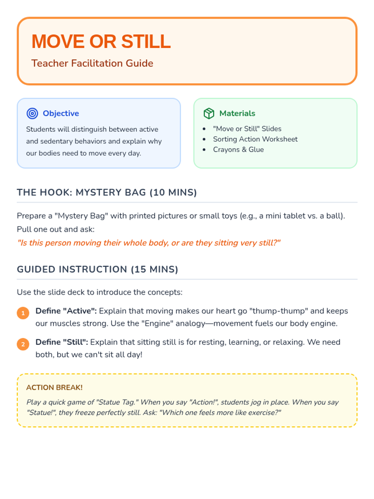 A comprehensive sequence for Kindergarteners to distinguish between sedentary and active behaviors, explore movement opportunities, and set personal activity goals through a 'Movement Menu' for home use.