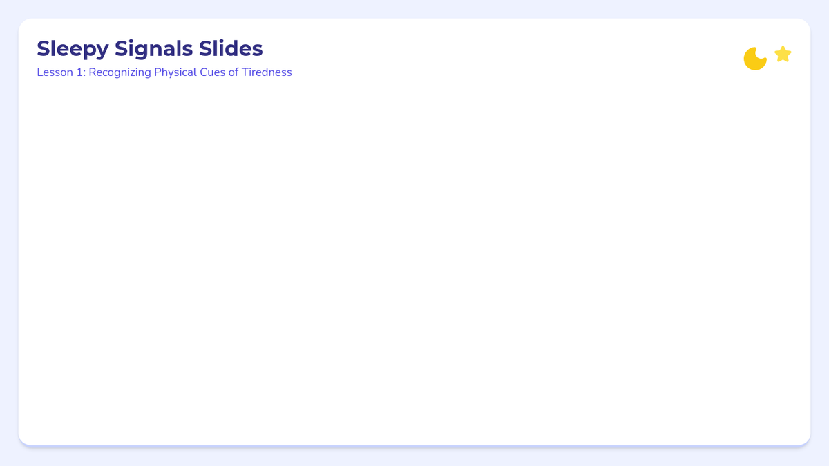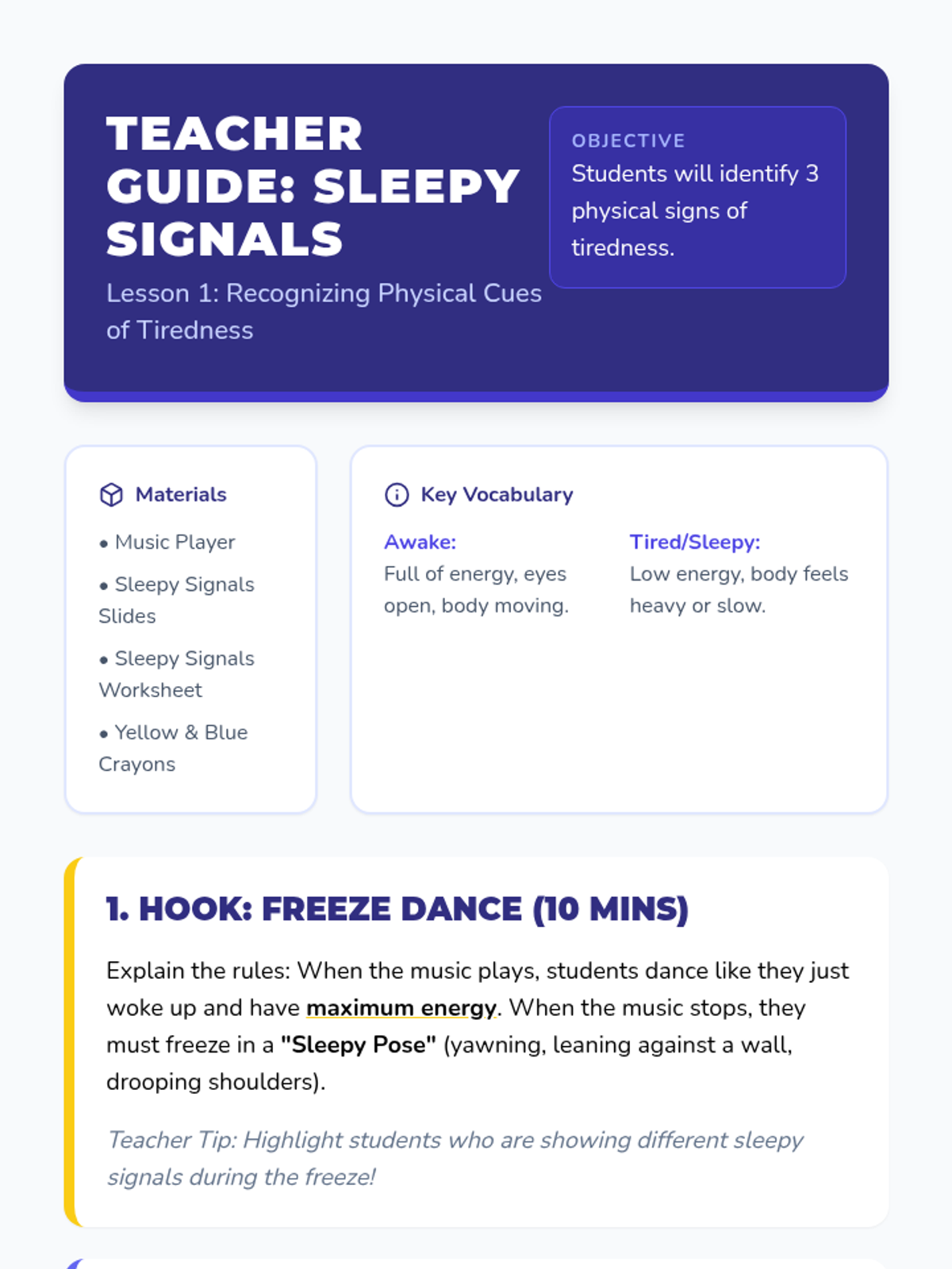 A Kindergarten Health sequence focusing on sleep hygiene. Students learn to recognize tiredness cues, sequence bedtime routines, curate sleep environments, practice calming techniques, and create a personal sleep plan.