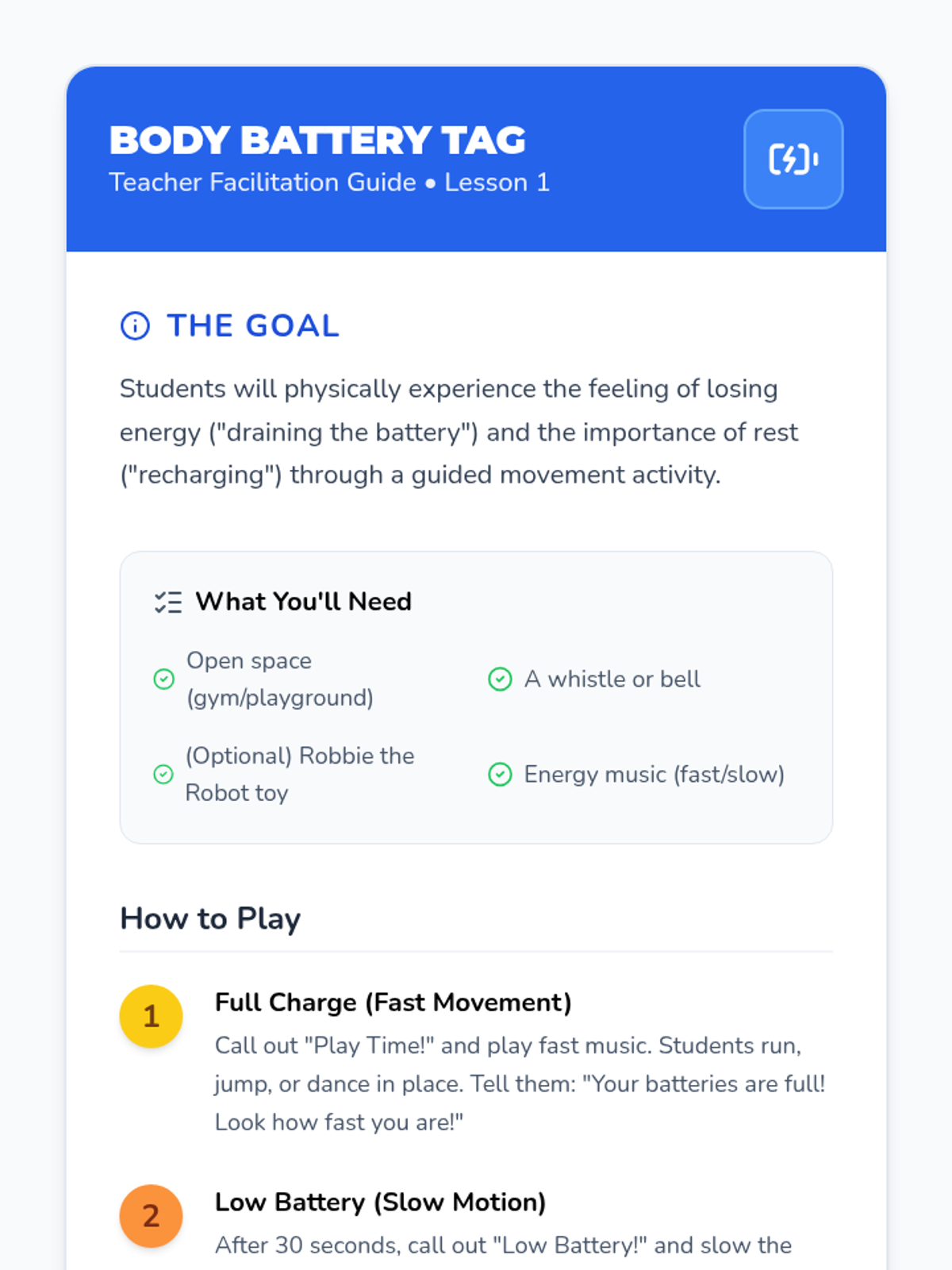 A Kindergarten sequence exploring the biological and emotional benefits of sleep through the analogy of a 'body battery'. Students learn how rest supports growth, mood, and daily function using games, sorting activities, and creative projects.