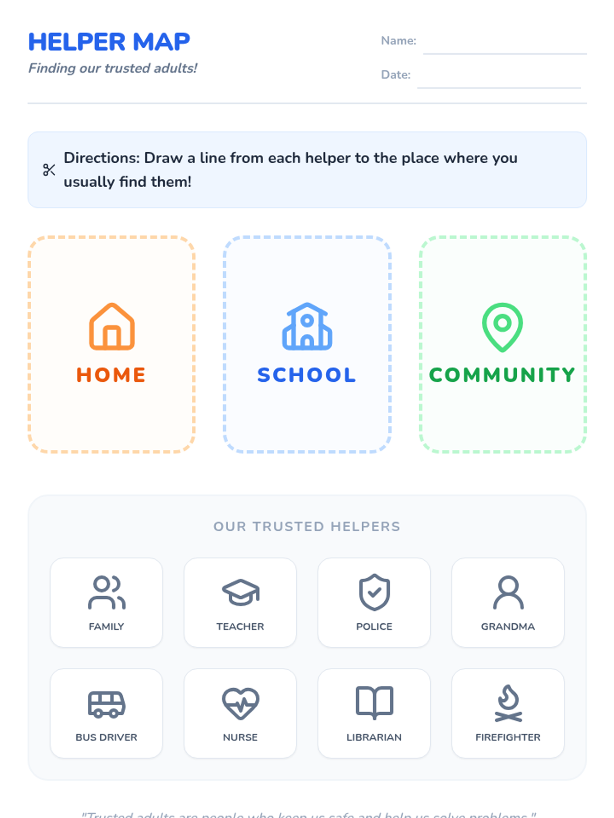 This Kindergarten sequence empowers students to recognize their intuition, identify trusted adults, distinguish between safe surprises and unsafe secrets, and practice seeking help persistently in various environments.