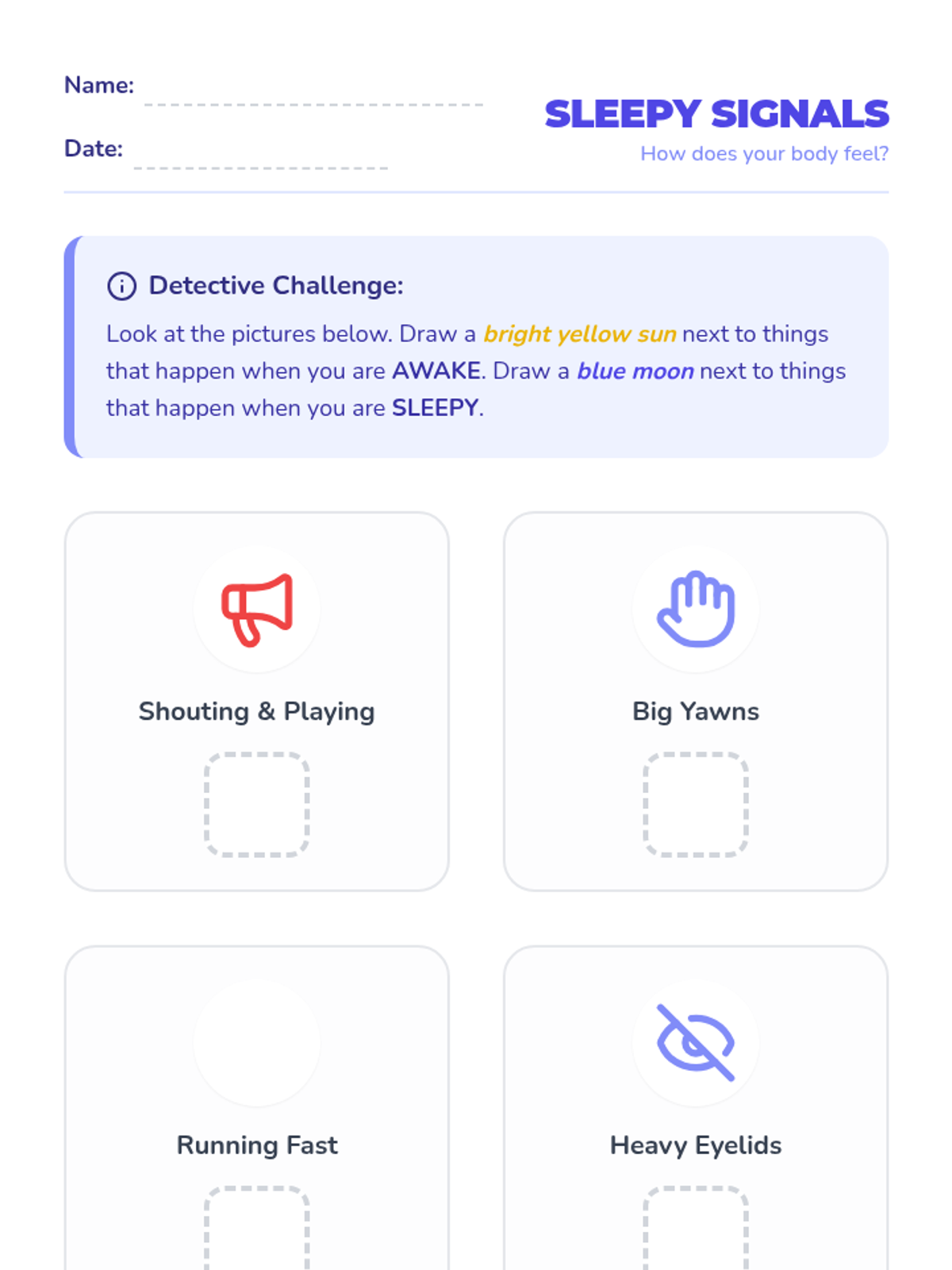 A Pre-K sequence focused on helping children understand their internal body clocks and the physical signs of tiredness. Students explore light and dark cycles, animal sleep patterns, and the metaphor of 'recharging' to develop self-awareness and healthy rest habits.