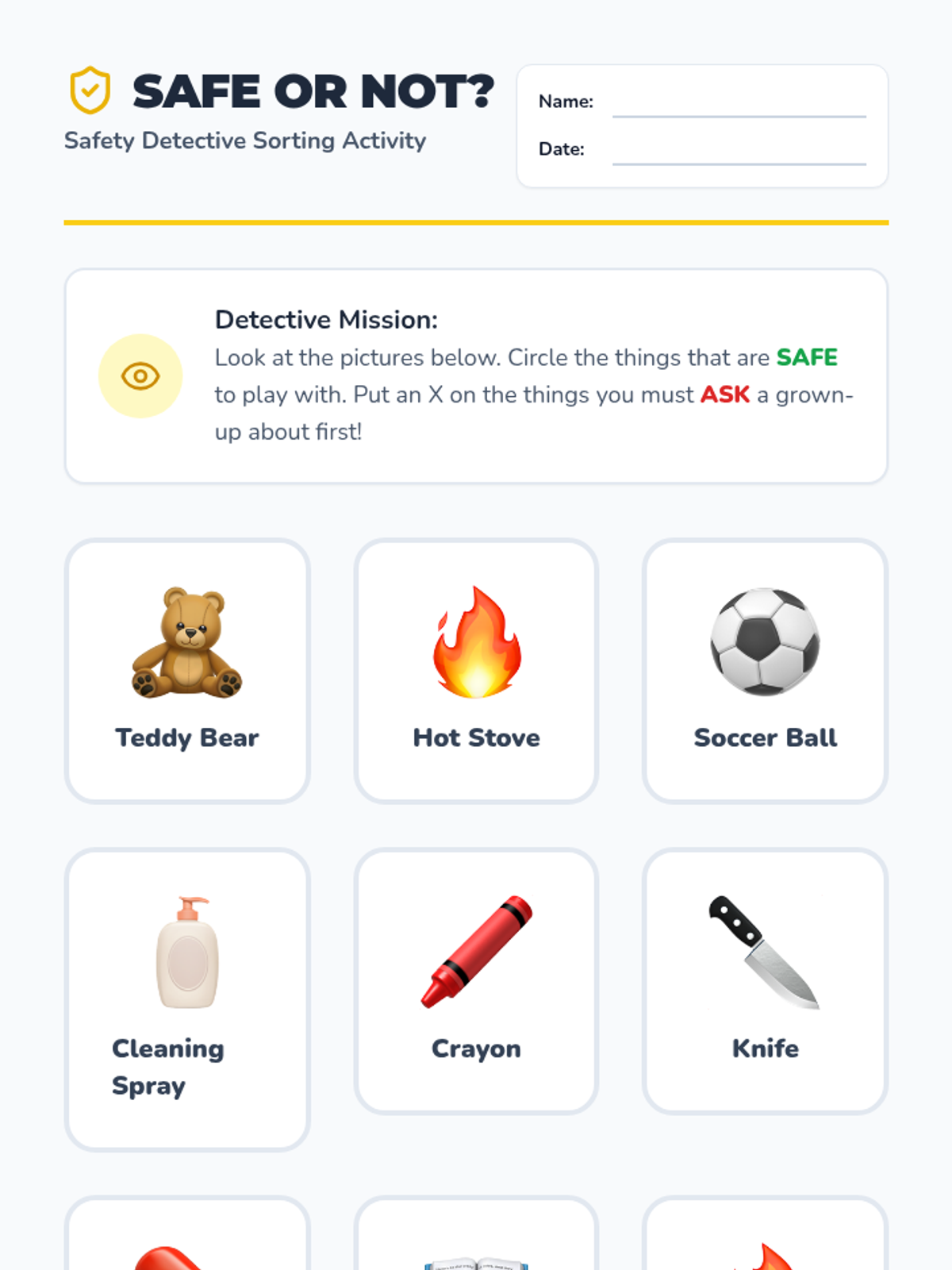 This Pre-K sequence empowers young learners to recognize environmental hazards and trust their physical intuition ('uh-oh' feelings). Students learn to categorize objects by safety, identify body signals, spot playground risks, set personal boundaries, and identify trusted helpers through interactive 'Safety Detective' activities.
