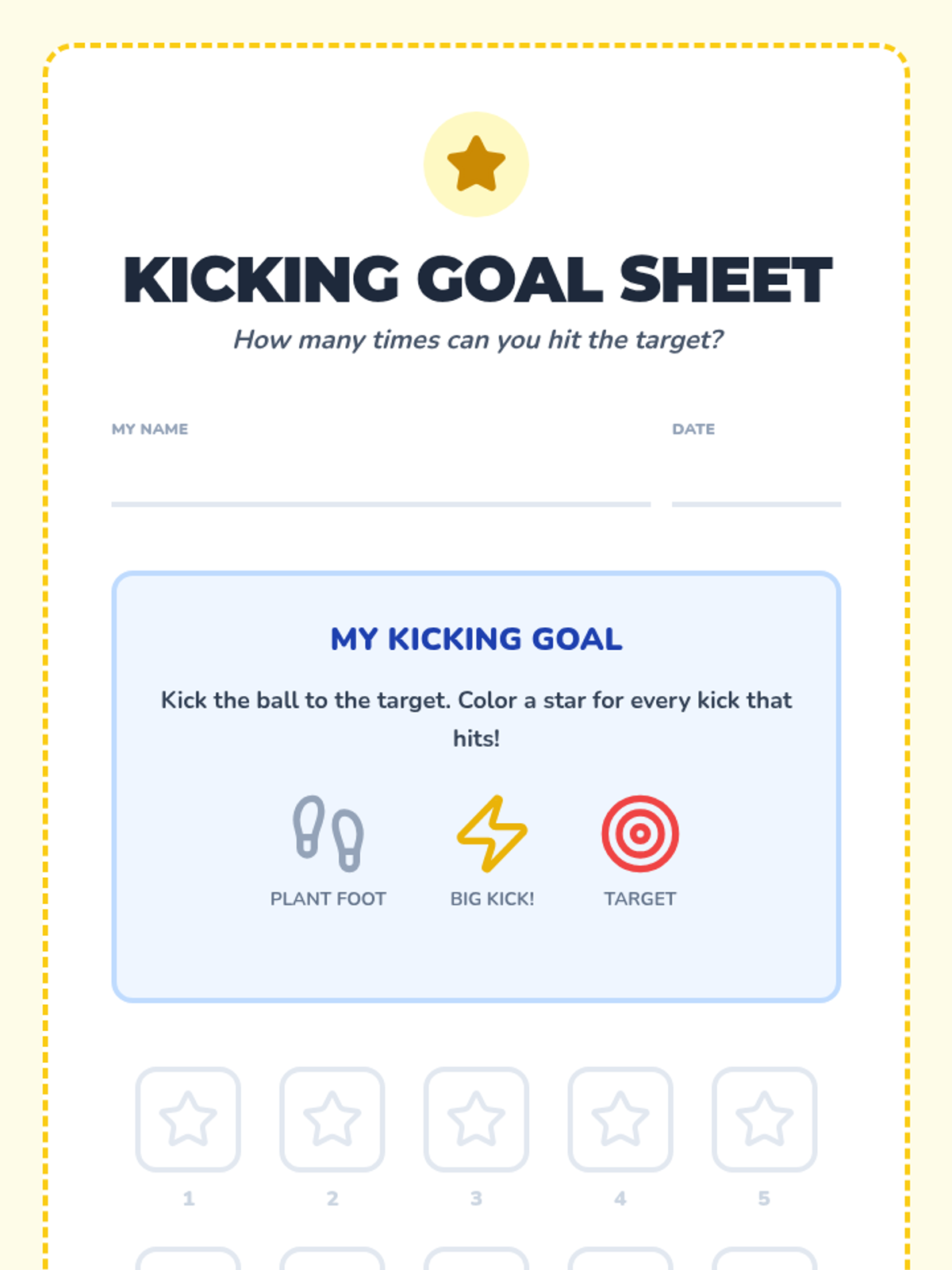 A fun, active sequence for Pre-K students focused on the fundamentals of kicking a soccer ball, from foot placement to target accuracy and sportsmanship.