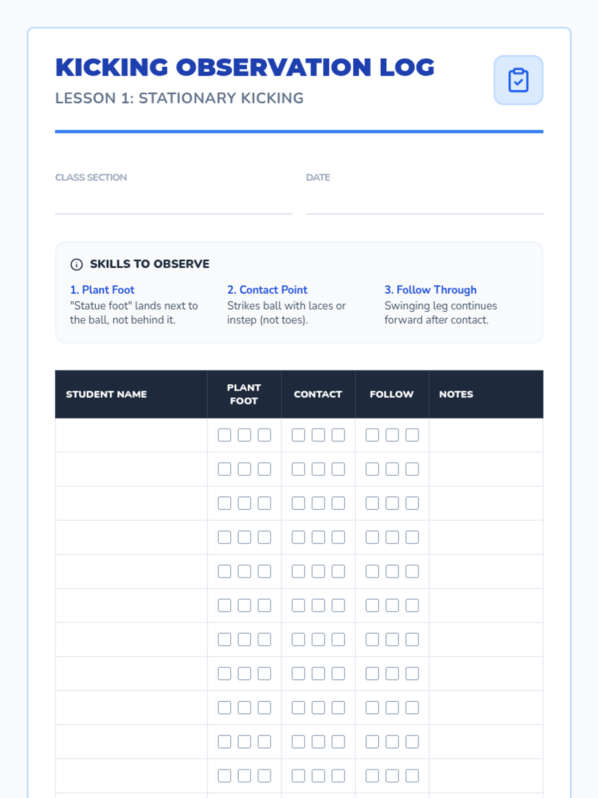 A comprehensive physical education sequence for Kindergarten students focusing on lower-body and implement manipulation. Students develop kicking, dribbling, and striking skills through play-based activities and structured skill-building drills.