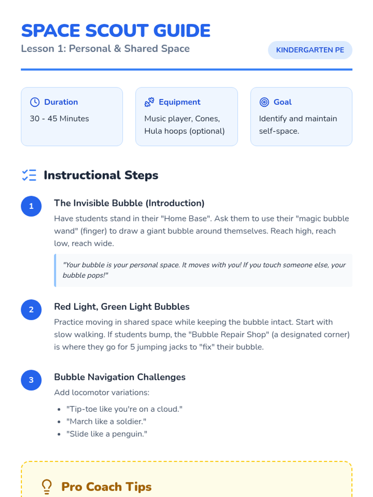 A Kindergarten sequence focused on developing spatial awareness through 'space bubbles' and progressing to complex group coordination activities like parachute play. Students learn to navigate their environment safely and move in harmony with peers.