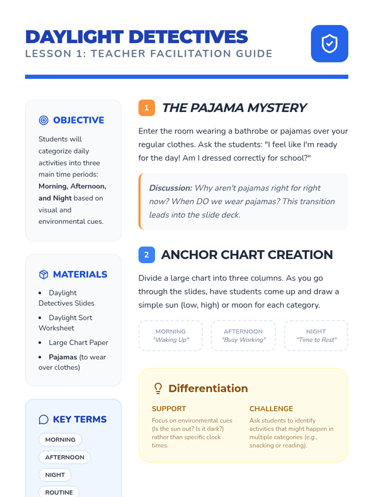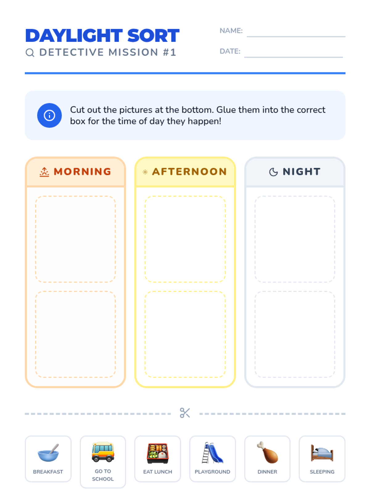 A Kindergarten sequence focused on understanding the concept of time through daily routines and the logical order of events. Students learn to categorize times of day, sequence school routines, use temporal language, and understand the importance of order.