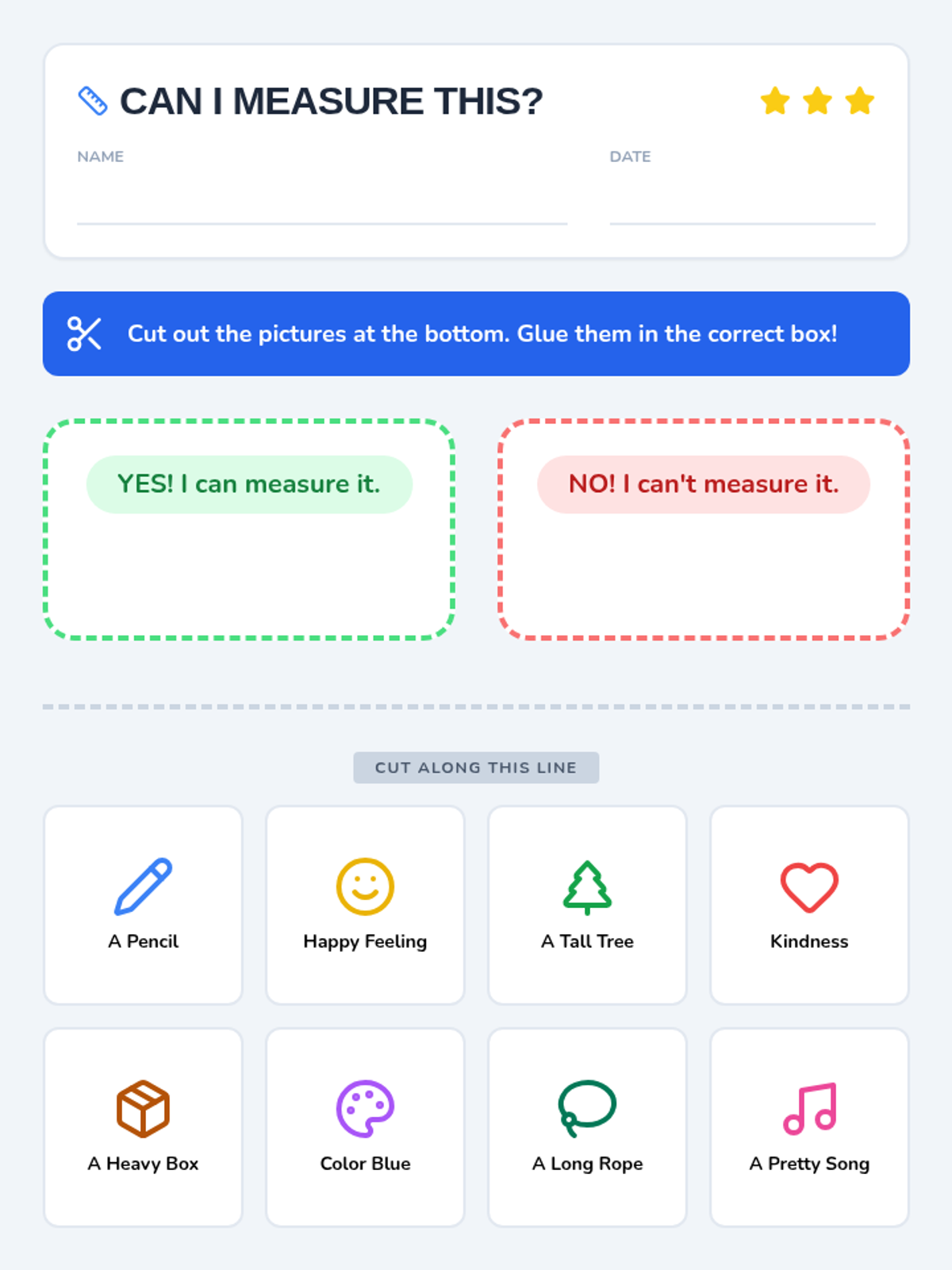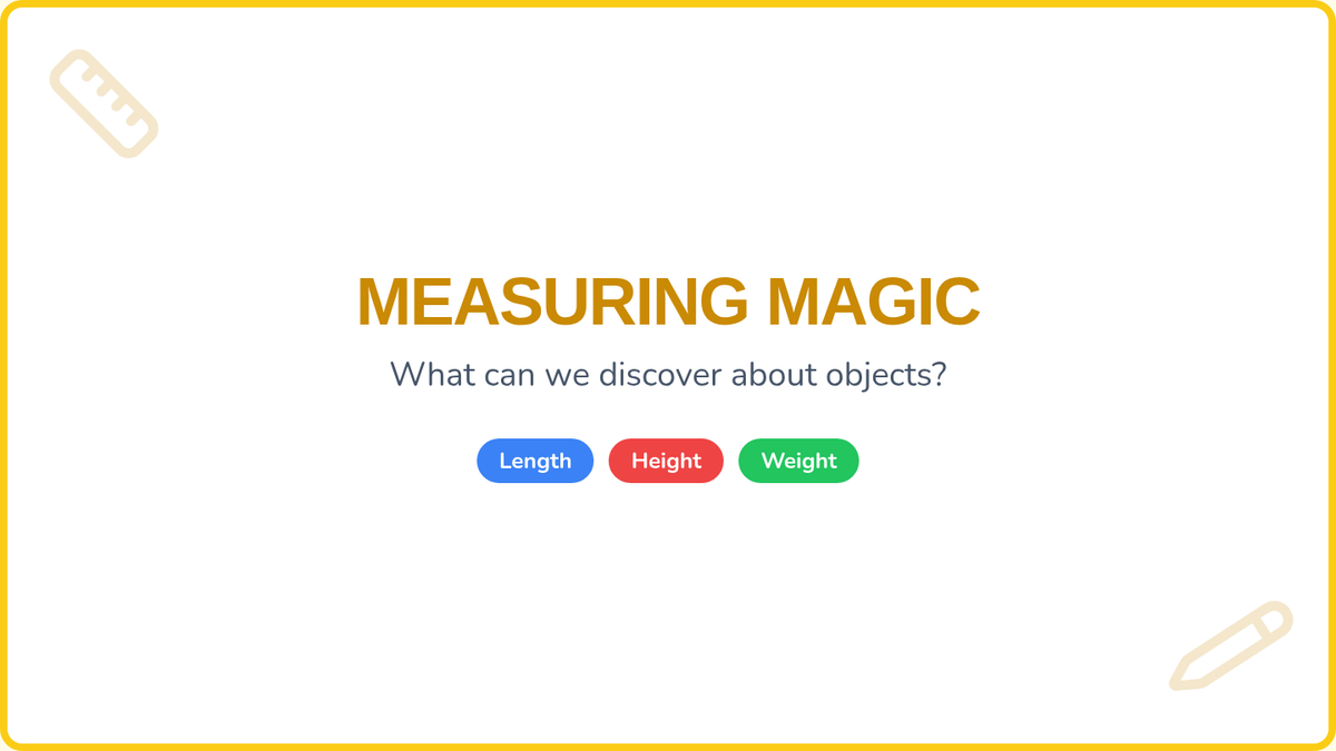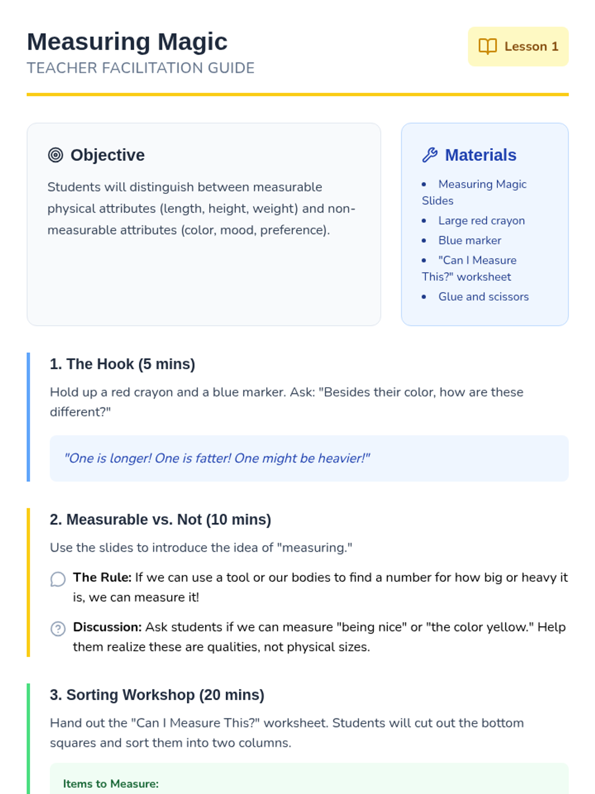 A foundational introduction to measurement for Kindergarten students, focusing on identifying measurable attributes and using direct comparison vocabulary like 'longer,' 'shorter,' 'taller,' and 'same.' Students will move from understanding what can be measured to accurately comparing objects using a common baseline.