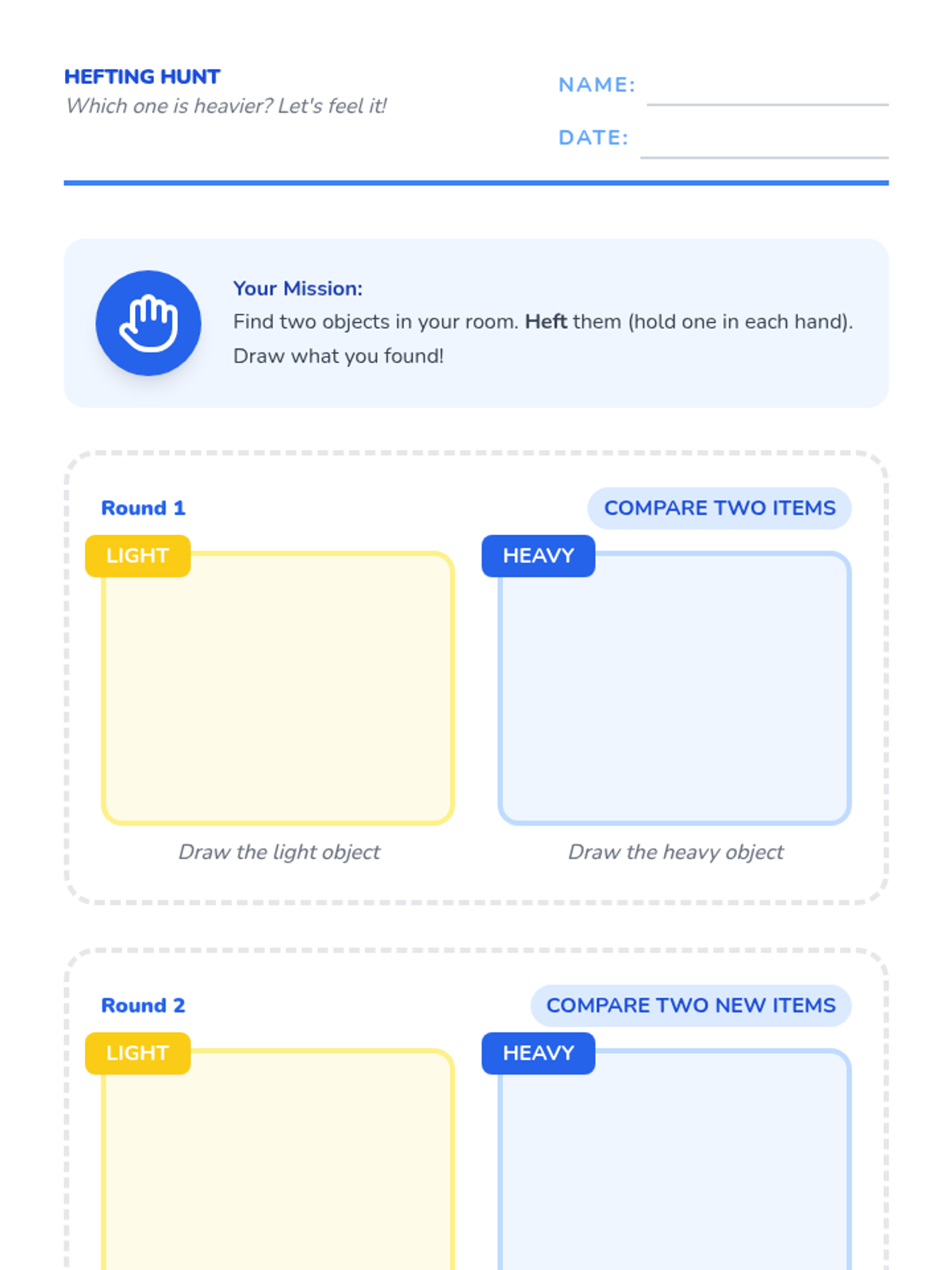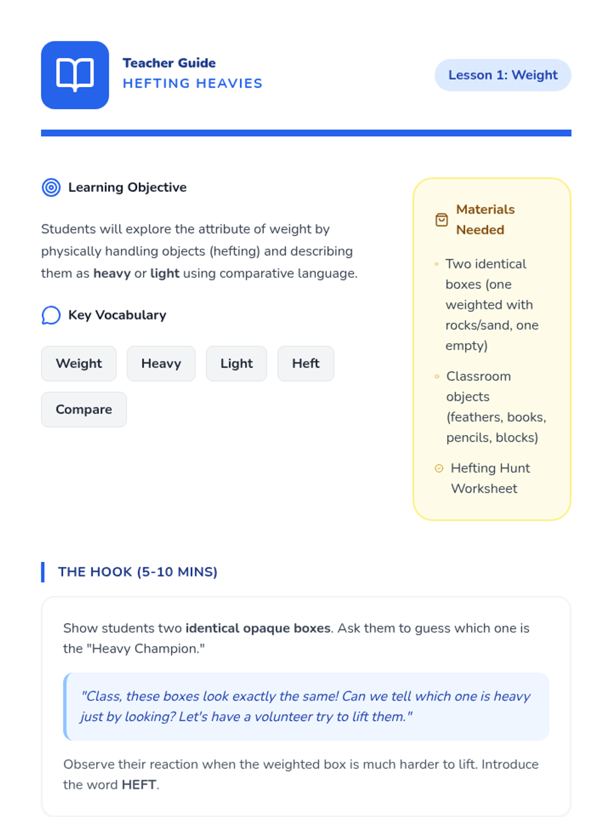 A Pre-K sequence focused on introducing the concept of weight through sensory exploration, tools, and scientific prediction. Students learn to distinguish between 'heavy' and 'light' using their hands and balance scales.