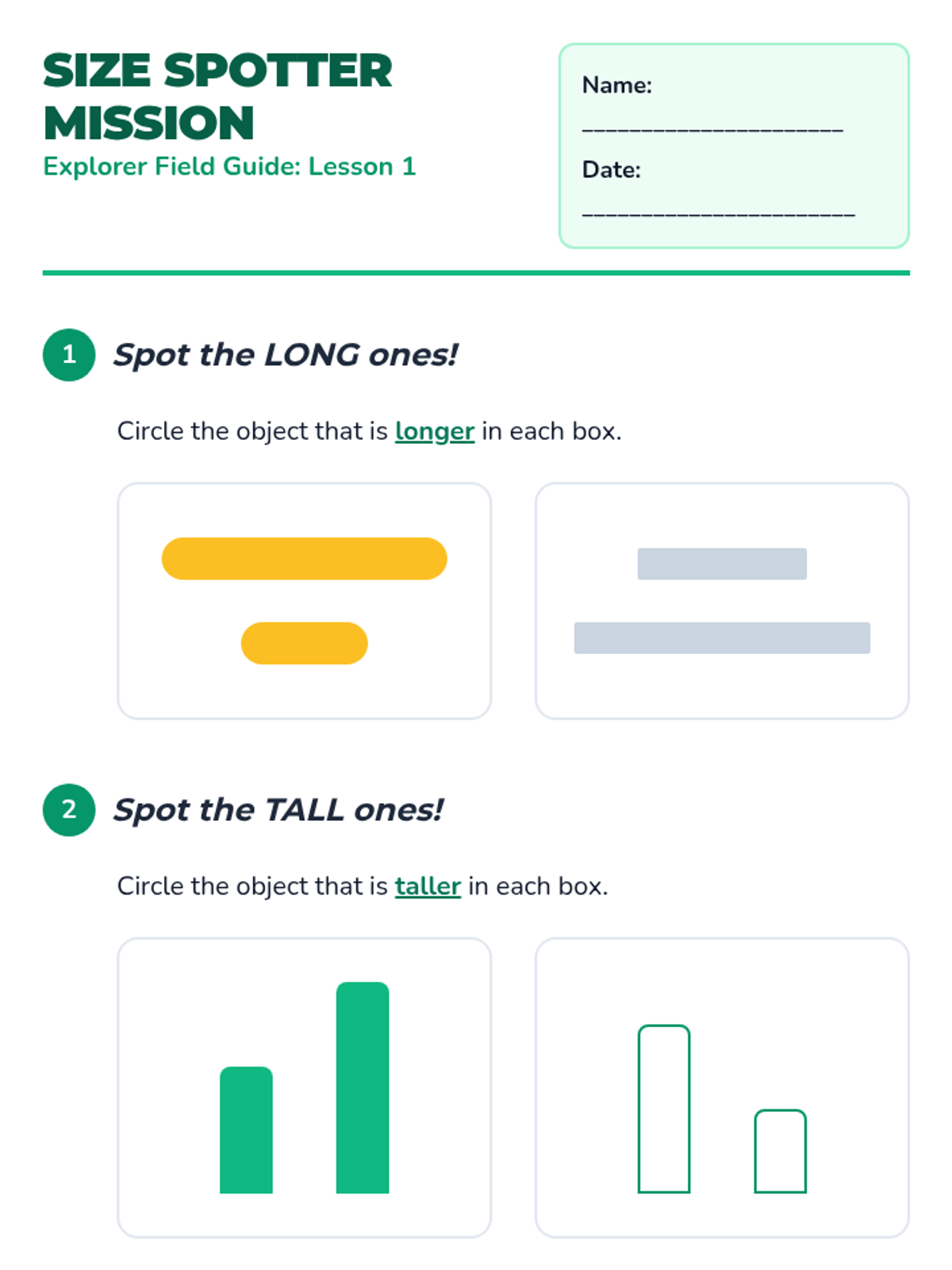 A Pre-K sequence introducing length and height through direct comparison, seriation, and non-standard measurement using the theme of 'Little Explorers'. Students learn to align endpoints and use vocabulary like taller, shorter, and longer.