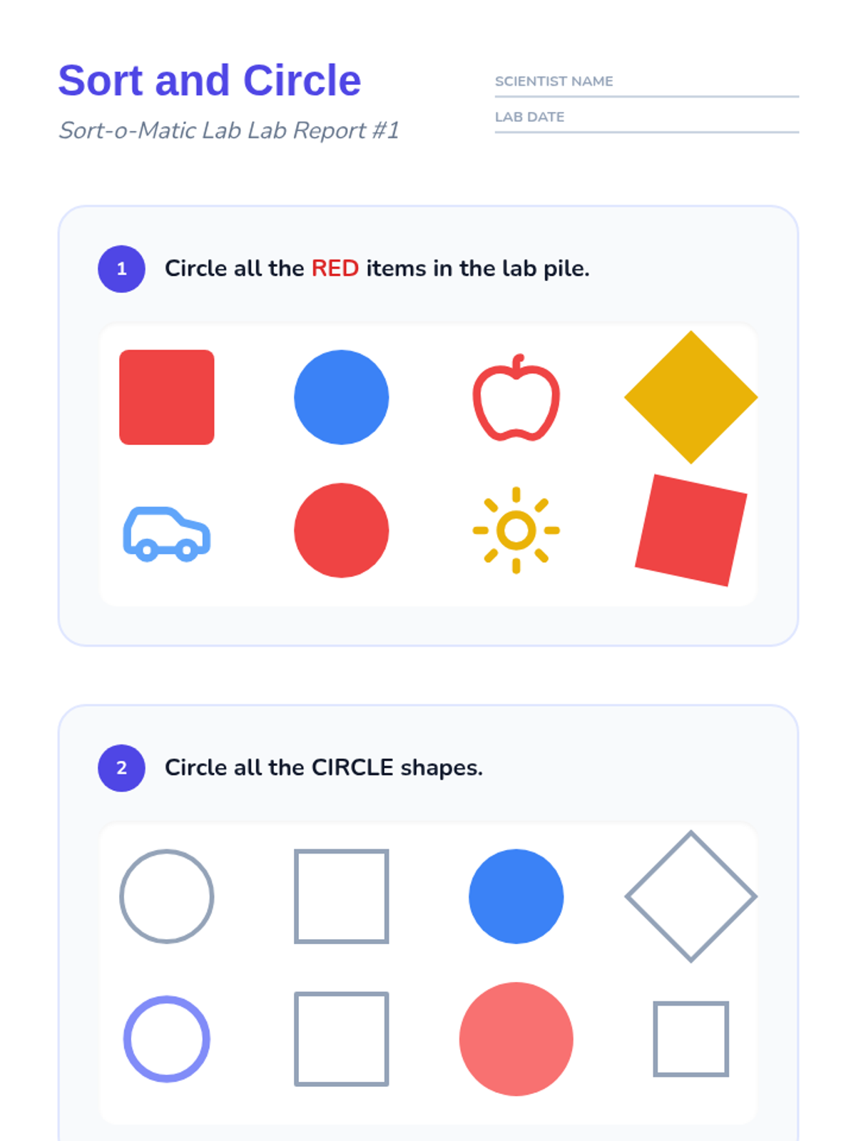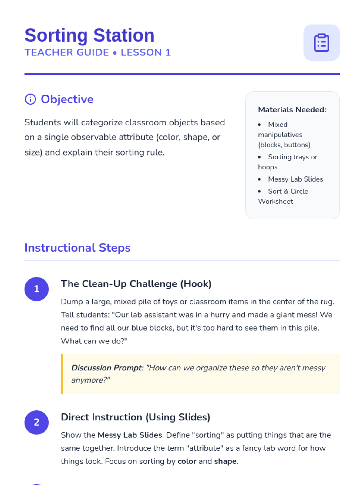 This sequence introduces Kindergarten students to sorting and classifying objects by attributes. They learn to group items by color, shape, size, and texture, explore flexible thinking by re-sorting the same set, and begin quantifying data by counting categories.