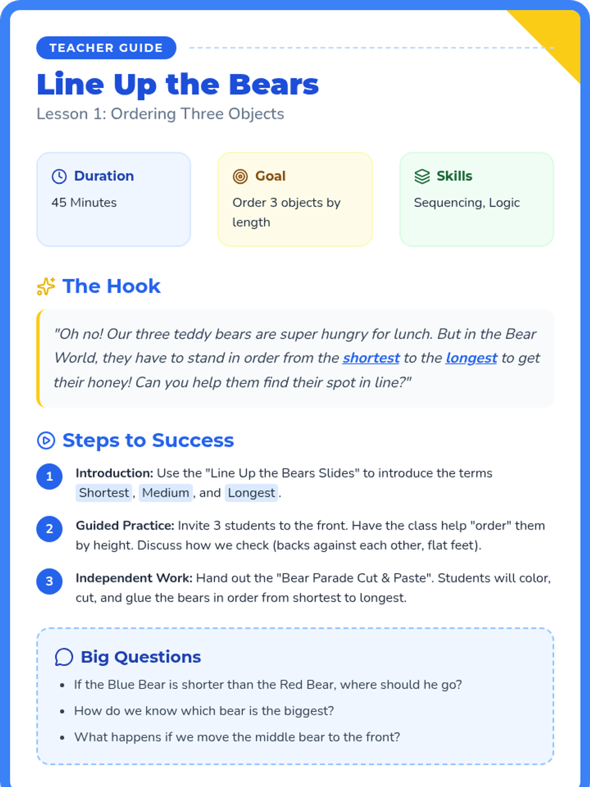 A Kindergarten sequence introducing length and height through hands-on comparison, focusing on vocabulary, alignment, and ordering three objects. Students explore these attributes through a 'Measure Explorers' theme.