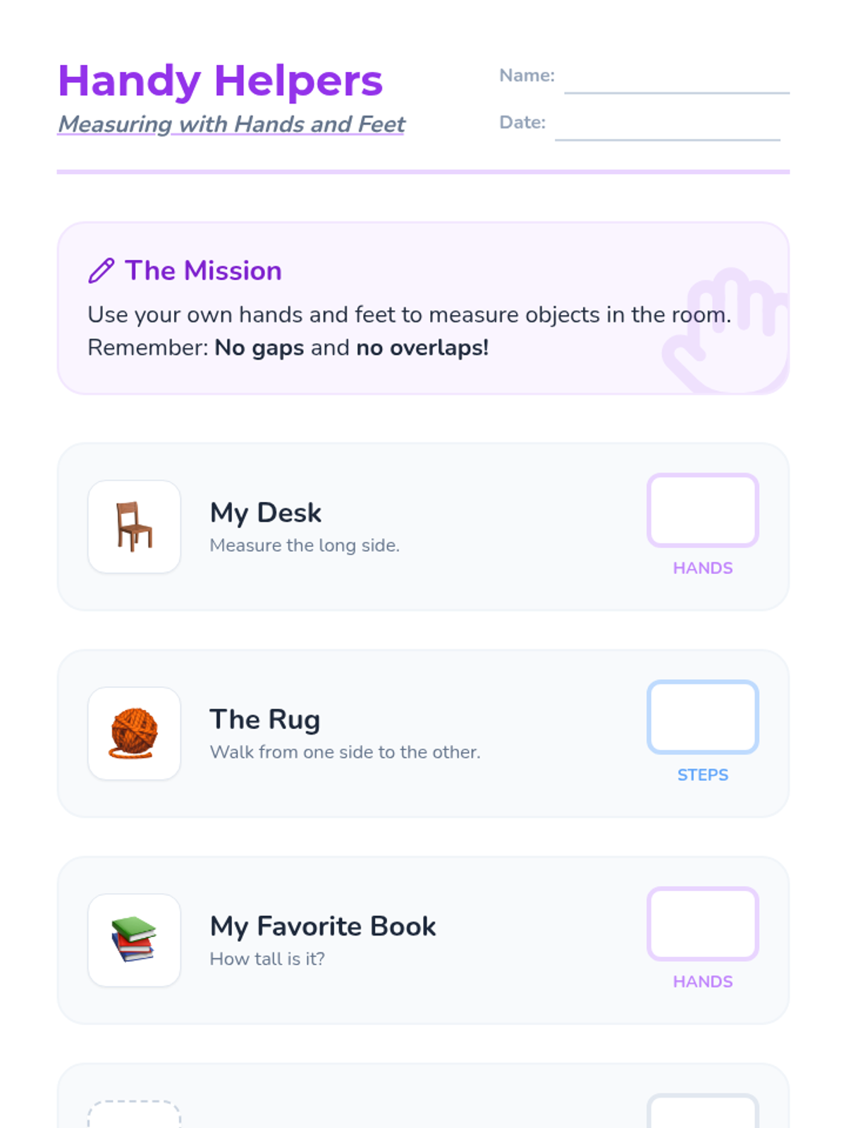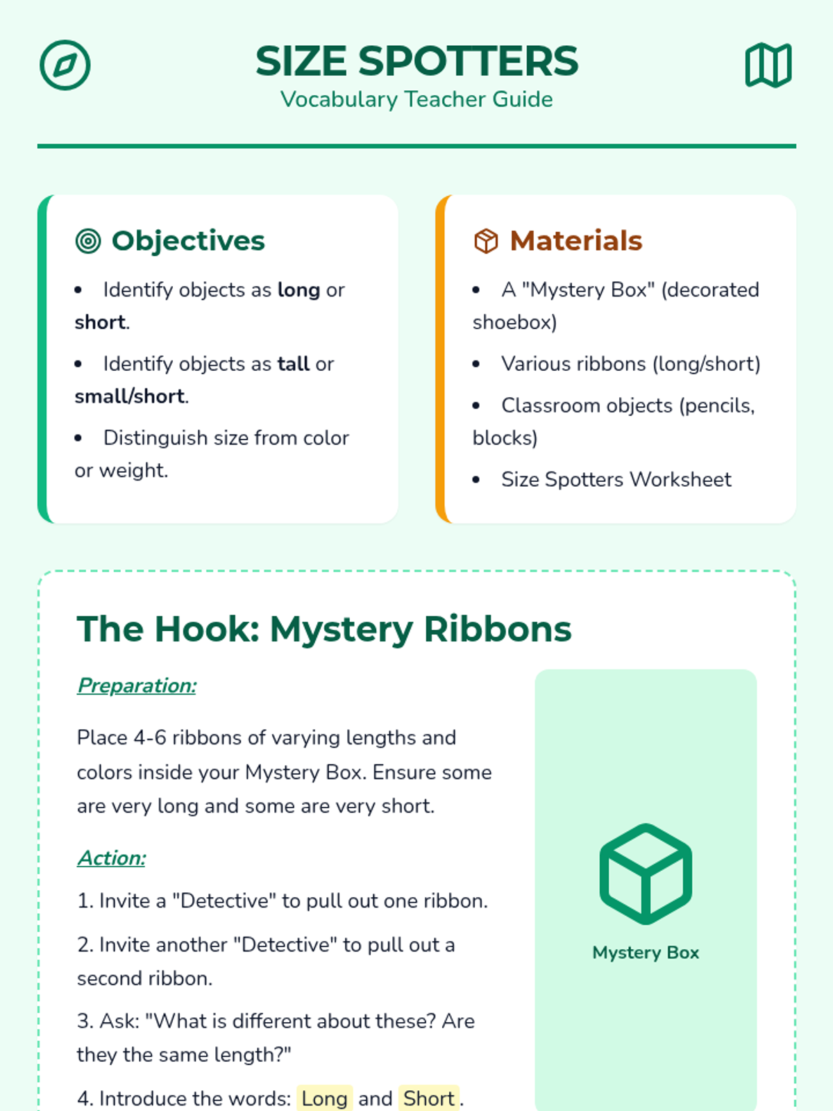 A hands-on Pre-K sequence where students explore length, weight, and capacity through sensory-rich experiences. Students move from general descriptors to specific comparative vocabulary like 'longer,' 'heavier,' and 'full.'