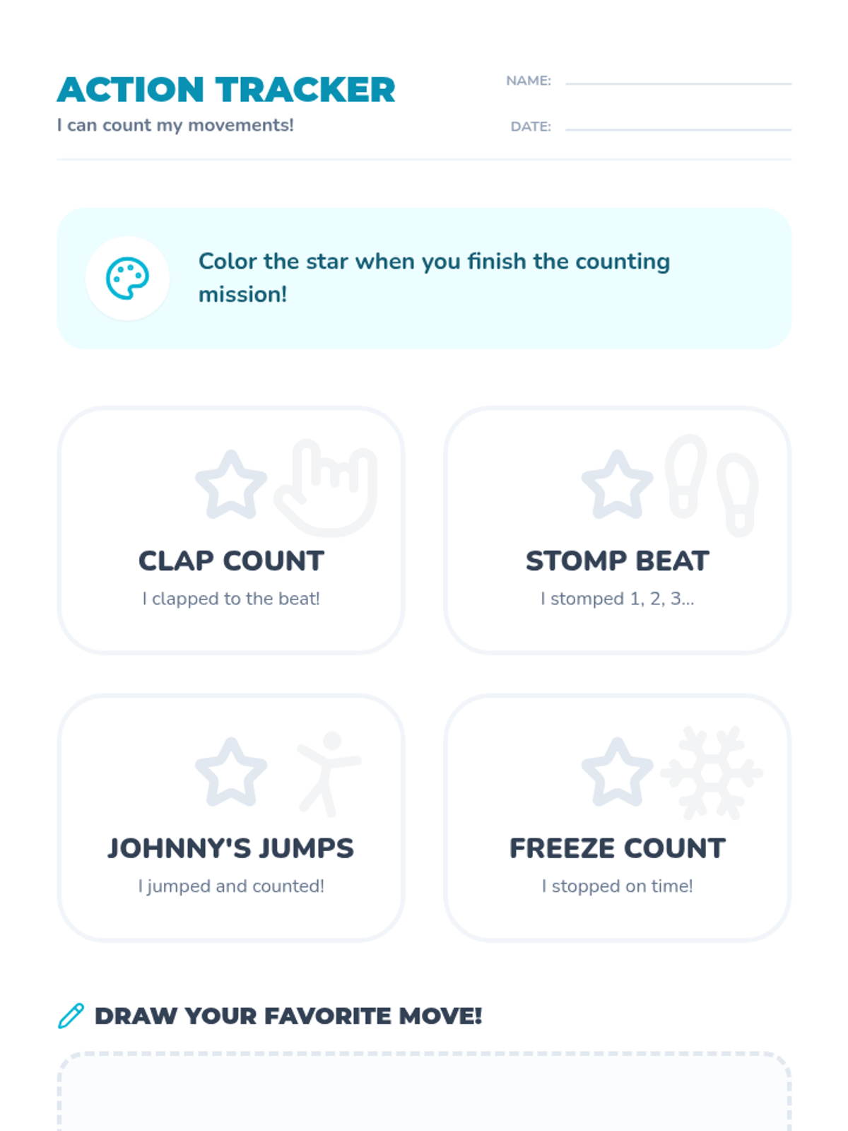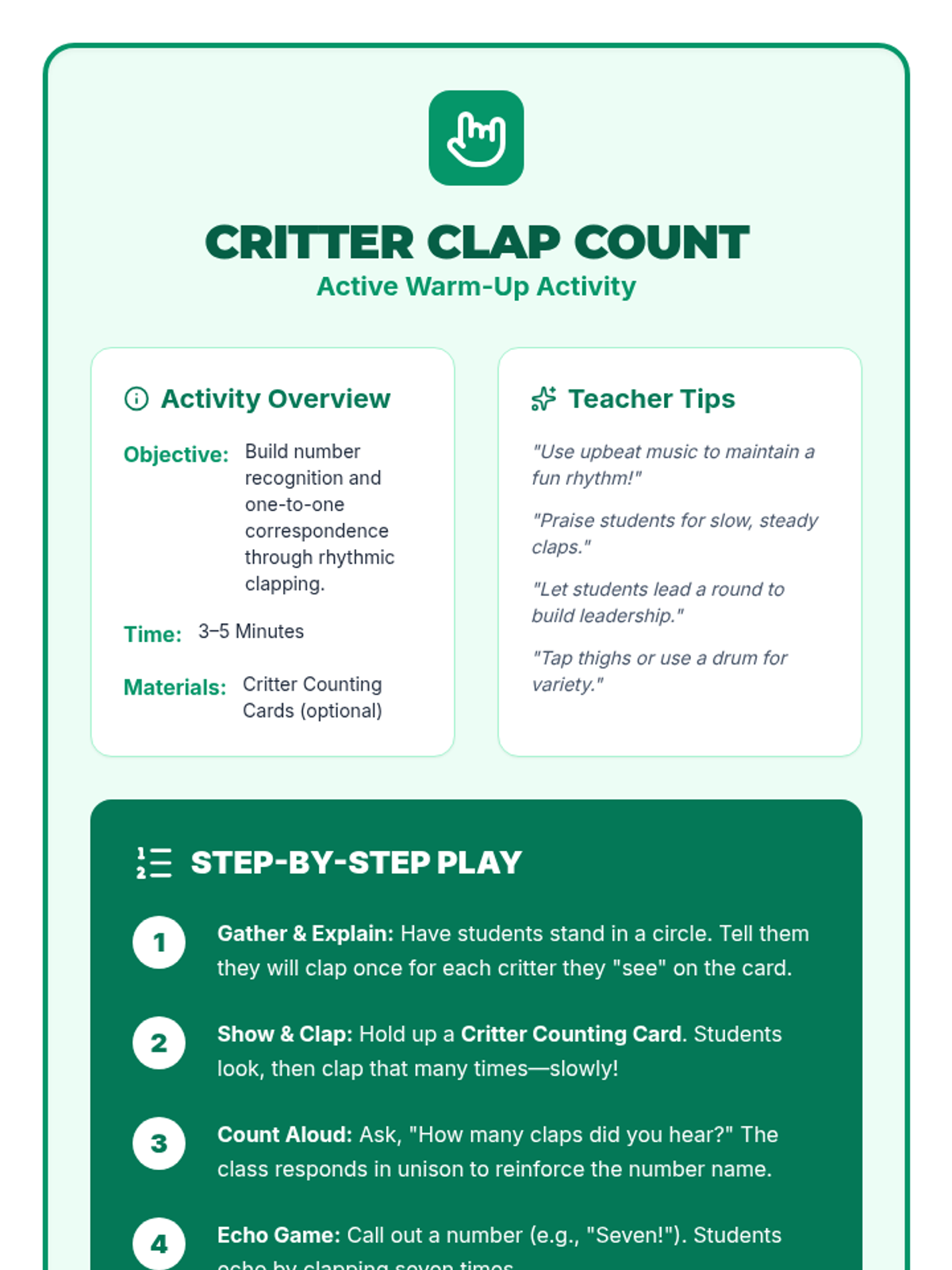A foundational Pre-K numeracy sequence that guides students from rote oral counting to understanding one-to-one correspondence, cardinality, and backward counting through immersive, play-based activities.