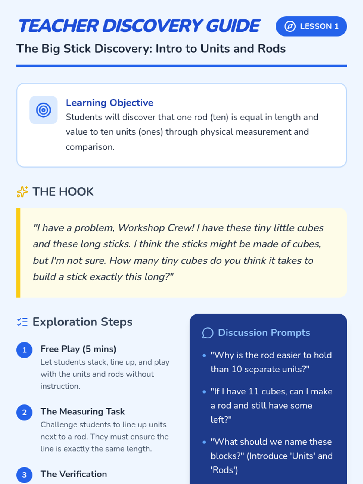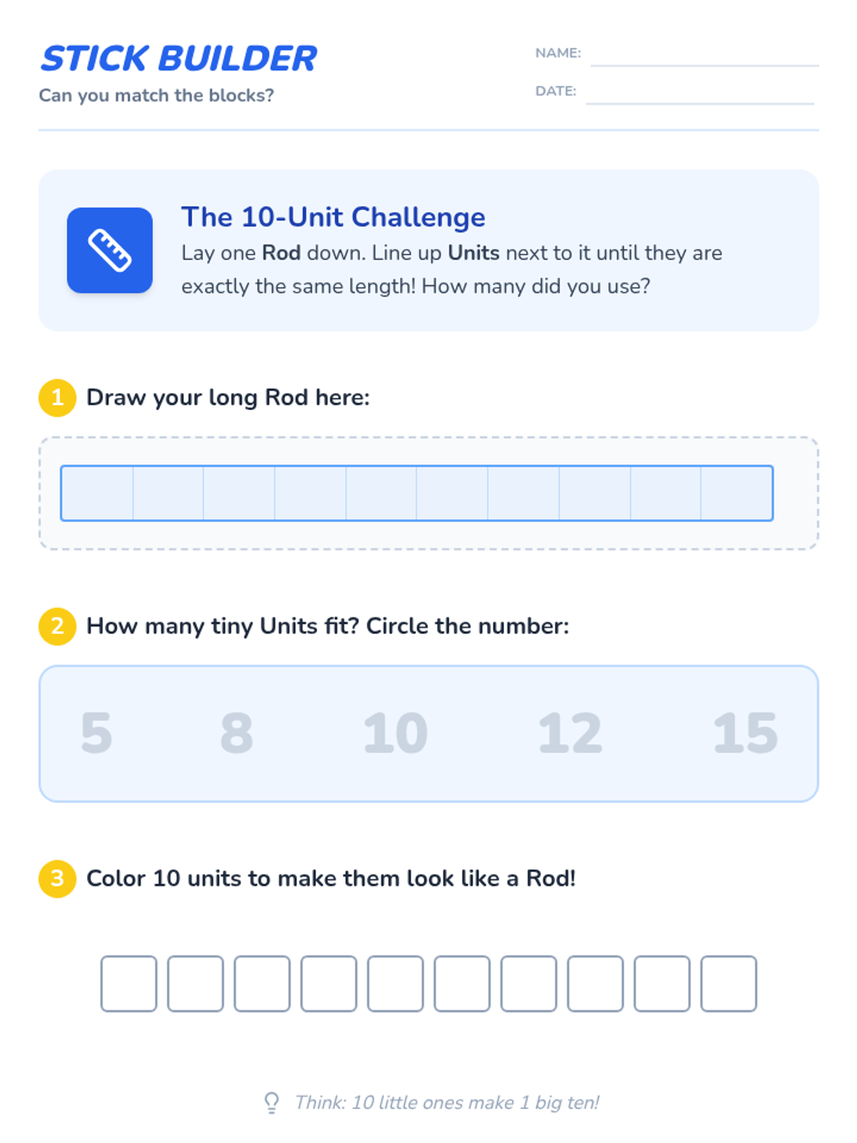This kindergarten sequence introduces base-ten blocks (units and rods) through hands-on play and games. Students discover the relationship between ones and tens, practice efficient number building, and learn to 'trade' (regroup) and 'break' (decompose) blocks to prepare for multi-digit arithmetic.