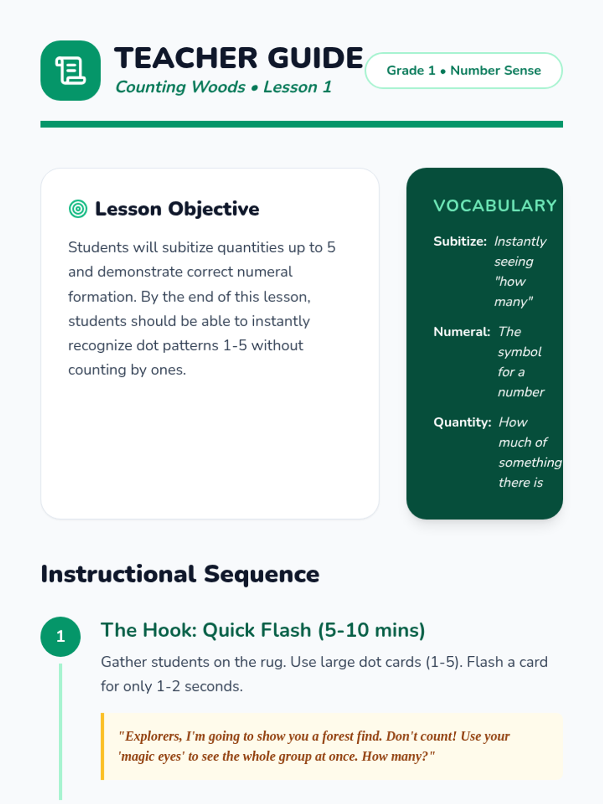 This foundational workshop sequence reinforces the critical connection between abstract numerals, spoken number words, and concrete quantities for numbers 0-10 using the 'Counting Woods' theme. Students progress from subitizing 1-5 to mastering ten-frames for 6-10, understanding zero, and finally ordering and comparing quantities in a culminating project.