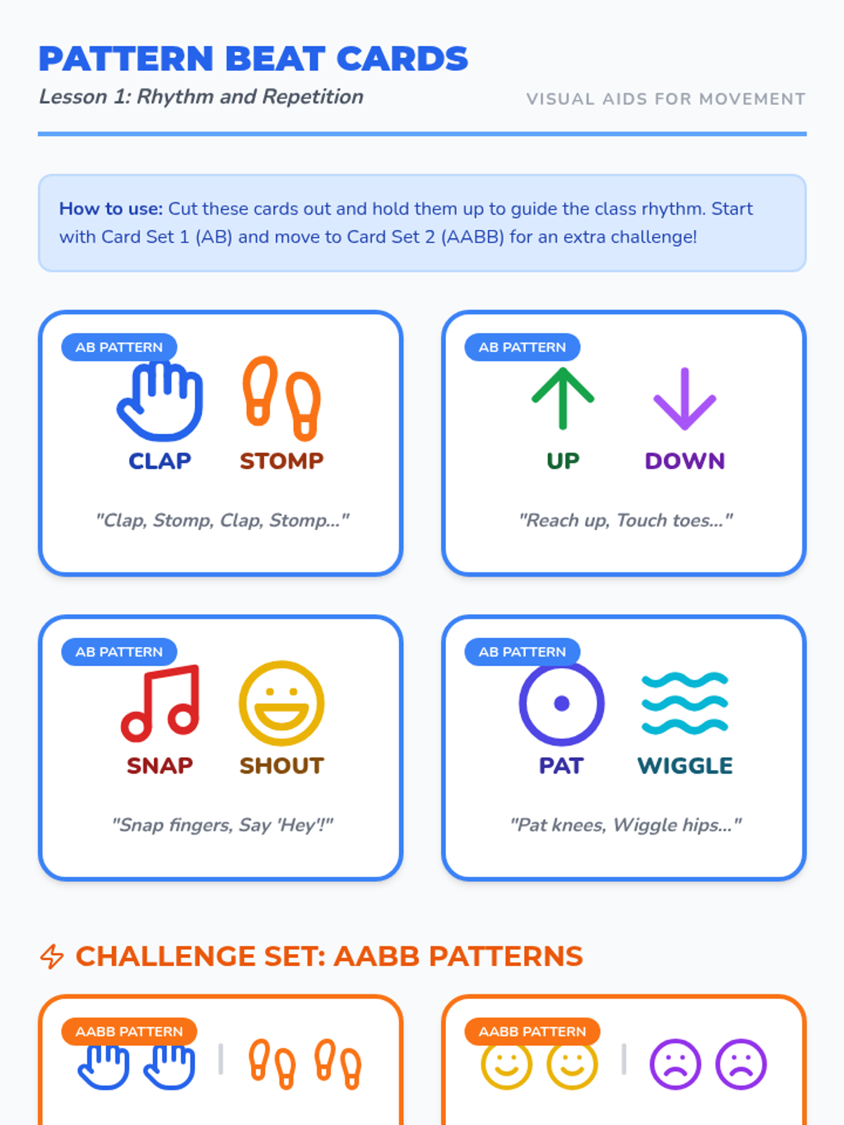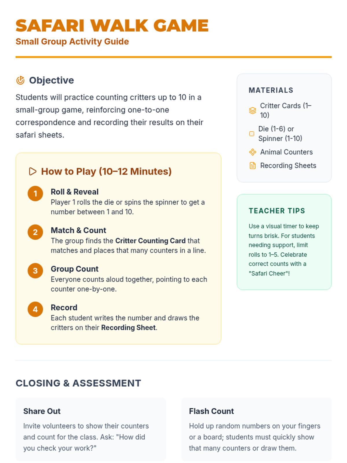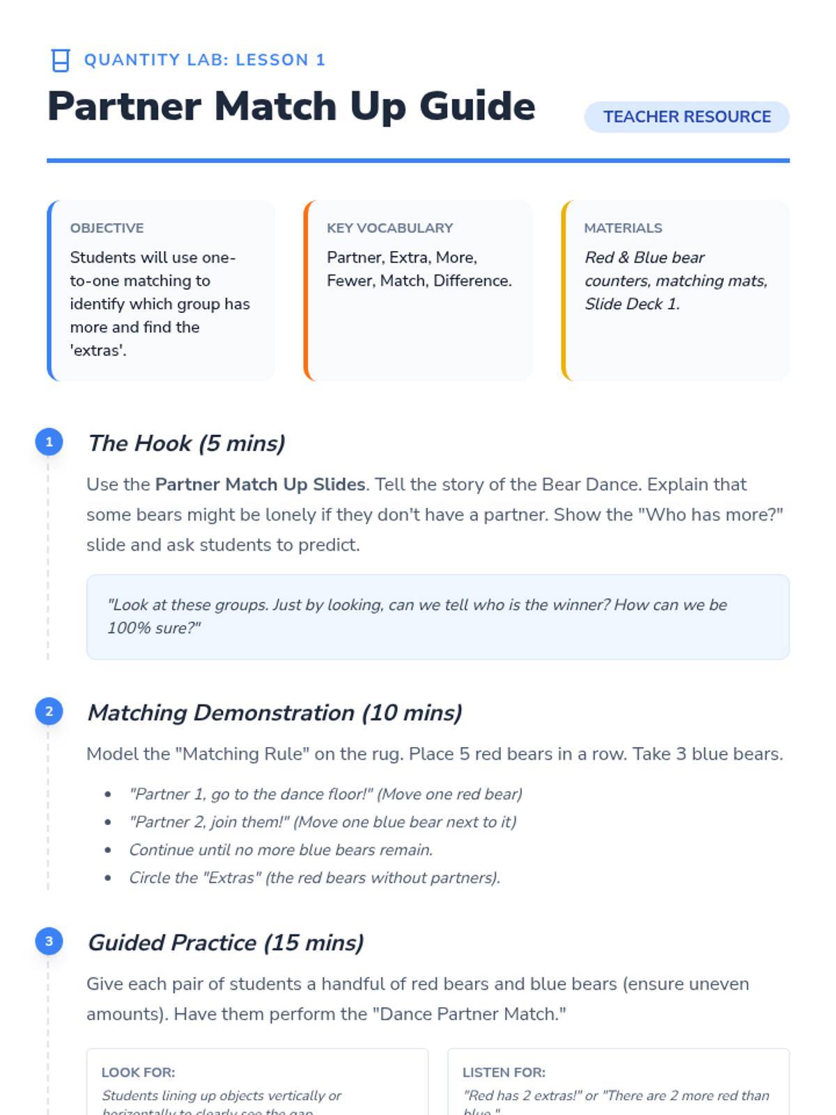 This sequence introduces Pre-K students to the concept of zero and the written names of numbers 1-3. It bridges math and literacy through storytelling, environmental print awareness, and rhythmic activities.