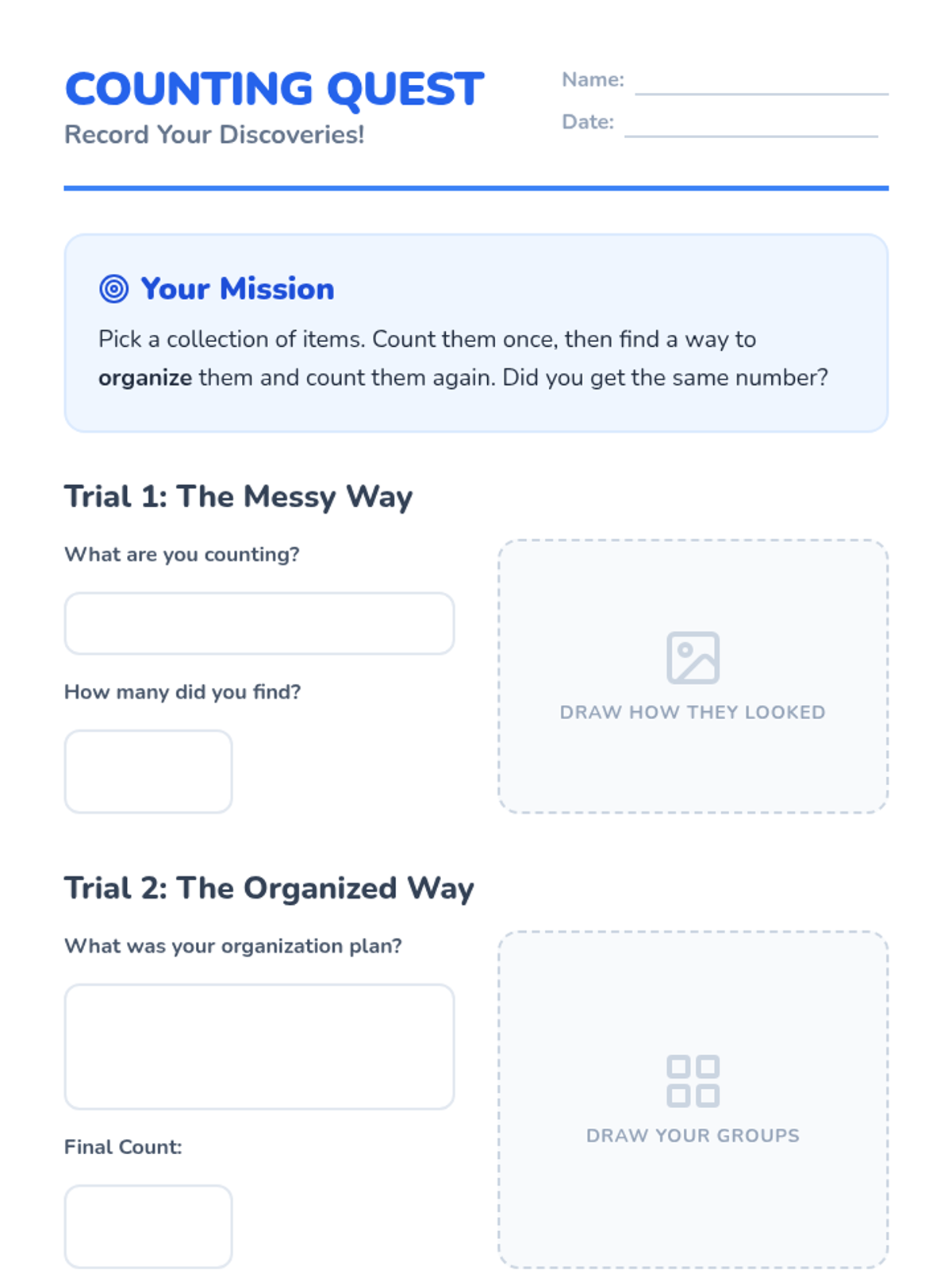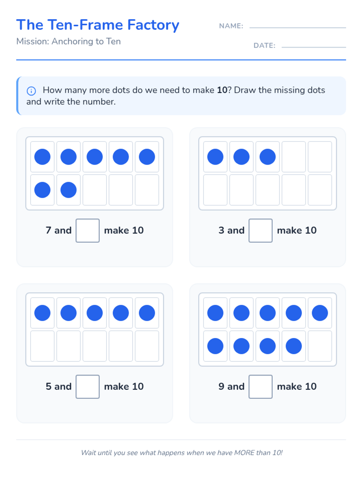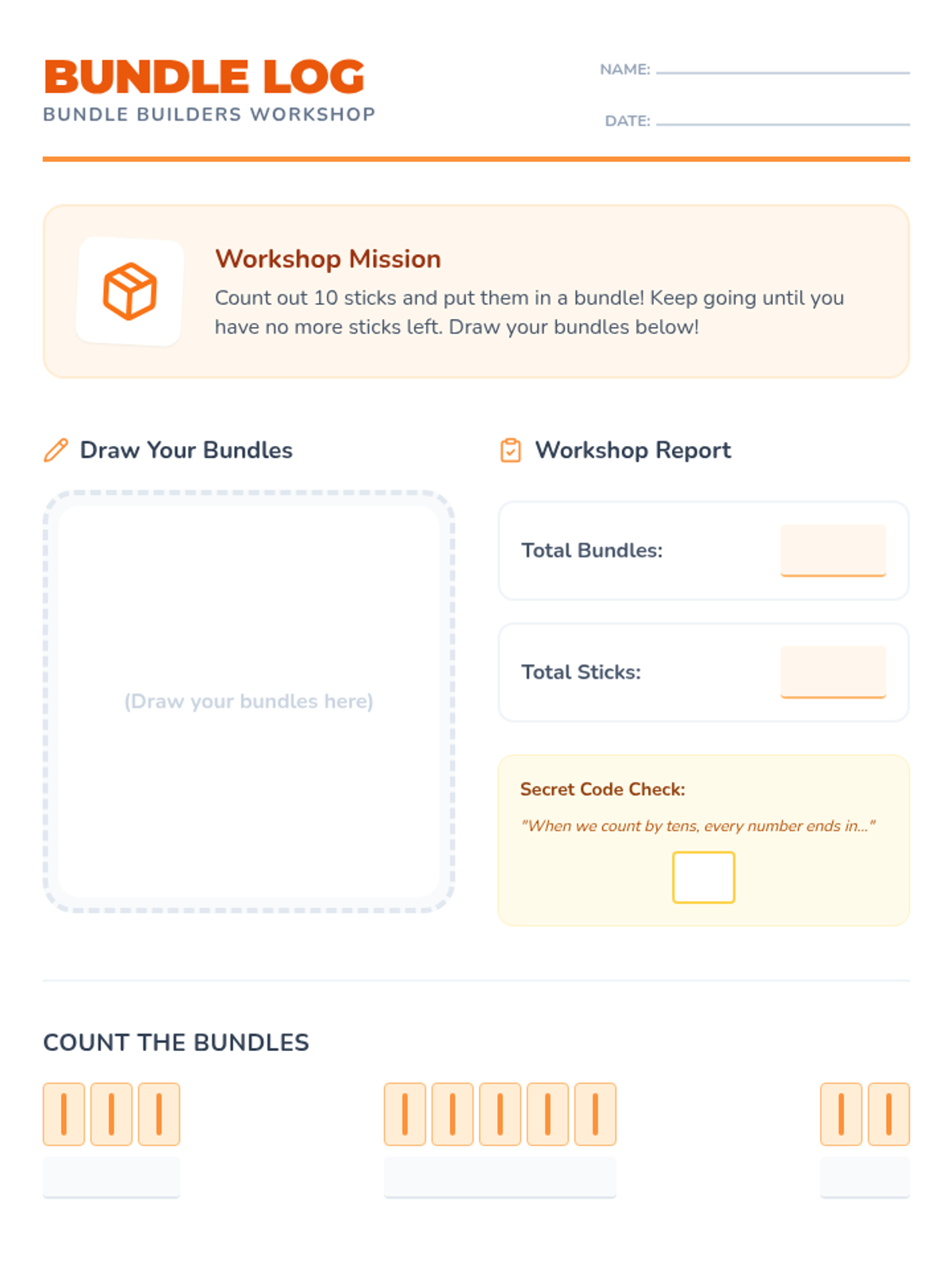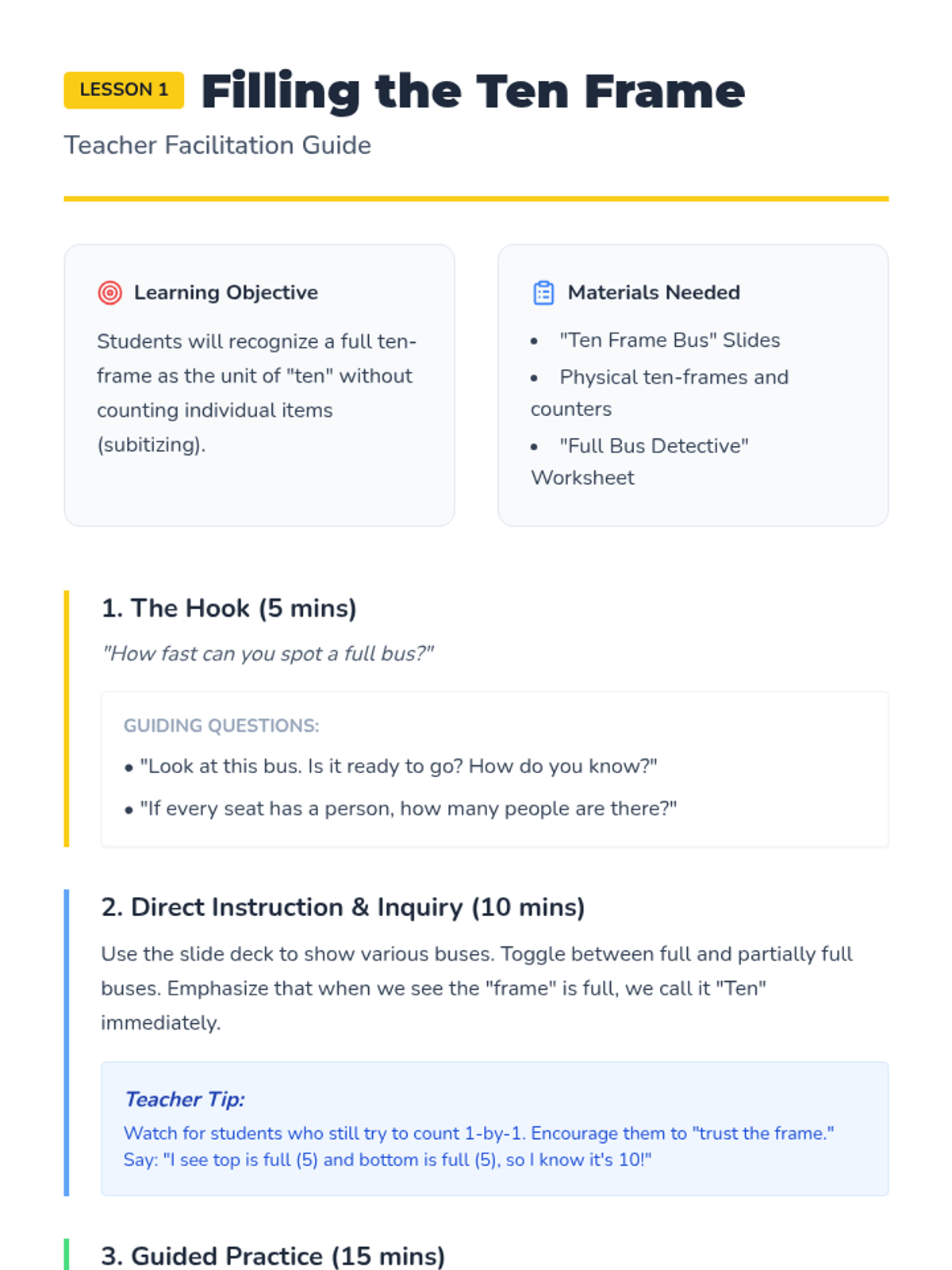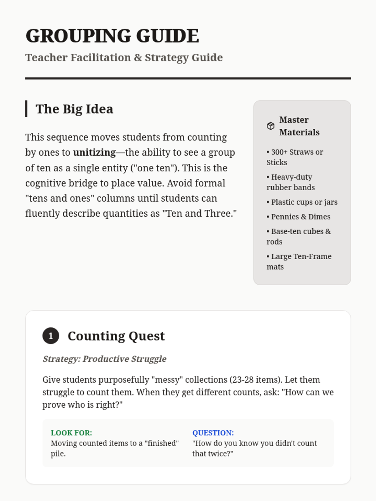 An inquiry-based introduction to grouping items into sets of ten for Kindergarten. Students progress from counting by ones to creating bundles, trading for units, and visualizing quantities using ten frames.