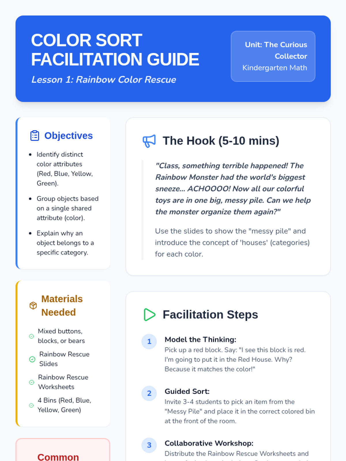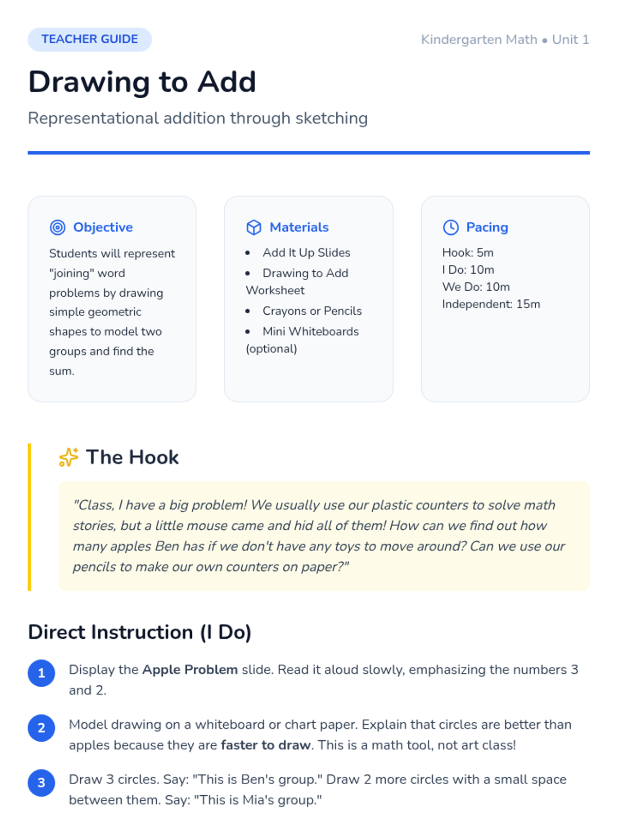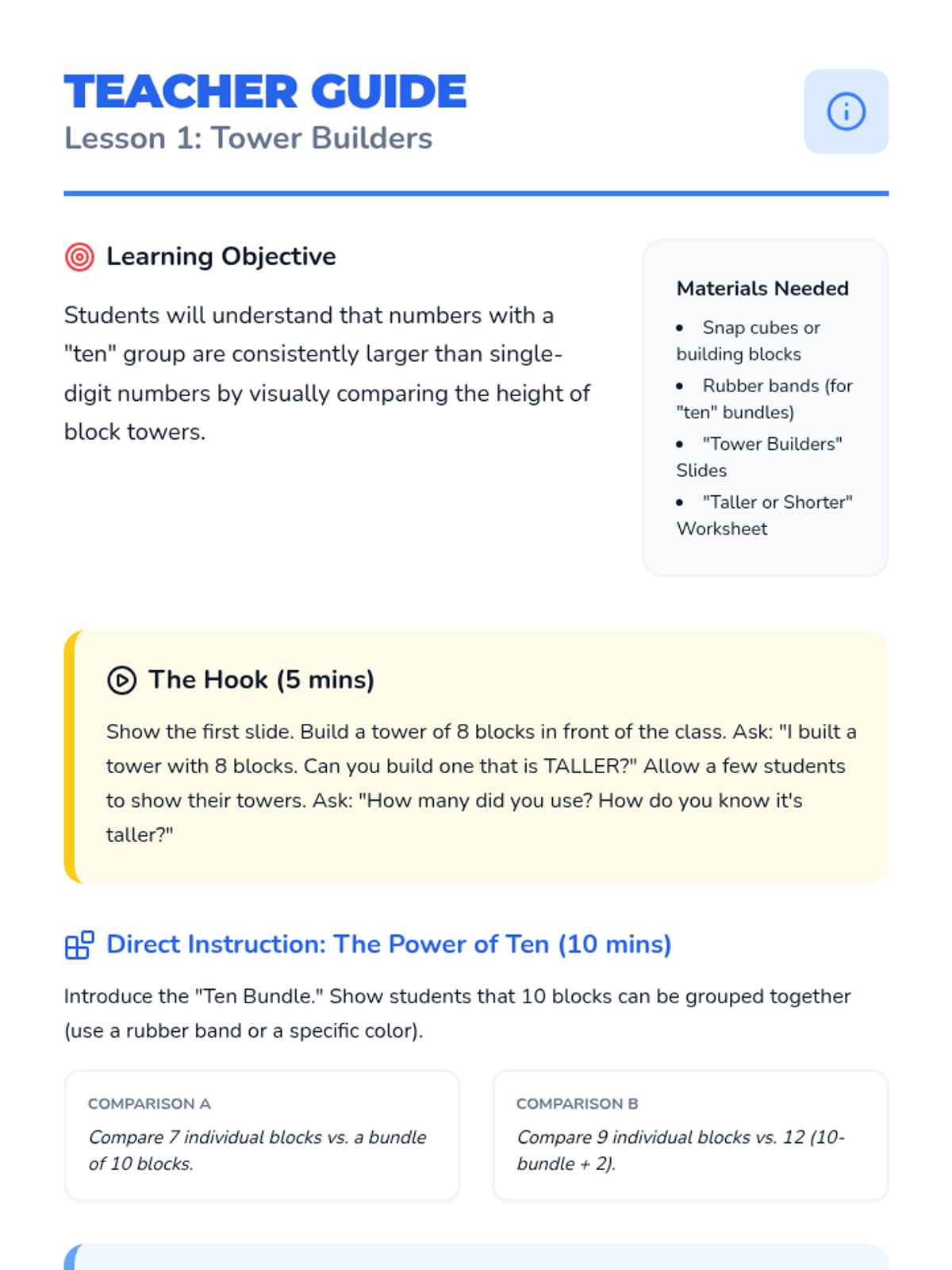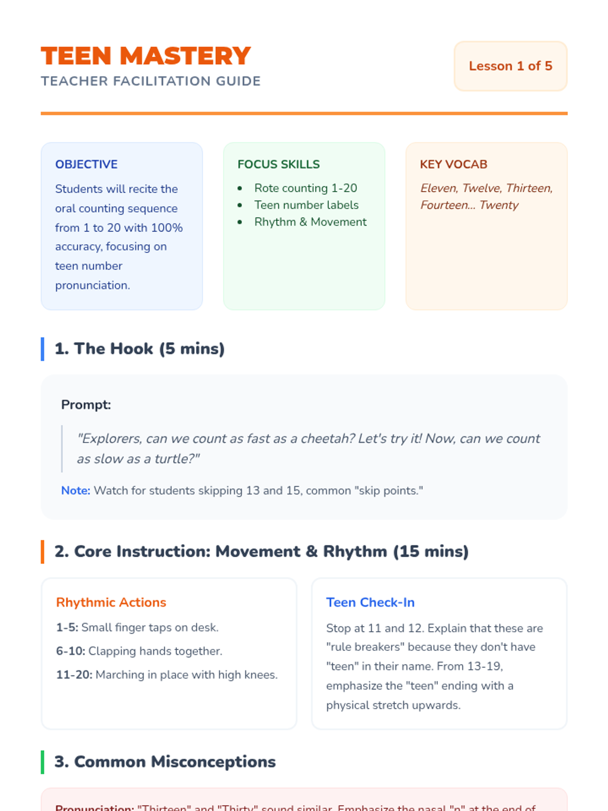 A 12-lesson Tier 2 intervention sequence for Kindergarten focus on K.NBT.A.1. Using the 'Number Hive' theme, students explore teen numbers as 'ten and some more' through concrete manipulatives, visual models, and explicit IM-aligned instructional routines.