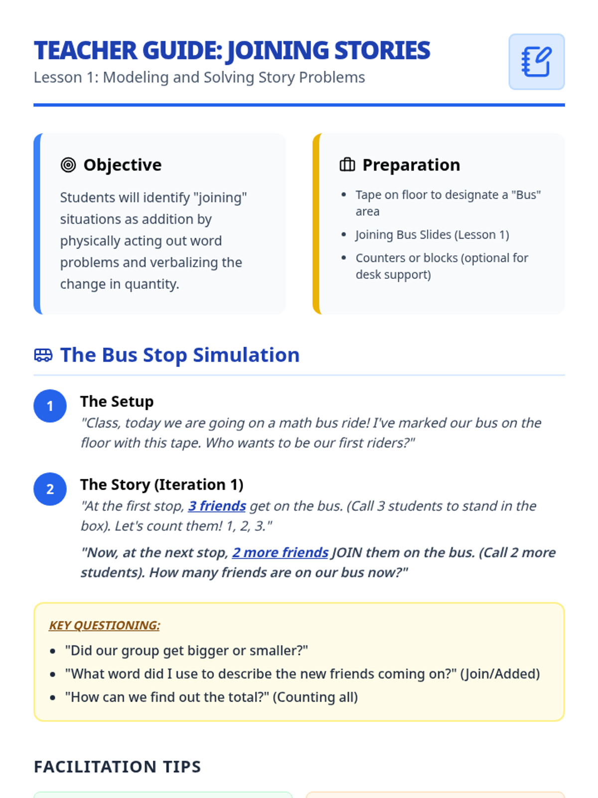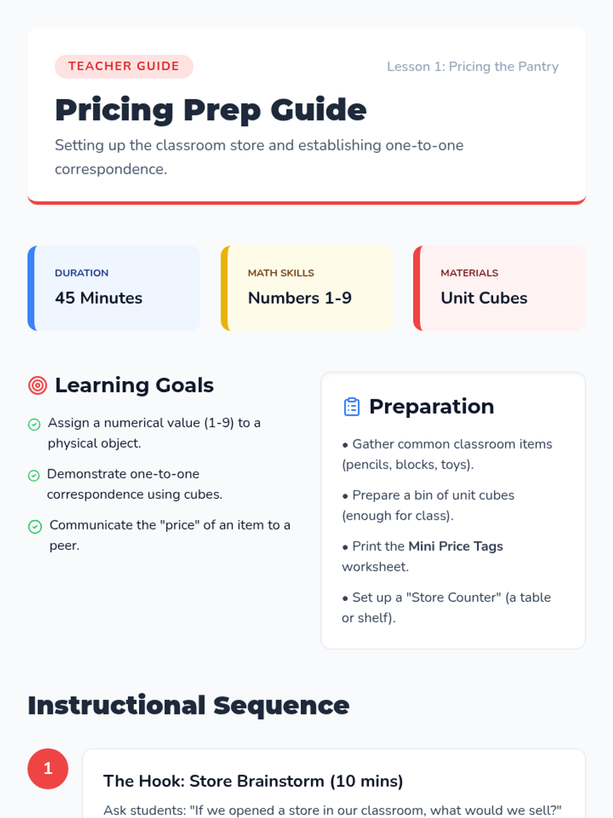 A project-based sequence where Kindergarten students build a classroom store to explore place value and addition. Students progress from basic pricing to making a ten and adding teen numbers through role-play and visual modeling.