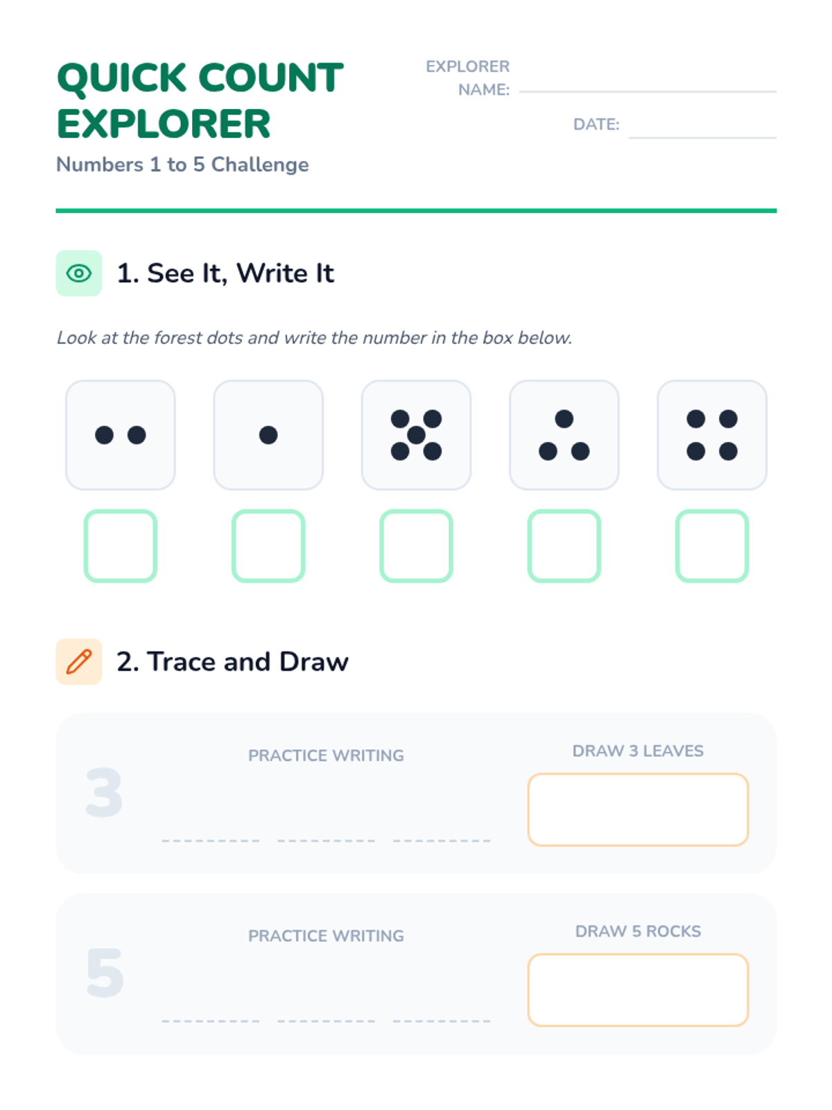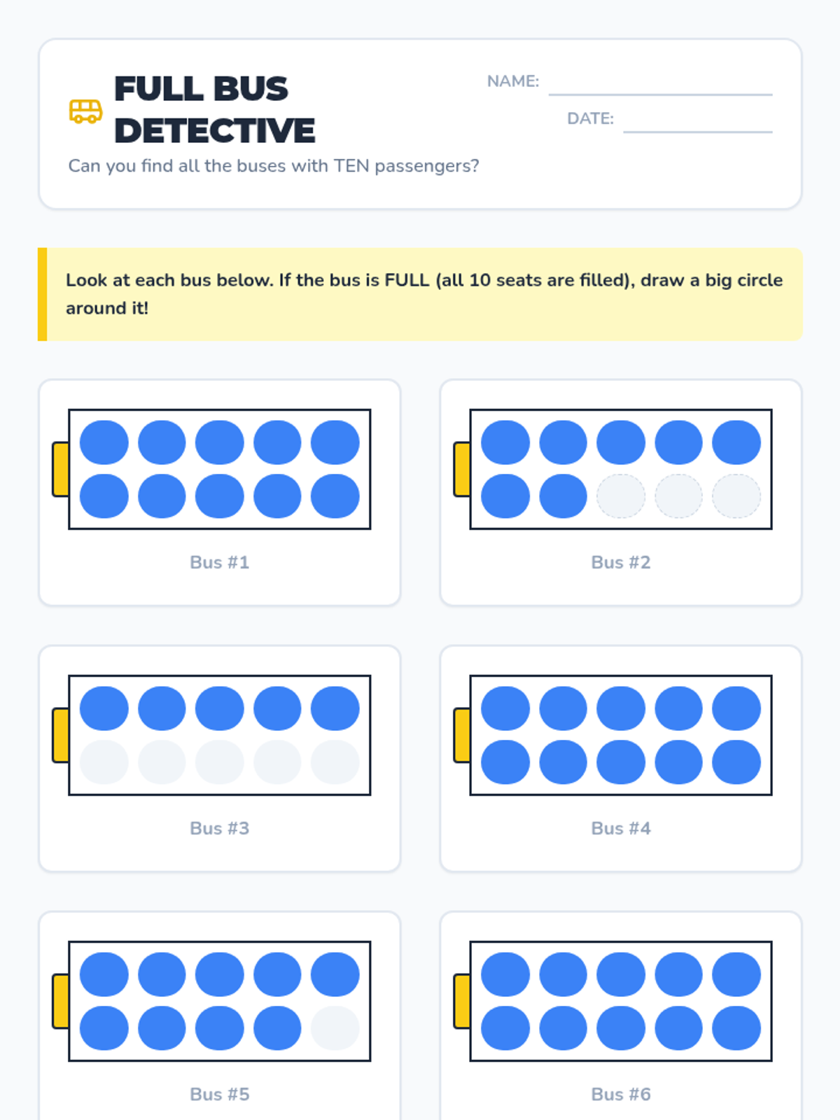 Numbers 0-10Numeral recognition, counting, and cardinality for integers zero through ten. Strengthens one-to-one correspondence and basic number sense through visual sets and tracing.