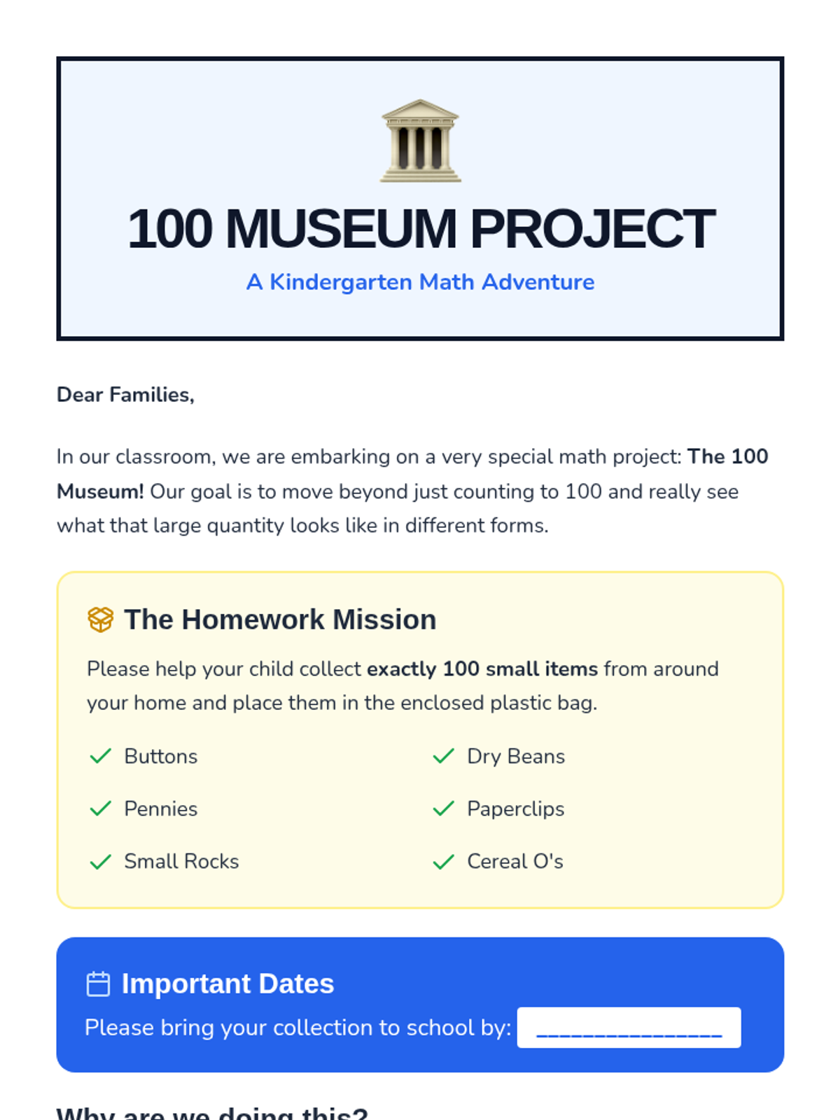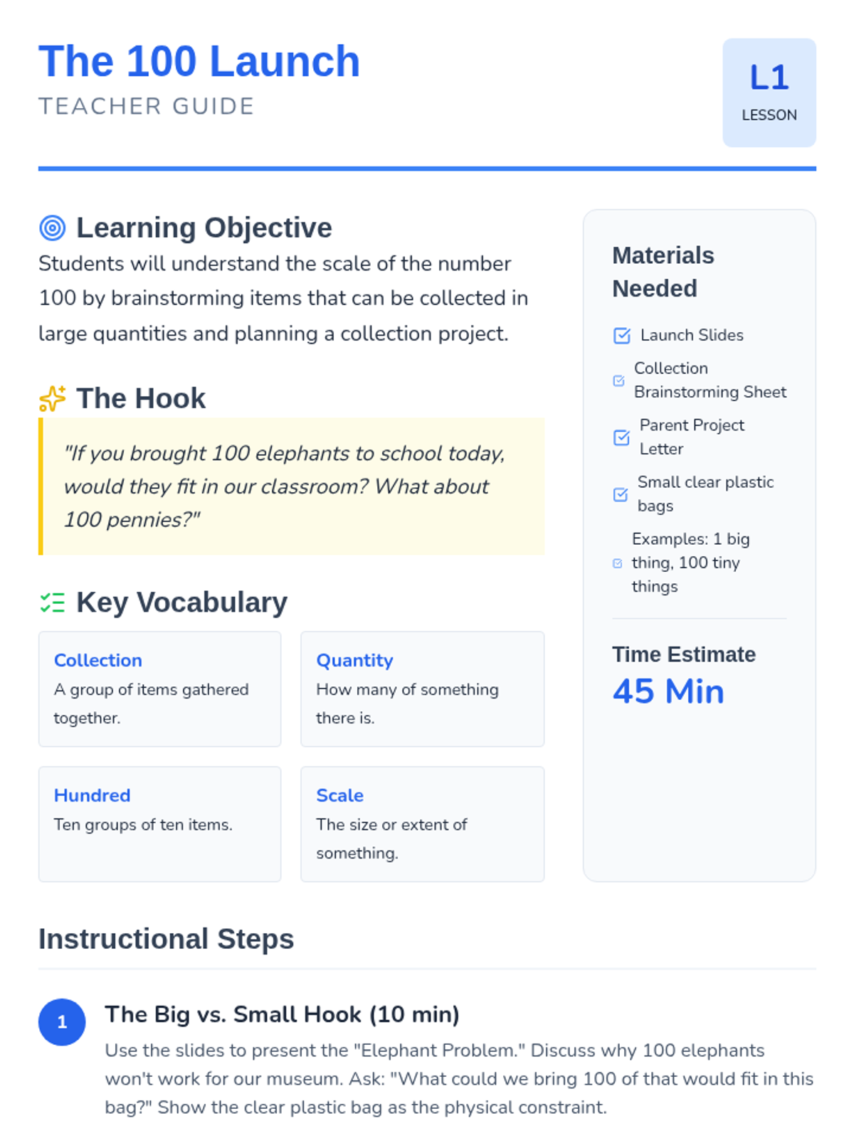 A Kindergarten math sequence centered on the number 100. Students engage in long-term collection and counting projects that culminate in a '100 Museum', moving from abstract counting to tangible quantity visualization.